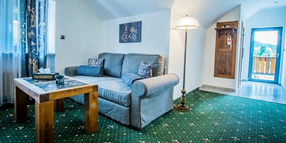 Dwupoziomowy apartament z balkonem i widokiem na góry. Na dole znajduje się salon, na piętrze osobna sypialnia dwuosobowa. Wyposażony w smart TV, Wi-Fi, ekspres do kawy i zestaw do parzenia kawy i herbaty, sejf, minibar (dodatkowo płatny), szlafroki i ręczniki. W łazience połączonej z prywatną sauną znajduje się wanna z hydromasażem, suszarka do włosów, zestaw kosmetyków.