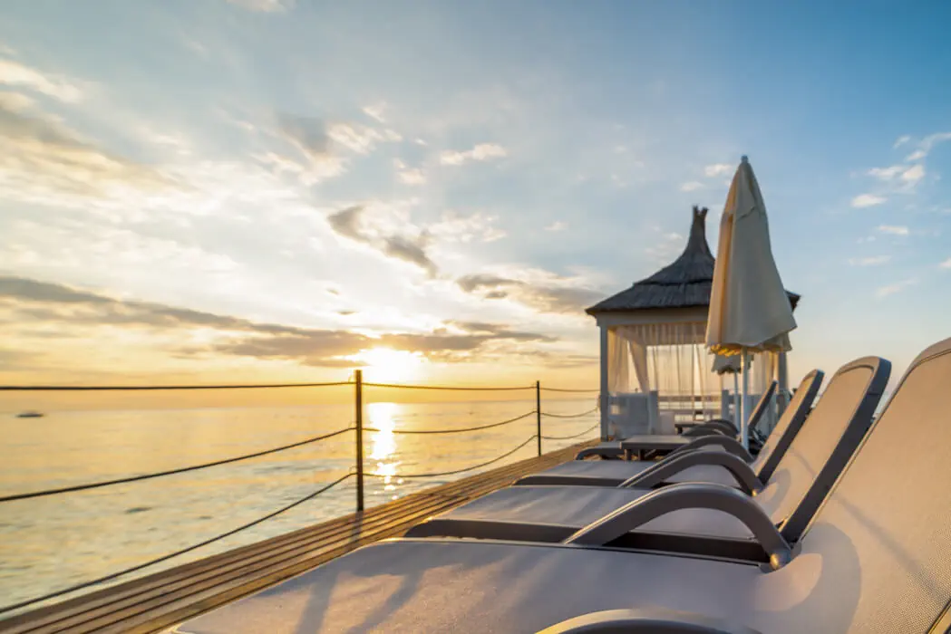 Przy hotelu, prywatna, pomost, piaszczysto-żwirowa.Bezpłatne: parasole, leżaki, ręczniki plażowe, płatne: pawilony.