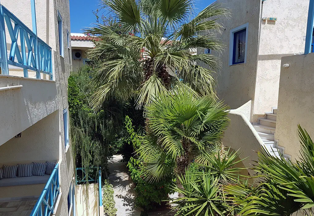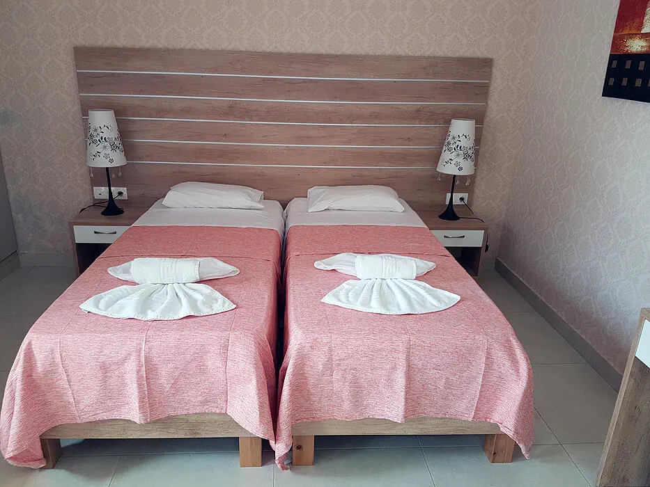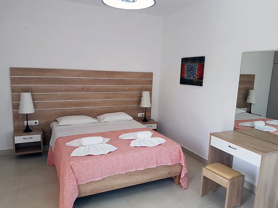 Zlokalizowane są w 2 budynkach: - 2 budynki główne (liczba pięter: 2, liczba wind: 0) Typy pokoi: - STANDARD DOUBLE ROOM dla max. 2 os.: 1 sypialnia, klimatyzacja indywidualna (płatna), sejf (płatny), aneks kuchenny, zestaw do parzenia kawy/herbaty (bezpłatny), łazienka (prysznic, WC), taras - STANDARD TRIPLE ROOM dla max. 3 os.: 1 sypialnia, klimatyzacja indywidualna (płatna), sejf (płatny), aneks kuchenny, zestaw do parzenia kawy/herbaty (bezpłatny), łazienka (prysznic, WC), taras - APARTMENT TRIPLE dla max. 3 os.: 1 sypialnia, klimatyzacja indywidualna (płatna), sejf (płatny), aneks kuchenny, zestaw do parzenia kawy/herbaty (bezpłatny), łazienka (prysznic, WC), taras - APARTMENT QUARDUPLE dla max. 4 os.: 2 sypialnie, drzwi łączące między pokojami, klimatyzacja indywidualna (płatna), sejf (płatny), aneks kuchenny, zestaw do parzenia kawy/herbaty (bezpłatny), łazienka (prysznic, WC), taras