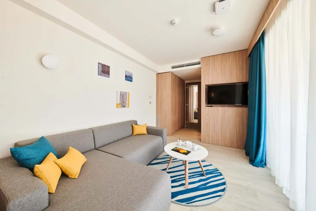 klimatyzacja, sypialnia dla 2 osób, pokój dzienny z rozkładaną sofą dla 2 osób, internet WiFi (w cenie), mini-bar (odpłatnie), sejf (w cenie), telefon (odpłatnie), SAT-TV, suszarka do włosów, łazienka/WC, balkon.