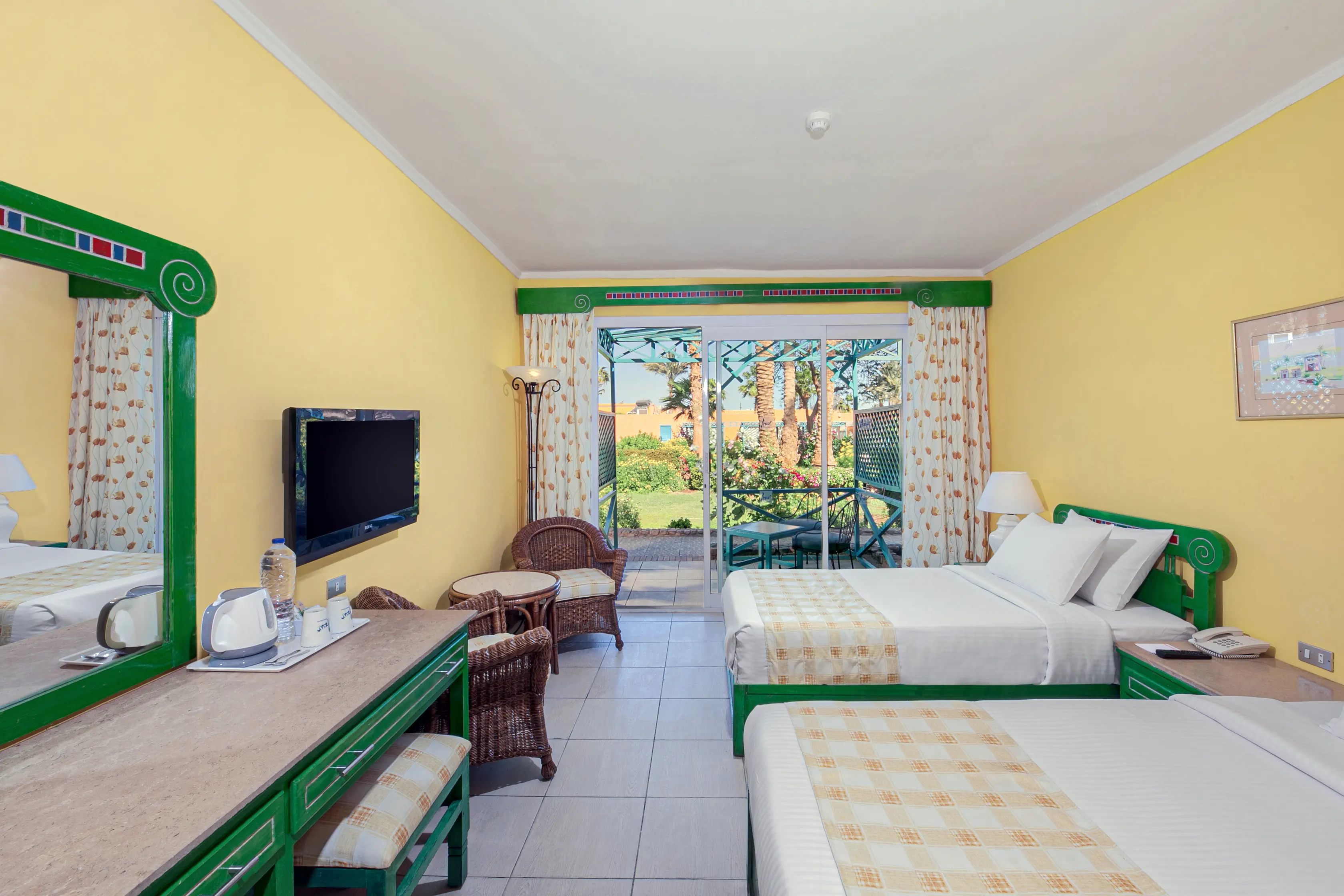 Dla max. 3 osób, Przestrzeń zewnętrzna: Taras, Kanały telewizji: Angielski, Telefon w pokoju, prysznic, wanna i prysznic , Powierzchnia pokoju: ok. 26 m2, Dostawka: łóżko rozkładane, Rodzaj podłogi: płytki, Sprzątanie cykliczne, 1 sypialnia, Maksymalna liczba osób dorosłych: 2, Maksymalna liczba dzieci: 1, Widok na ogród, Liczba łazienek: 1, Liczba toalet: 1, Zestaw do parzenia kawy i herbaty, Klimatyzacja: Klimatyzacja indywidualna
