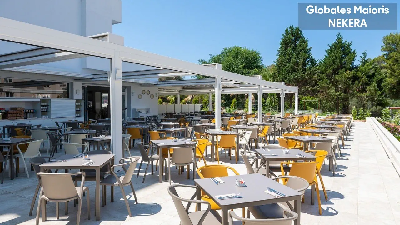 hotel 238 pokoi w trzech 5-piętrowych budynkach. Do dyspozycji Gości: lobby powitalne z recepcją i miejscami do wypoczynk, sala TV, windy, przechowalnia bagażu, restauracja główna, salon-bar. Na zewnątrz znajdują się 2 baseny ze słodką wodą (w tym 1 splash park), taras słoneczny oraz bar z napojami i przekąskami. Leżaki, parasole słoneczne przy basenie w cenie.