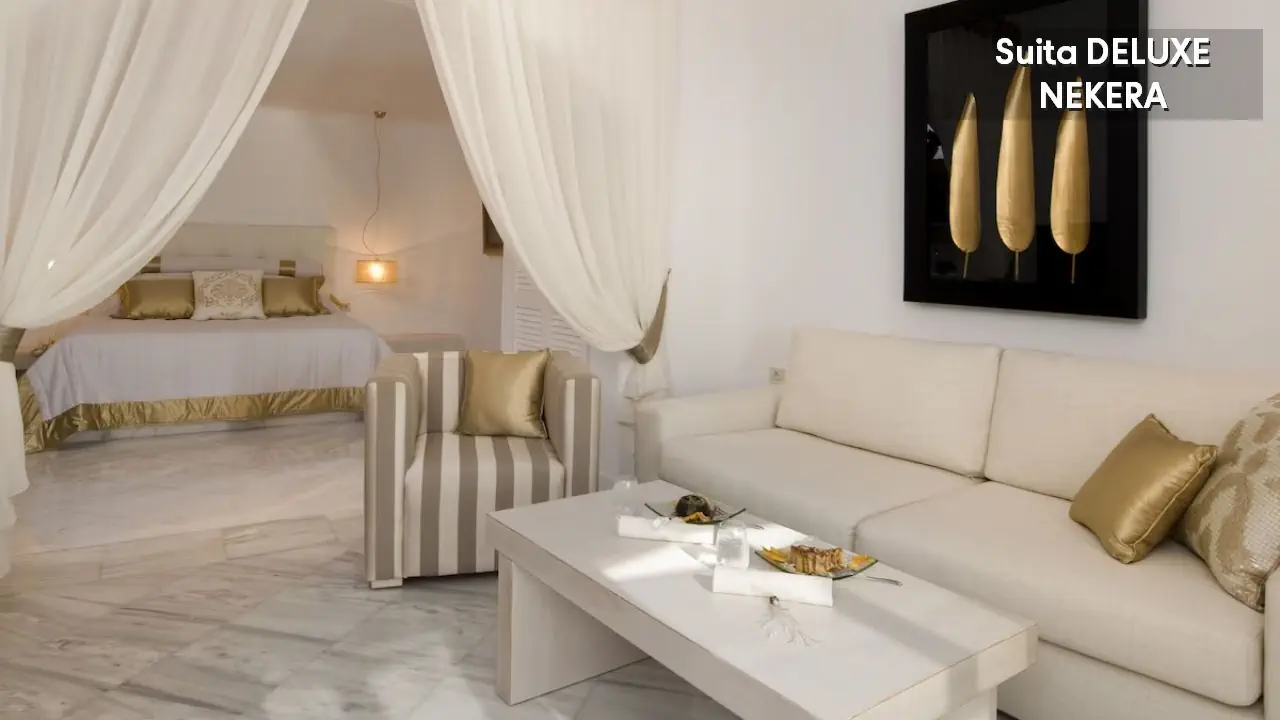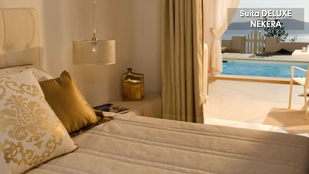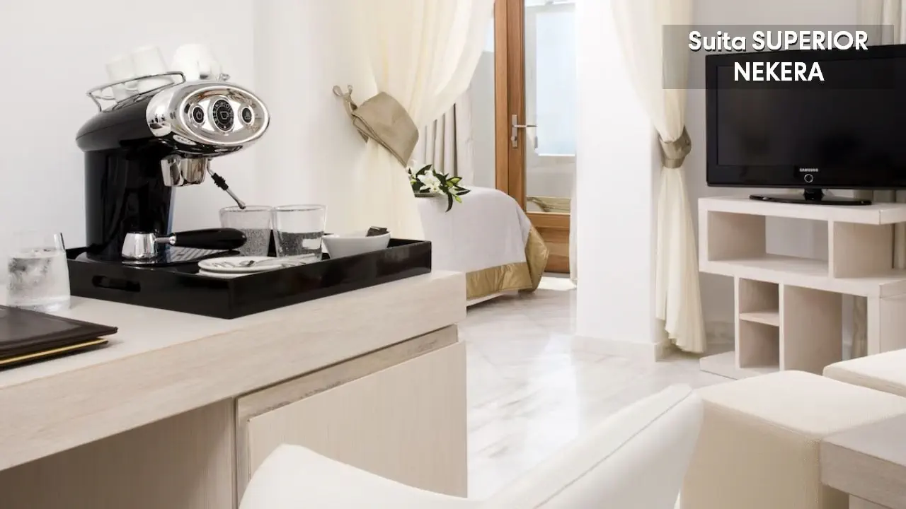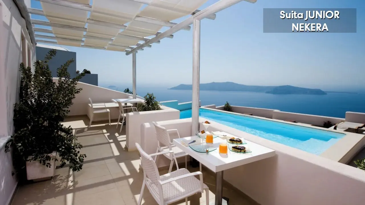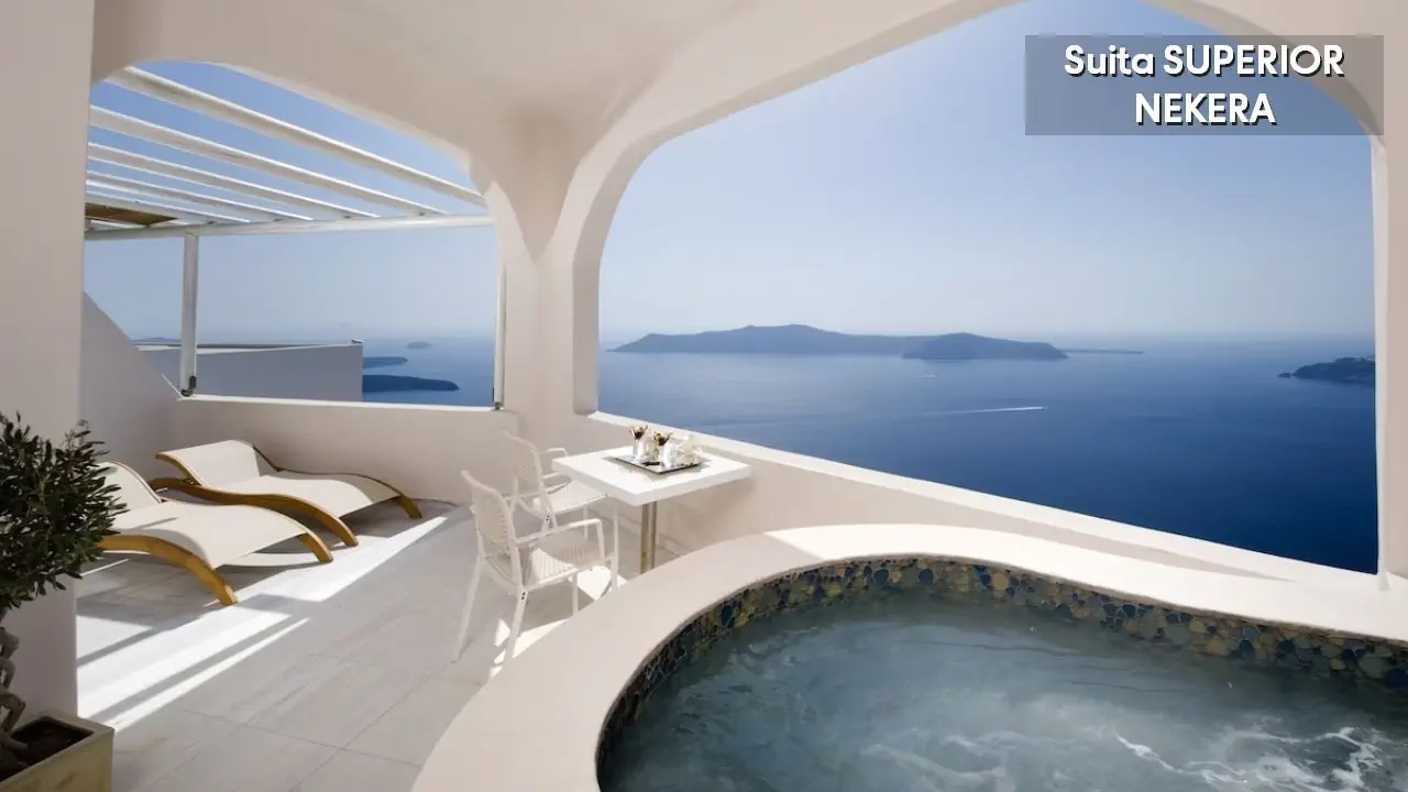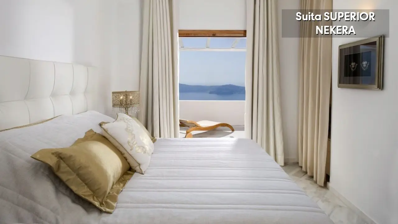 SUITA JUNIOR • ok. 35 m² • maks. 2 osoby dorosłe • łóżko podwójne o rozm. queen-size • klimatyzacja • 32’TV-Sat. • stacja dokująca iPod • telefon (płatny) • sejf • minilodówka • zestaw do pareznia kawy/herbaty • łazienka z prysznicem i deszczownicą • suszarka do włosów • minikosmetyki i kapcie • taras z widokiem na kalderę SUITA SUPERIOR • ok. 45 m² • maks. 3 osoby dorosłe • łóżko podwójne o rozm. queen-size i sofa • wyposażona jak suita JUNIOR • taras z jacuzzi z widokiem na kalderę SUITA DELUXE • ok. 50 m² • maks. 3 osoby dorosłe • łóżko podwójne o rozm. king-size i sofa • wewnętrzne jacuzzi • wyposażona jak suita JUNIOR • taras z prywatnym basenem z widokiem na kalderę