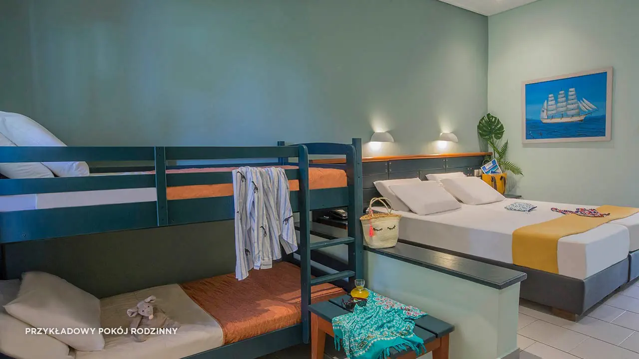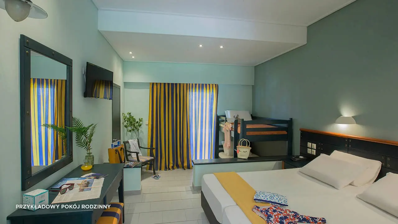 Standard• 2-3 os. (ok. 21 m2)• dostawka dla 3. osoby• klimatyzacja indywidualna (bezpłatna)• TV-SAT• mini lodówka• sejf (bezpłatny)• Wi-Fi (bezpłatne)• łazienka- wanna/prysznic, suszarka• balkon lub tarasStandard z częściowym widokiem na morze• 2-3 os. (ok. 21 m2)• dostawka dla 3. osoby• wyposażony jak pokój standardRodzinny 2-3 os.• 2-3 os. (ok. 21-25 m2)• dostawka dla 3. osoby• dostawką jest łóżko piętowe • wyposażony jak pokój standardRodzinny 4-os.• 2-4 os. (ok. 21-25 m2)• możliwe obłożenie 2+2 (dostawka dla 3. i 4. os. wyłącznie dla dzieci do 12 lat) lub 3+1 (dostawka dla 4. os. wyłącznie dla dziecka do 12 lat)• dostawką jest łóżko piętowe • wyposażony jak pokój standard