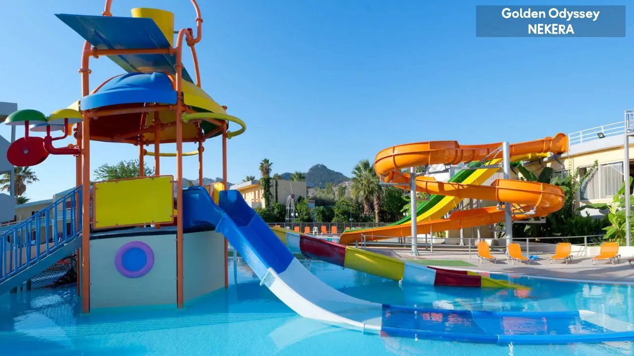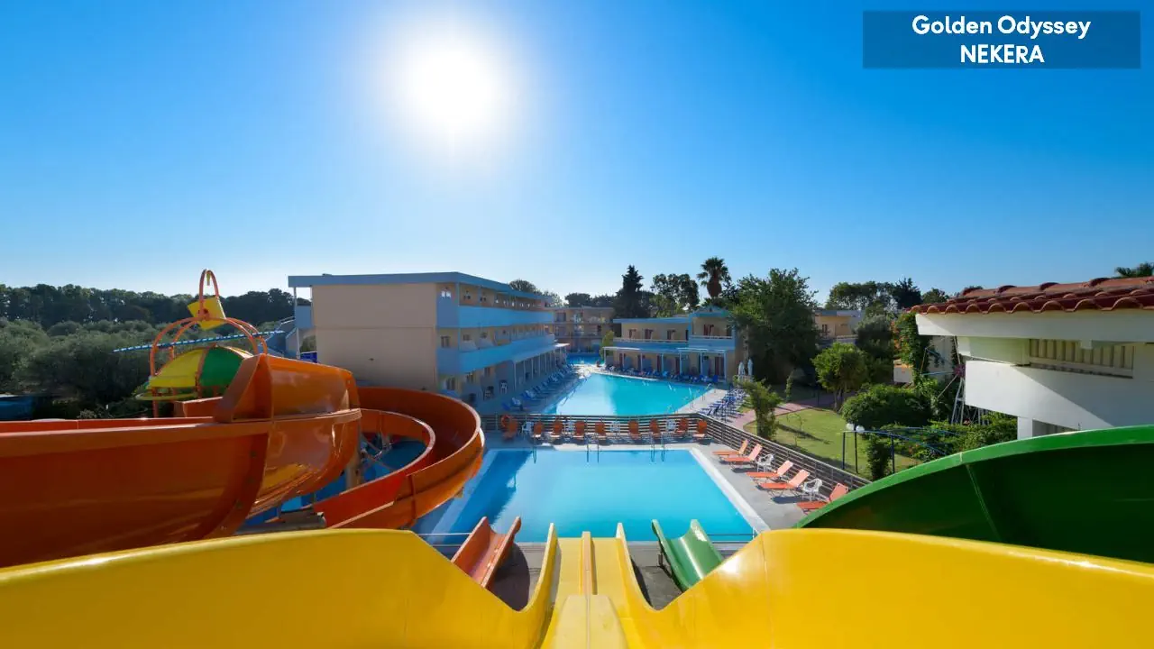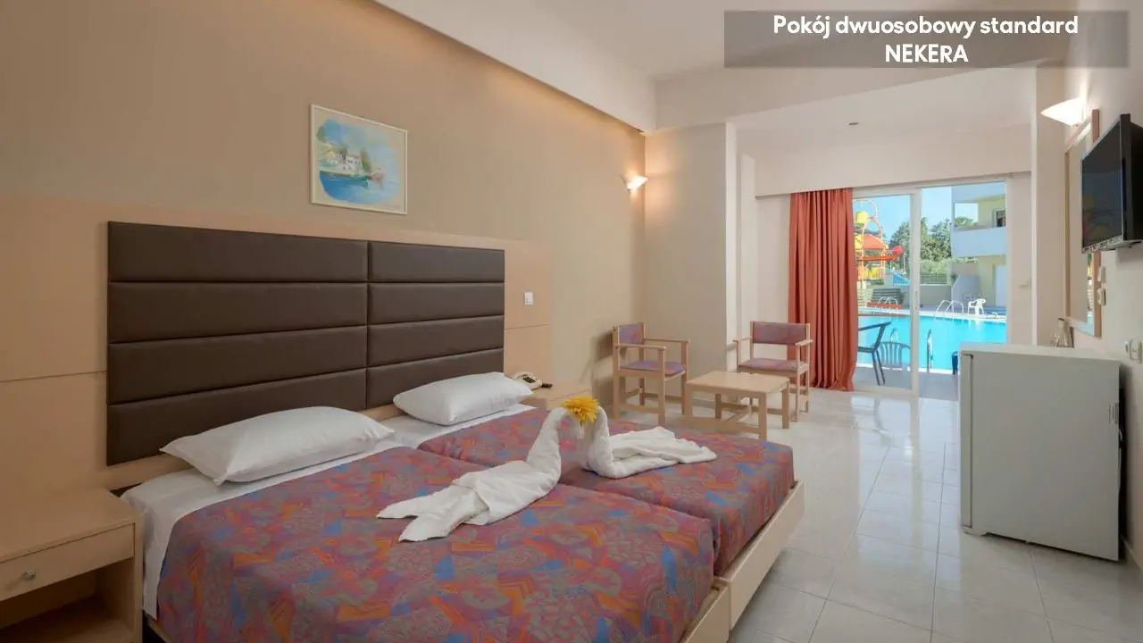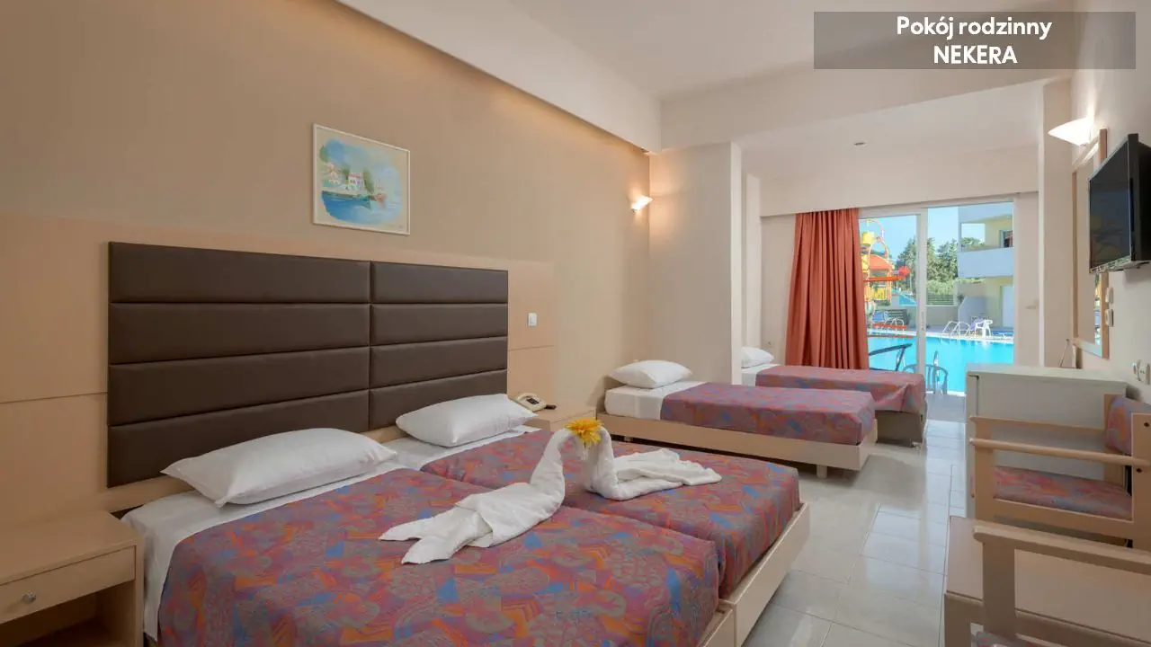 czterogwiazdkowy hotel doskonały na wakacje dla rodzin z dziećmi, częściowo odnowiony w 2018 roku, oferuje 153 pokoje zlokalizowane w kompleksie 8 budynków. Do dyspozycji Gości: recepcja 24h; lobby; restauracja, bar przy basenie, bar główny, klimatyzacja, TV; strefa basenowa: cztery baseny zewnętrzne, jeden basen zewnętrzny dla dzieci, liczne nowe zjeżdżalnie (niektóre tylko dla dorosłych), miniaquapark dla najmłodszych, taras słoneczny, leżaki i parasole słoneczne: w cenie. Za dodatkową opłatą: minimarket, kantor, wypożyczalnia samochodów, kącik internetowy.