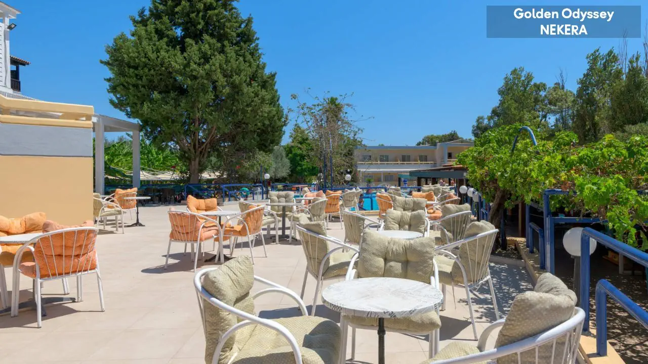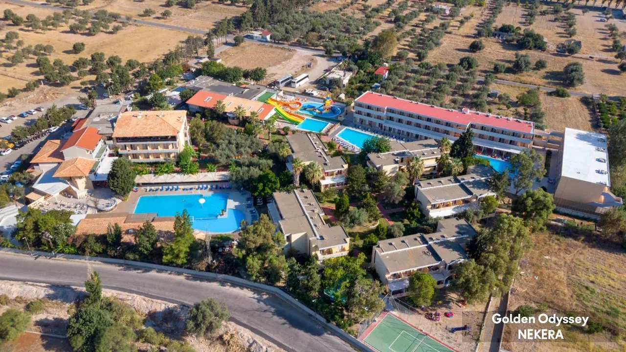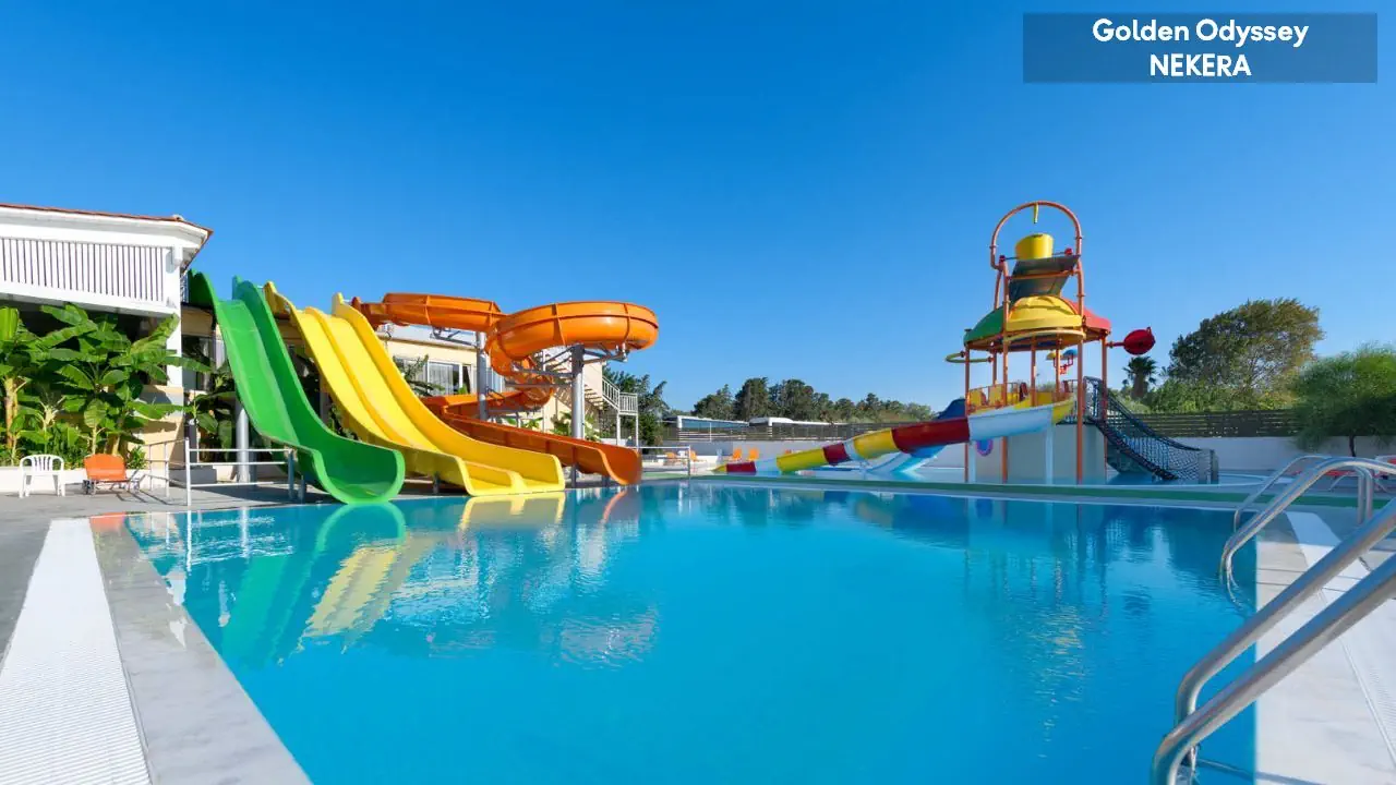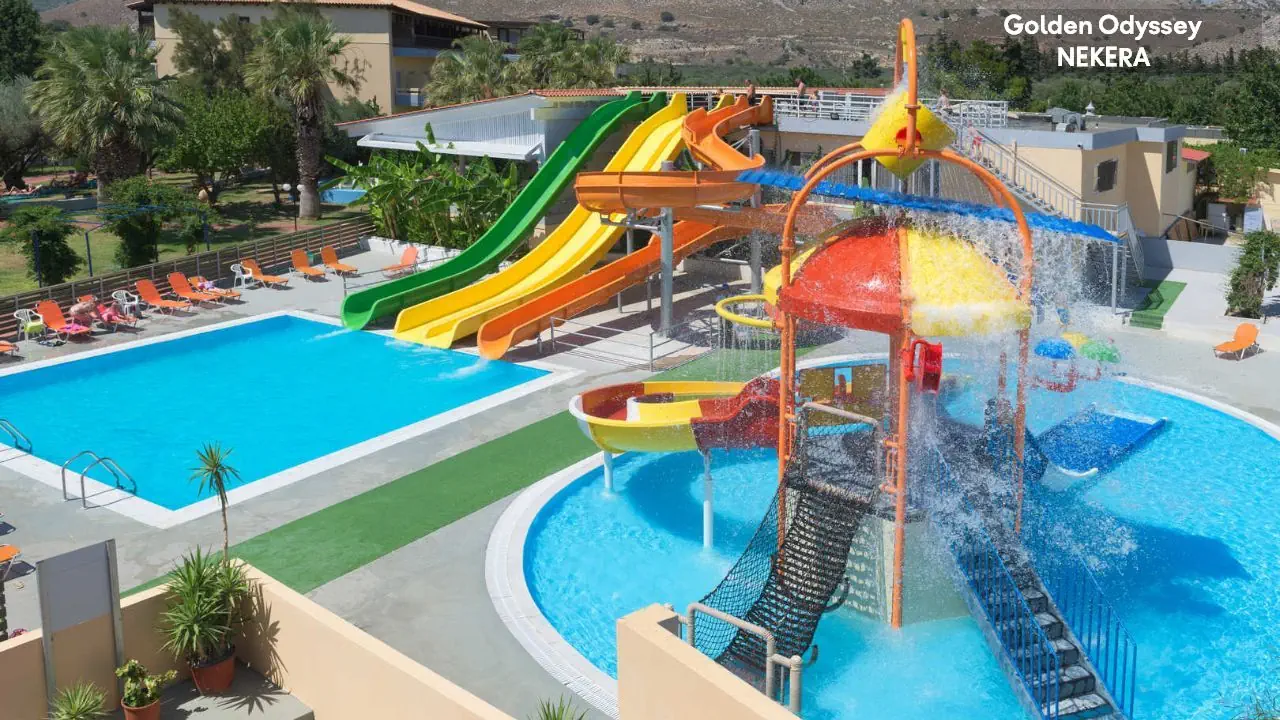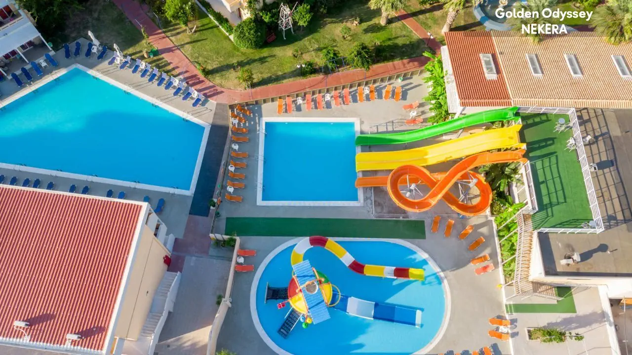 czterogwiazdkowy hotel doskonały na wakacje dla rodzin z dziećmi, częściowo odnowiony w 2018 roku, oferuje 153 pokoje zlokalizowane w kompleksie 8 budynków. Do dyspozycji Gości: recepcja 24h; lobby; restauracja, bar przy basenie, bar główny, klimatyzacja, TV; strefa basenowa: cztery baseny zewnętrzne, jeden basen zewnętrzny dla dzieci, liczne nowe zjeżdżalnie (niektóre tylko dla dorosłych), miniaquapark dla najmłodszych, taras słoneczny, leżaki i parasole słoneczne: w cenie. Za dodatkową opłatą: minimarket, kantor, wypożyczalnia samochodów, kącik internetowy.