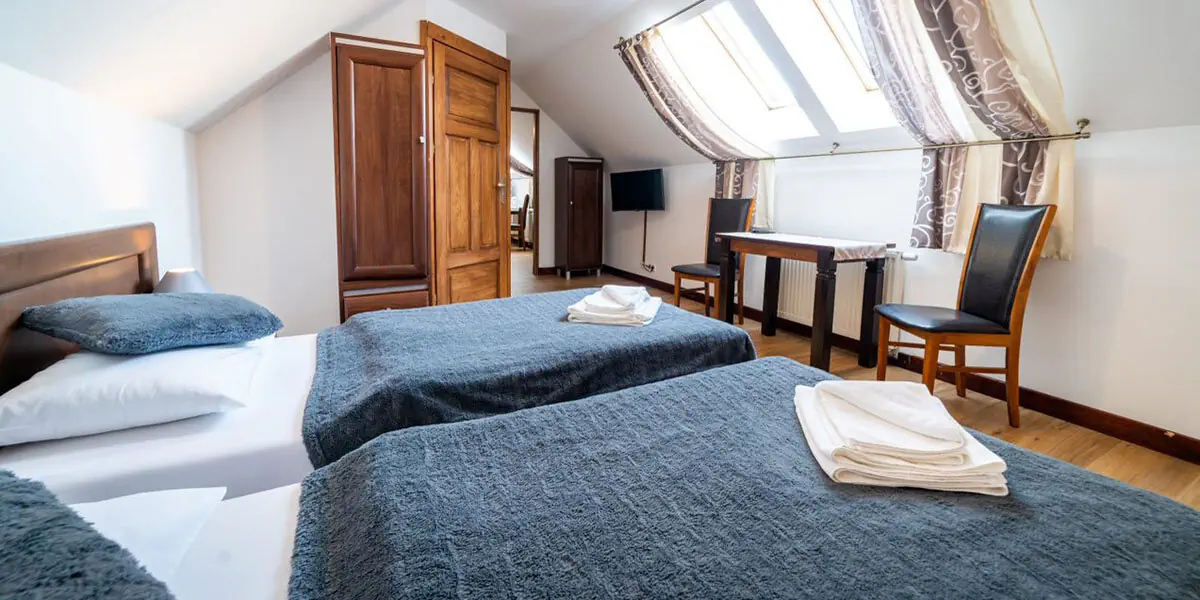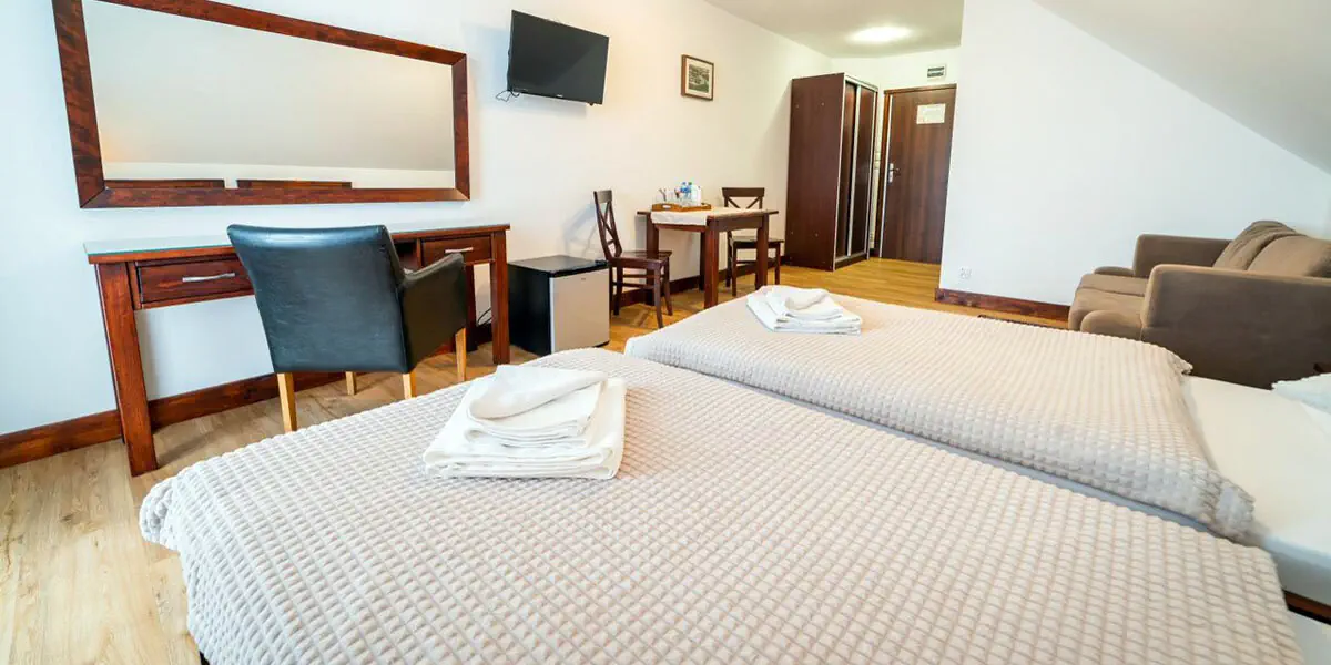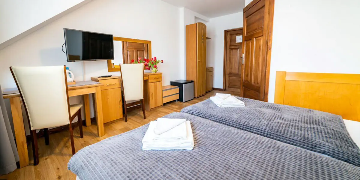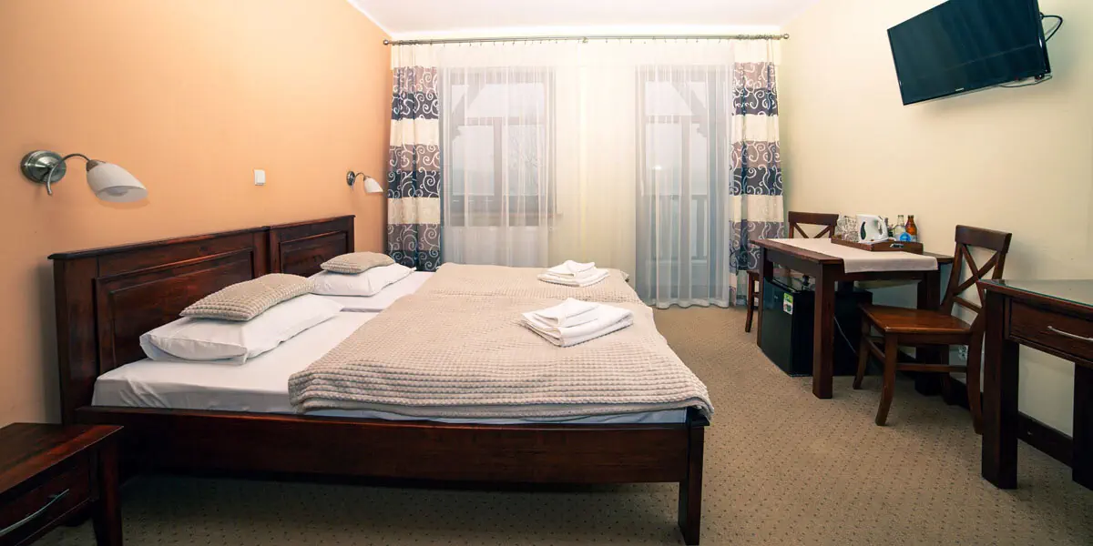Pokój ekonomiczny o powierzchni ok 17 m2. W wyposażeniu pokoju znajduje się łazienka z prysznicem, telewizor z płaskim ekranem, suszarka do włosów, lodówka, zestaw do parzenia kawy i herbaty, czajnik elektryczny, woda mineralna dostarczana codziennie, komplet ręczników, zestaw jednorazowych kosmetyków