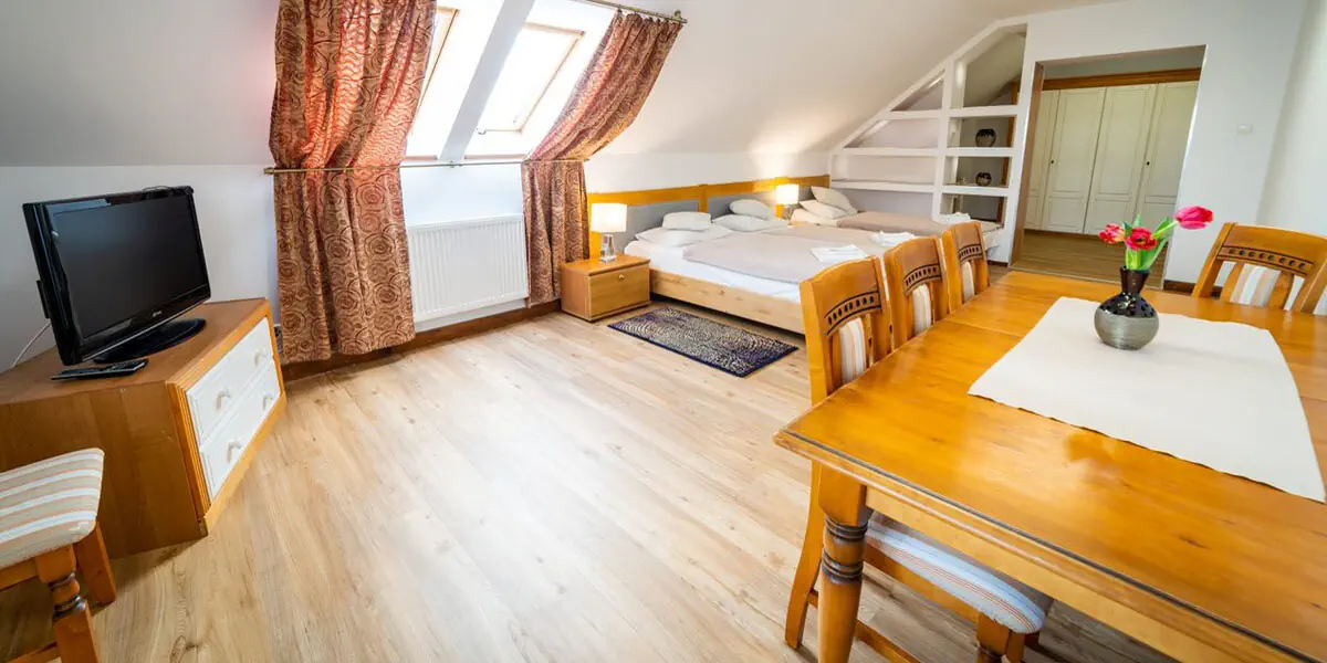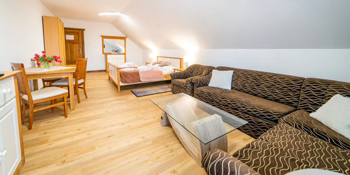 Pokój typu studio z sypialnią i pokojem dziennym o łącznej powierzchni ok. 41 m2. W pokoju dziennym znajduje się rozkładana 2-osobowa sofa, którą można wykorzystać jako dwuosobową dostawkę. W wyposażeniu pokoju znajduje się łazienka, telewizor z płaskim ekranem, suszarka do włosów, lodówka, zestaw do parzenia kawy i herbaty, czajnik elektryczny, woda mineralna dostarczana codziennie, zestaw jednorazowych kosmetyków, komplet ręczników