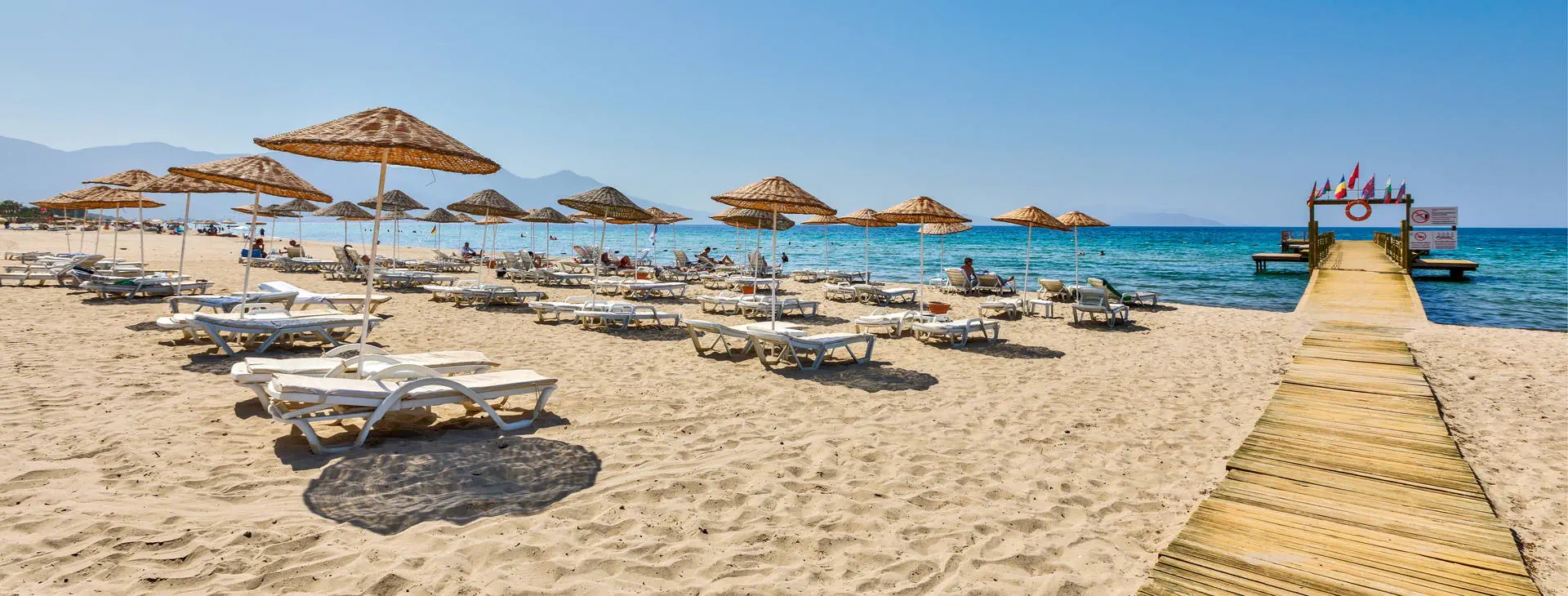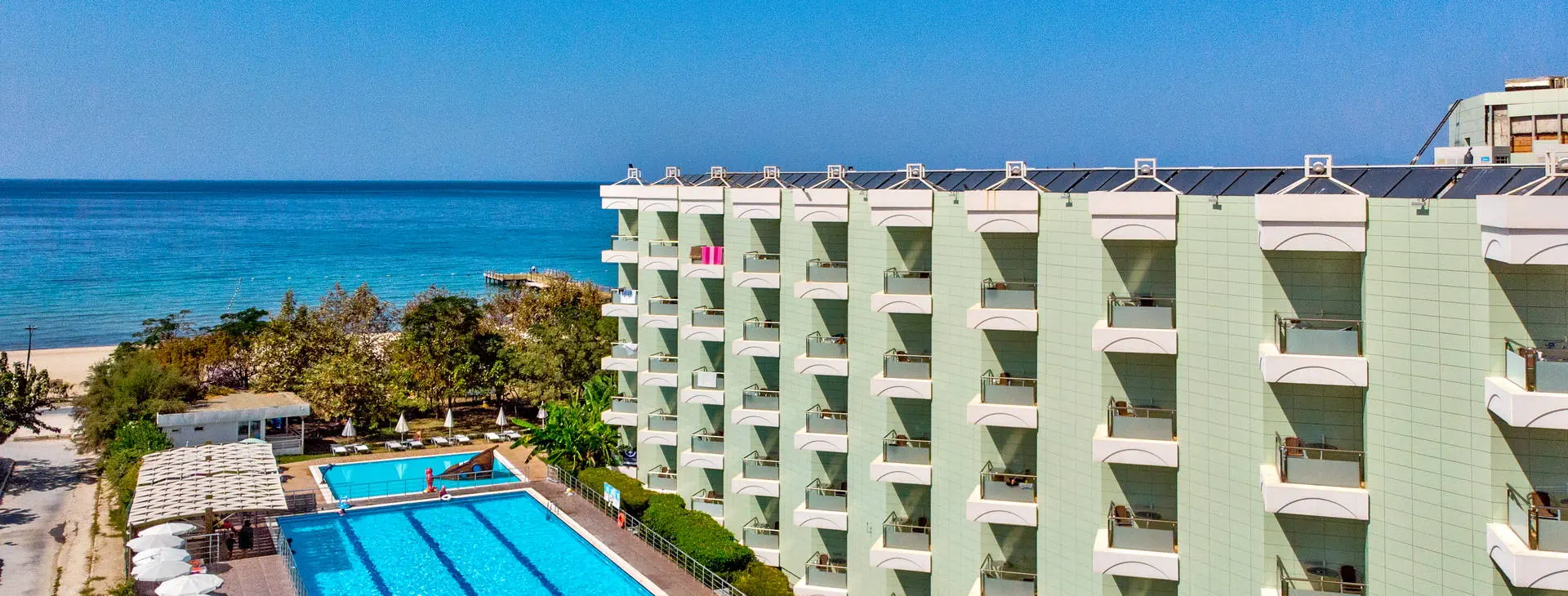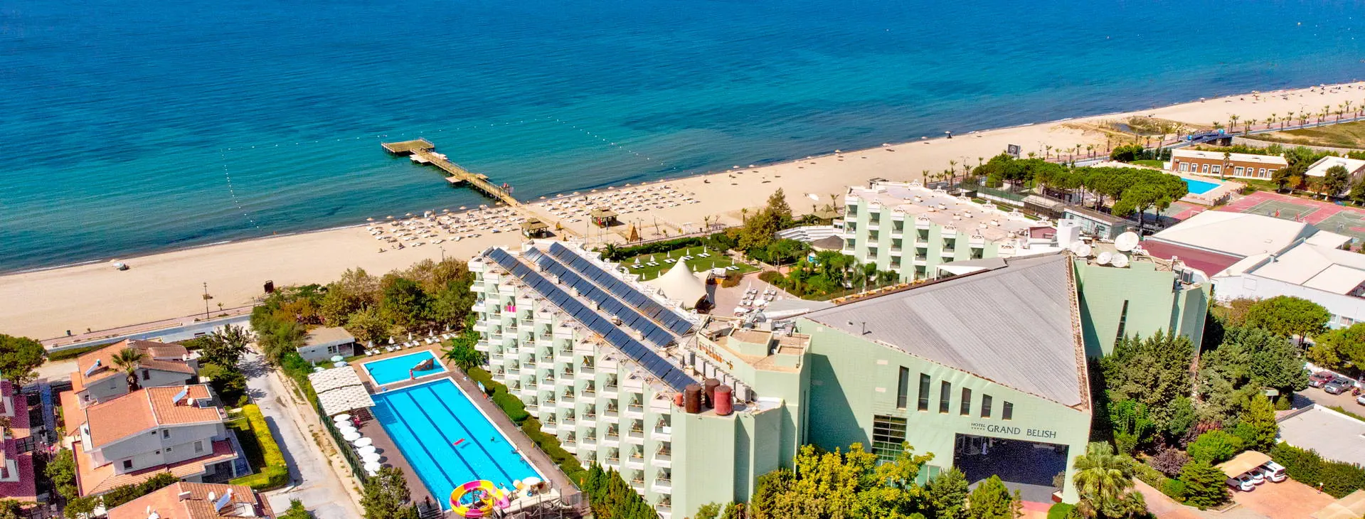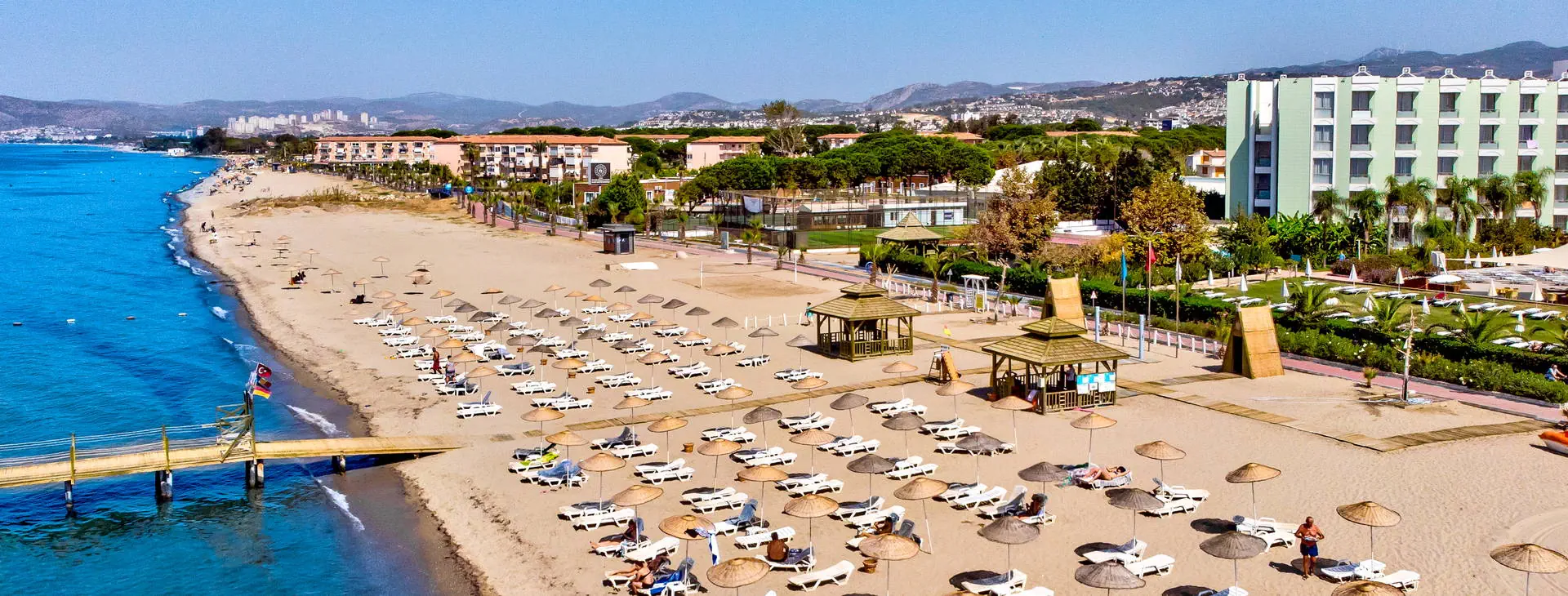 Położenie: Nowoczesny, pięciogwiazdkowy hotel położony w cichej i malowniczej okolicy, w miejscowości Davutlar, ok. 12 km od centrum Kusadasi z licznymi sklepami, restauracjami i barami. W pobliżu hotelu znajduje się przystanek komunikacji miejskiej. Do lotniska w Bodrum ok.120 km. Plaża: Hotel usytuowany przy pięknej, szerokiej i piaszczystej plaży z łagodnym wejściem do morza. Przejście do plaży przez promenadę. Leżaki i parasole na plaży dostępne są bezpłatnie, ręczniki (wymagany dezpozyt). Do dyspozycji gości: Recepcja 24 h, przestronne lobby, 2 windy, restauracja główna, restauracja a la carte (dostępna bezpłatnie raz na pobyt, wymagana rezerwacja), 4 bary m.in.: bar przy basenie, bar w lobby, disco bar (dodatkowo płatny). Ponadto 4 baseny: basen główny, basen ze zjeżdżalniami, basen dla dzieci oraz basen kryty. Taras słoneczny przy basenie z bezpłatnymi leżakami i parasolami. ręczniki (wymagany depozyt). Za dodatkową opłatą: fryzjer, opiekunka dla dziecka, pralnia, opieka medyczna, fotograf, wypożyczalnia samochodów. Wyżywienie: All Inclusive: śniadanie (07-00-10:30), lunch (12:30-14:30) i obiadokolacja (19:30-21:30) w formie bufetu w restauracji głównej, bufet dla dzieci (19:30-21:30). Ponadto w ciągu dnia przekąski (12:00-17:00) w barze przy basenie, kawa (17:00-18:00) i lody (16:00-17:00) oraz nocne przekąski (00:00-01:00). Lokalne napoje bezalkoholowe i alkoholowe dostępne są w godzinach (10:00-24:00) w wyznaczonych barach. Obiadokolacja w restauracji a’la carte po uprzedniej rezerwacji (19.30-21:30). Za opłatą: pozostałe napoje importowane, świeżo wyciskane soki, kawa po turecku, konsumpcja nocna. Program sportowy i animacyjny: Codzienny program animacyjny oraz wieczorne show i okazjonalnie muzyka na żywo. Ponadto na terenie obiektu m. in. korty tenisowe, tenis stołowy, rzutki, bilard, siatkówka, sauna, łaźnia turecka, fitness. Dla dzieci: mini klub, mini disco oraz plac zabaw. Za dodatkową opłatą: oświetlenie kortu tenisowego, sporty wodne, zabiegi kosmetyczne i masaże w centrum SPA. Internet: Bezpłatny Internet Wi-Fi w hotelowym lobby oraz w pokojach. Kategoria lokalna: ***** Strona www: