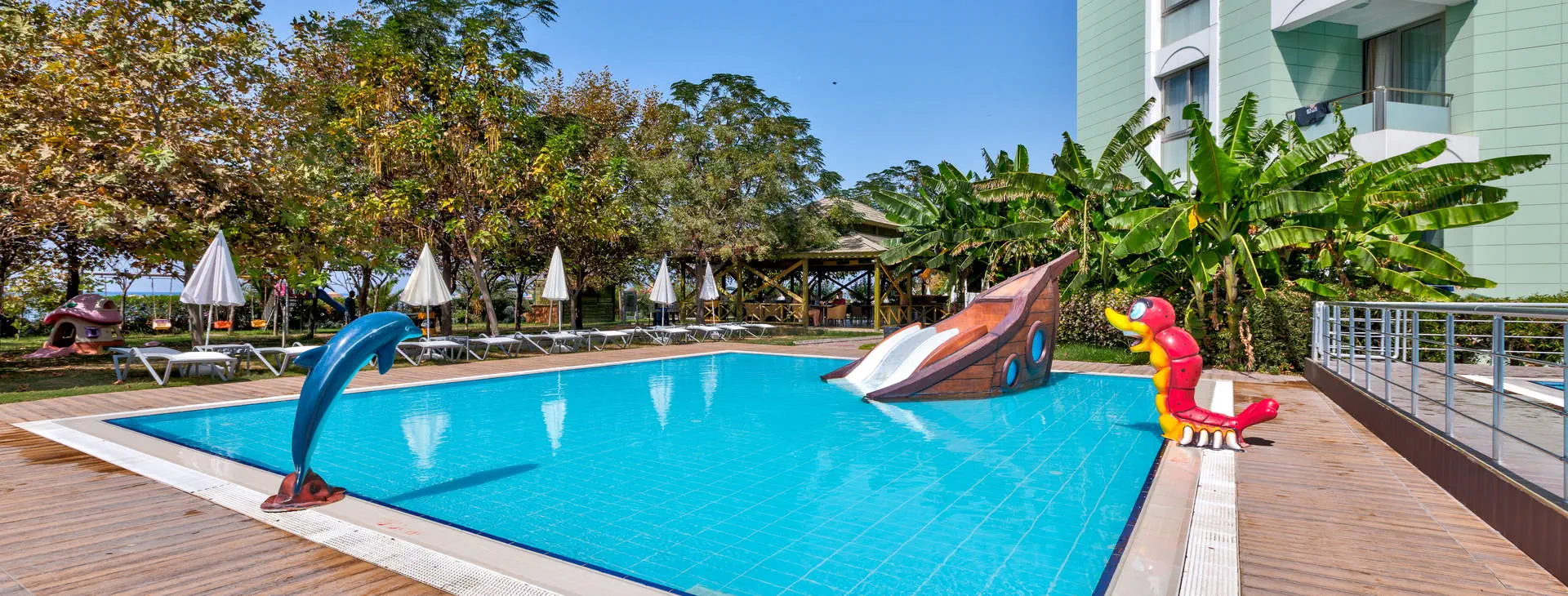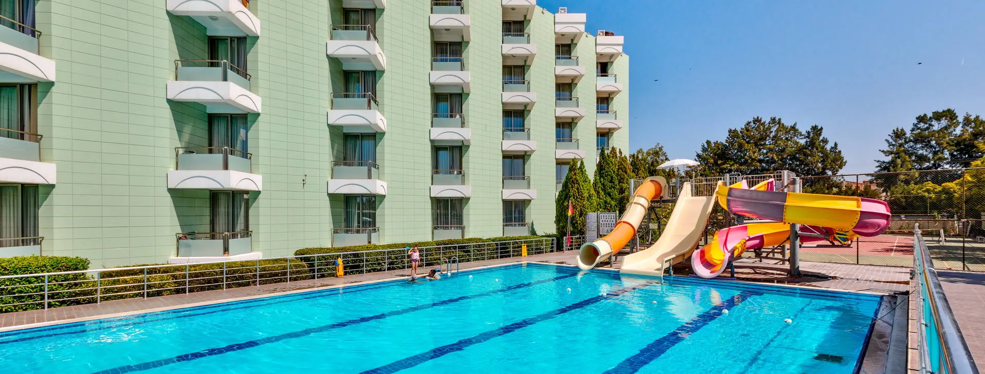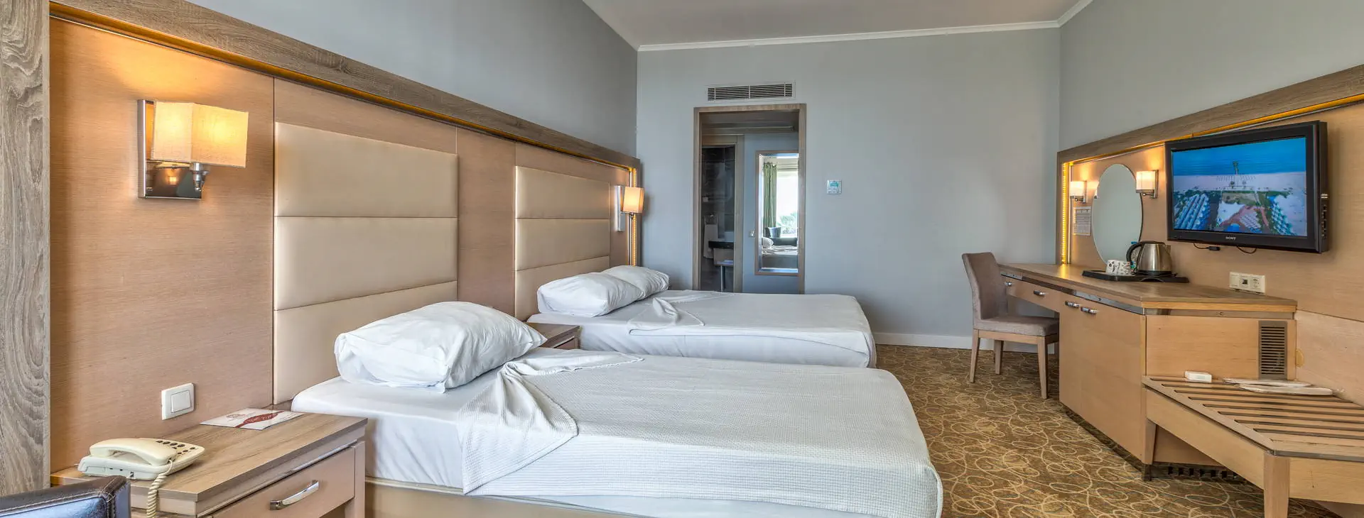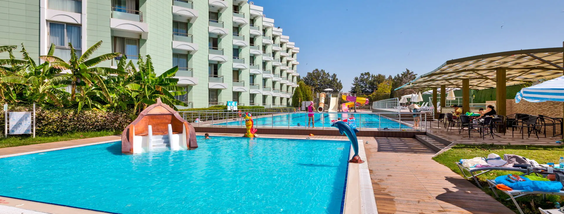 Położenie: Nowoczesny, pięciogwiazdkowy hotel położony w cichej i malowniczej okolicy, w miejscowości Davutlar, ok. 12 km od centrum Kusadasi z licznymi sklepami, restauracjami i barami. W pobliżu hotelu znajduje się przystanek komunikacji miejskiej. Do lotniska w Bodrum ok.120 km. Plaża: Hotel usytuowany przy pięknej, szerokiej i piaszczystej plaży z łagodnym wejściem do morza. Przejście do plaży przez promenadę. Leżaki i parasole na plaży dostępne są bezpłatnie, ręczniki (wymagany dezpozyt). Do dyspozycji gości: Recepcja 24 h, przestronne lobby, 2 windy, restauracja główna, restauracja a la carte (dostępna bezpłatnie raz na pobyt, wymagana rezerwacja), 4 bary m.in.: bar przy basenie, bar w lobby, disco bar (dodatkowo płatny). Ponadto 4 baseny: basen główny, basen ze zjeżdżalniami, basen dla dzieci oraz basen kryty. Taras słoneczny przy basenie z bezpłatnymi leżakami i parasolami. ręczniki (wymagany depozyt). Za dodatkową opłatą: fryzjer, opiekunka dla dziecka, pralnia, opieka medyczna, fotograf, wypożyczalnia samochodów. Wyżywienie: All Inclusive: śniadanie (07-00-10:30), lunch (12:30-14:30) i obiadokolacja (19:30-21:30) w formie bufetu w restauracji głównej, bufet dla dzieci (19:30-21:30). Ponadto w ciągu dnia przekąski (12:00-17:00) w barze przy basenie, kawa (17:00-18:00) i lody (16:00-17:00) oraz nocne przekąski (00:00-01:00). Lokalne napoje bezalkoholowe i alkoholowe dostępne są w godzinach (10:00-24:00) w wyznaczonych barach. Obiadokolacja w restauracji a’la carte po uprzedniej rezerwacji (19.30-21:30). Za opłatą: pozostałe napoje importowane, świeżo wyciskane soki, kawa po turecku, konsumpcja nocna. Program sportowy i animacyjny: Codzienny program animacyjny oraz wieczorne show i okazjonalnie muzyka na żywo. Ponadto na terenie obiektu m. in. korty tenisowe, tenis stołowy, rzutki, bilard, siatkówka, sauna, łaźnia turecka, fitness. Dla dzieci: mini klub, mini disco oraz plac zabaw. Za dodatkową opłatą: oświetlenie kortu tenisowego, sporty wodne, zabiegi kosmetyczne i masaże w centrum SPA. Internet: Bezpłatny Internet Wi-Fi w hotelowym lobby oraz w pokojach. Kategoria lokalna: ***** Strona www: