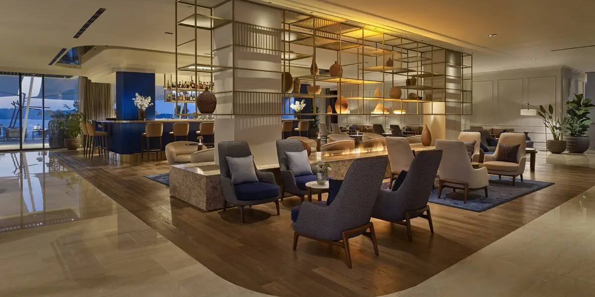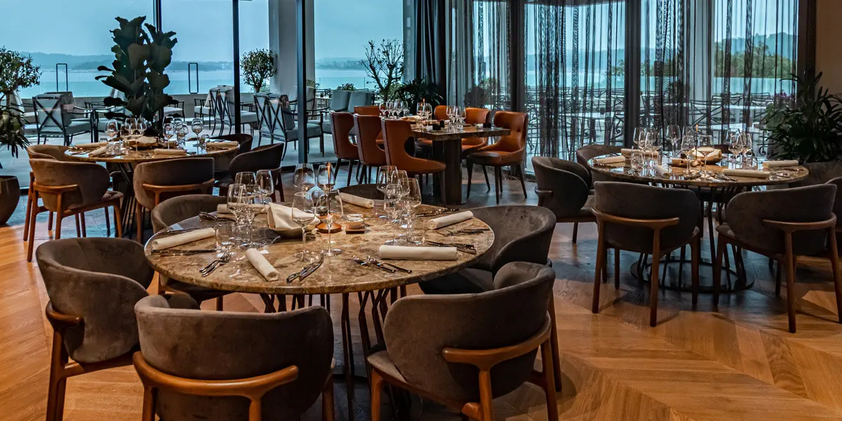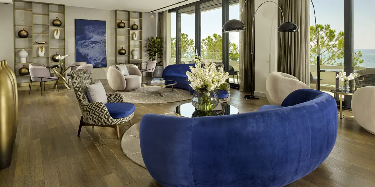 Luksusowy apartament (52 m2) z przestronnym pokojem dziennym, sypialnią, panoramicznymi oknami, wygodami, inteligentnym sterowaniem, łazienką i balkonem wychodzącym na zatokę morską