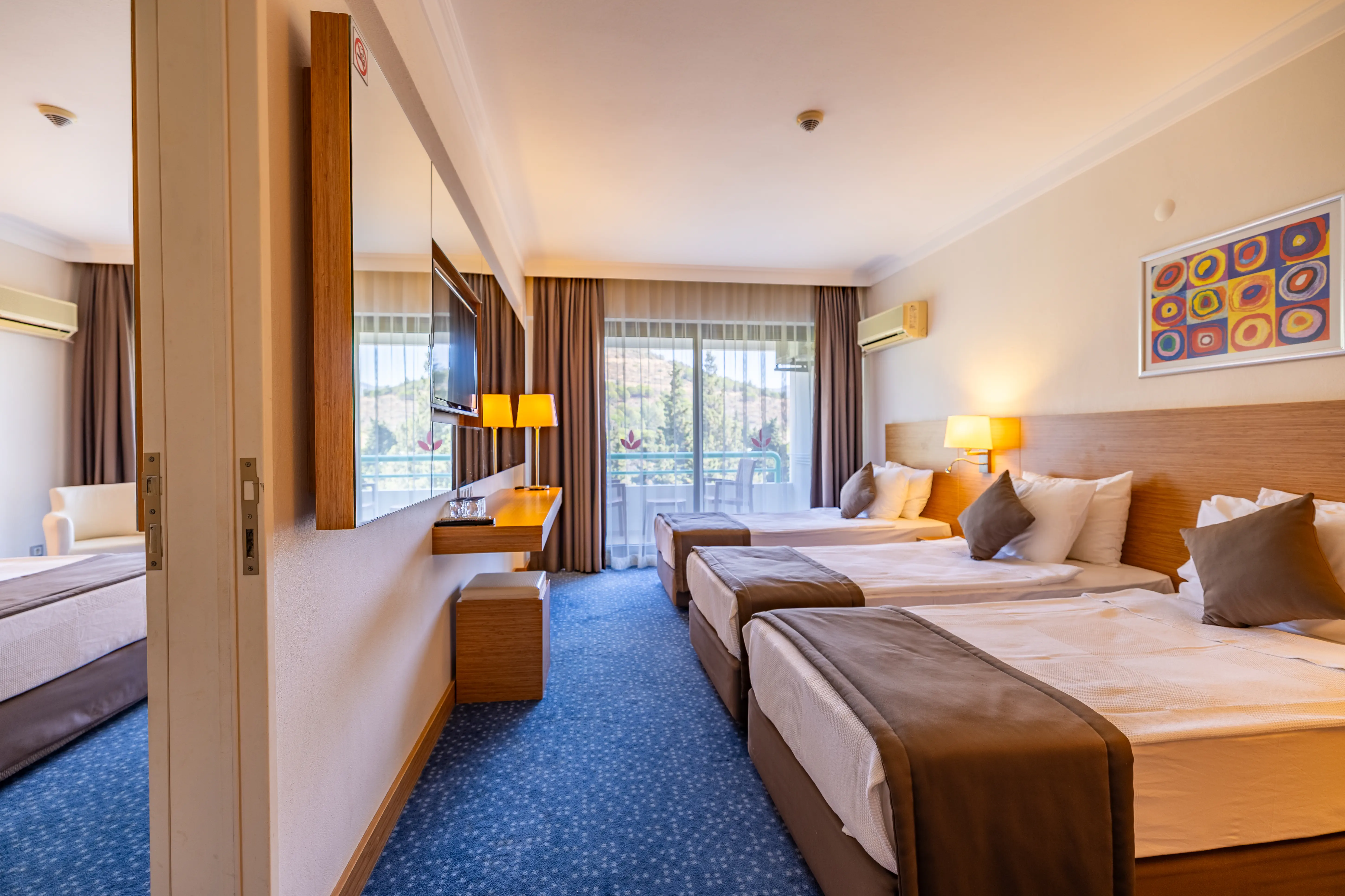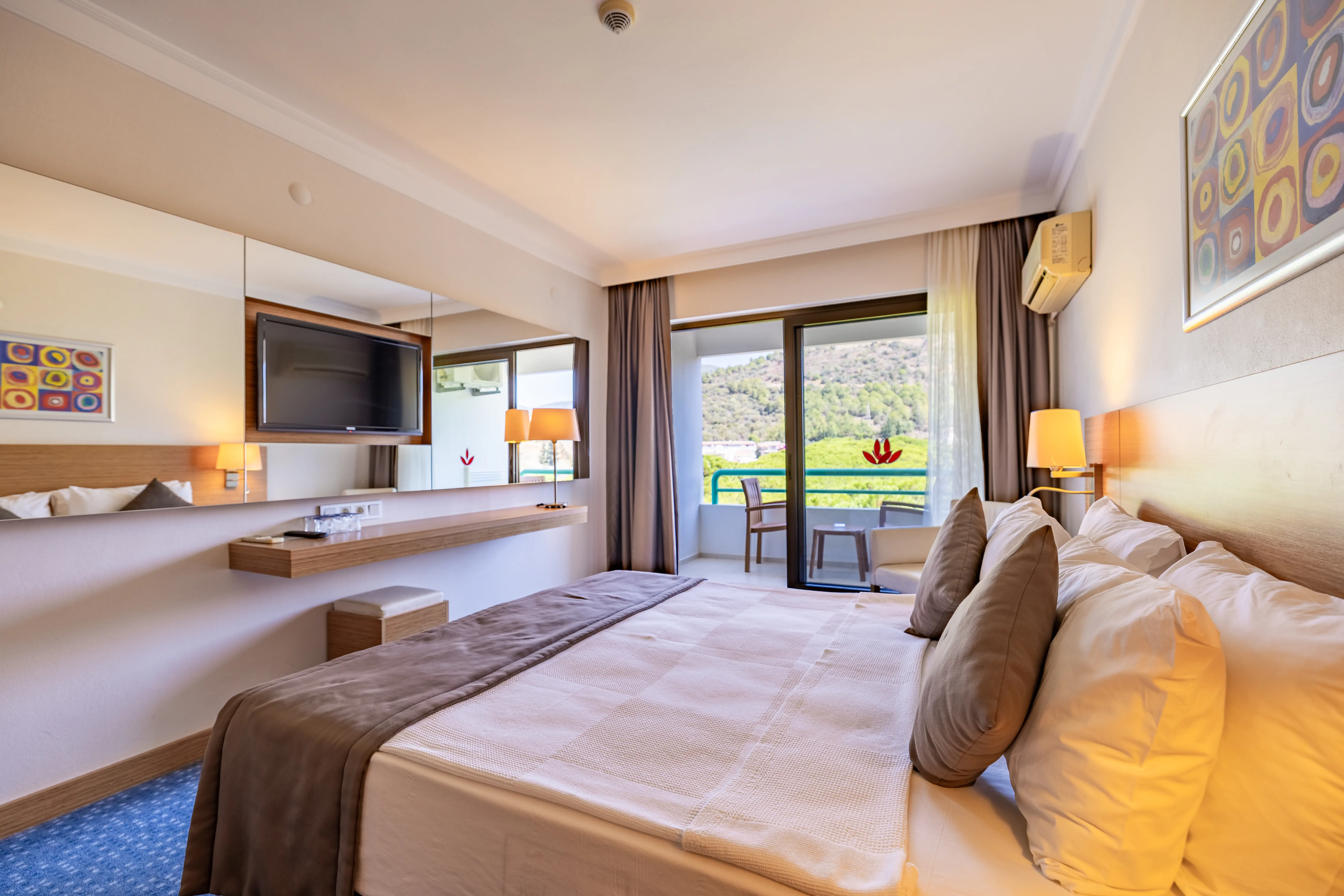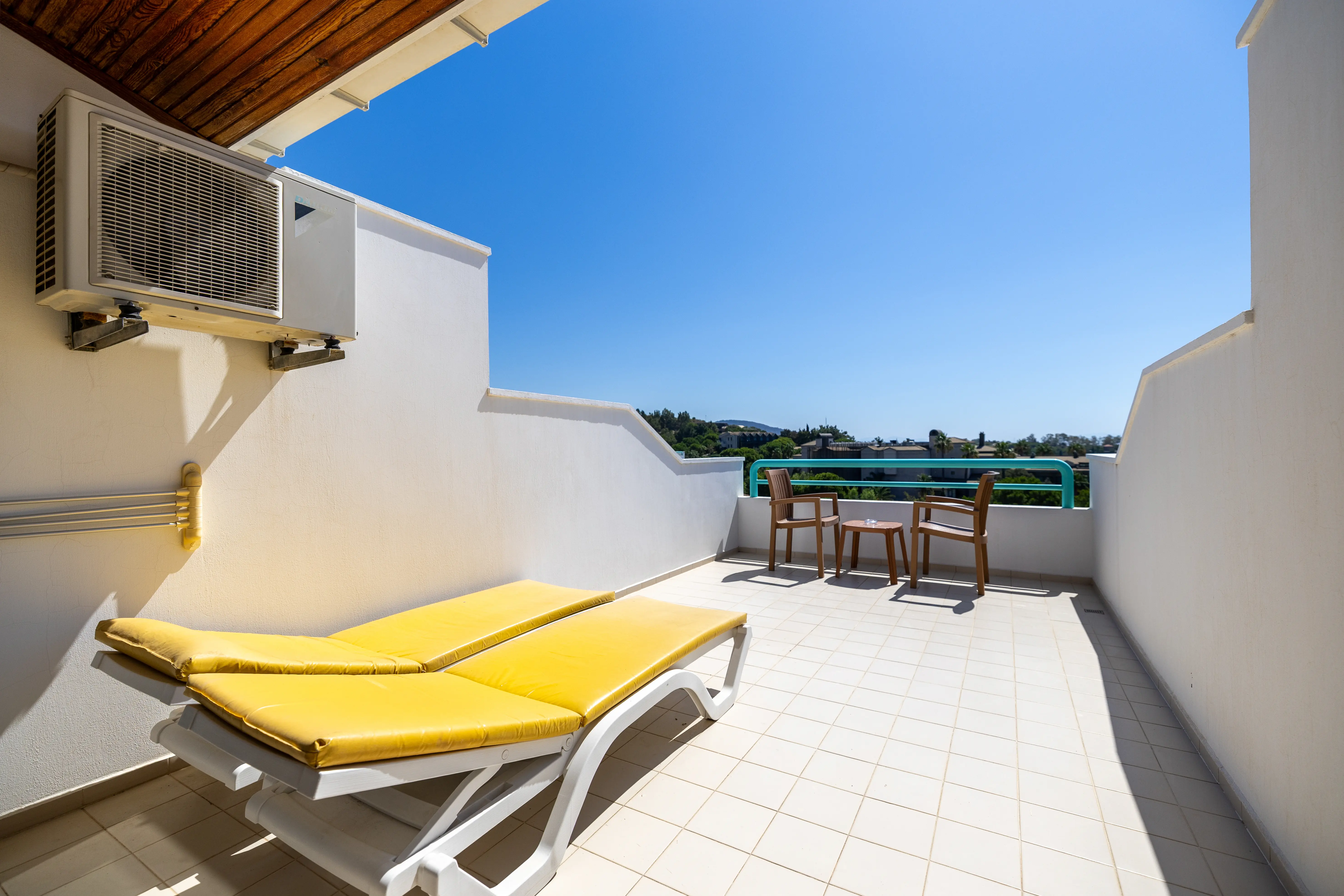 Dla max. 4 osób, Przestrzeń zewnętrzna: Balkon, Kanały telewizji: Angielski, Telefon w pokoju, prysznic, Powierzchnia pokoju: ok. 24 m2, Dostawka: łóżko rozkładane, Rodzaj podłogi: wykładzina, Sprzątanie codziennie, 1 sypialnia, Maksymalna liczba osób dorosłych: 3, Maksymalna liczba dzieci: 2, Widok na ogród i basen,Widok na ogród i morze,Boczny widok na morze,Widok na basen i morze,Od strony morza i basenu,Częściowy widok na morze, Liczba łazienek: 1, Liczba toalet: 1, Klimatyzacja: Klimatyzacja indywidualna
