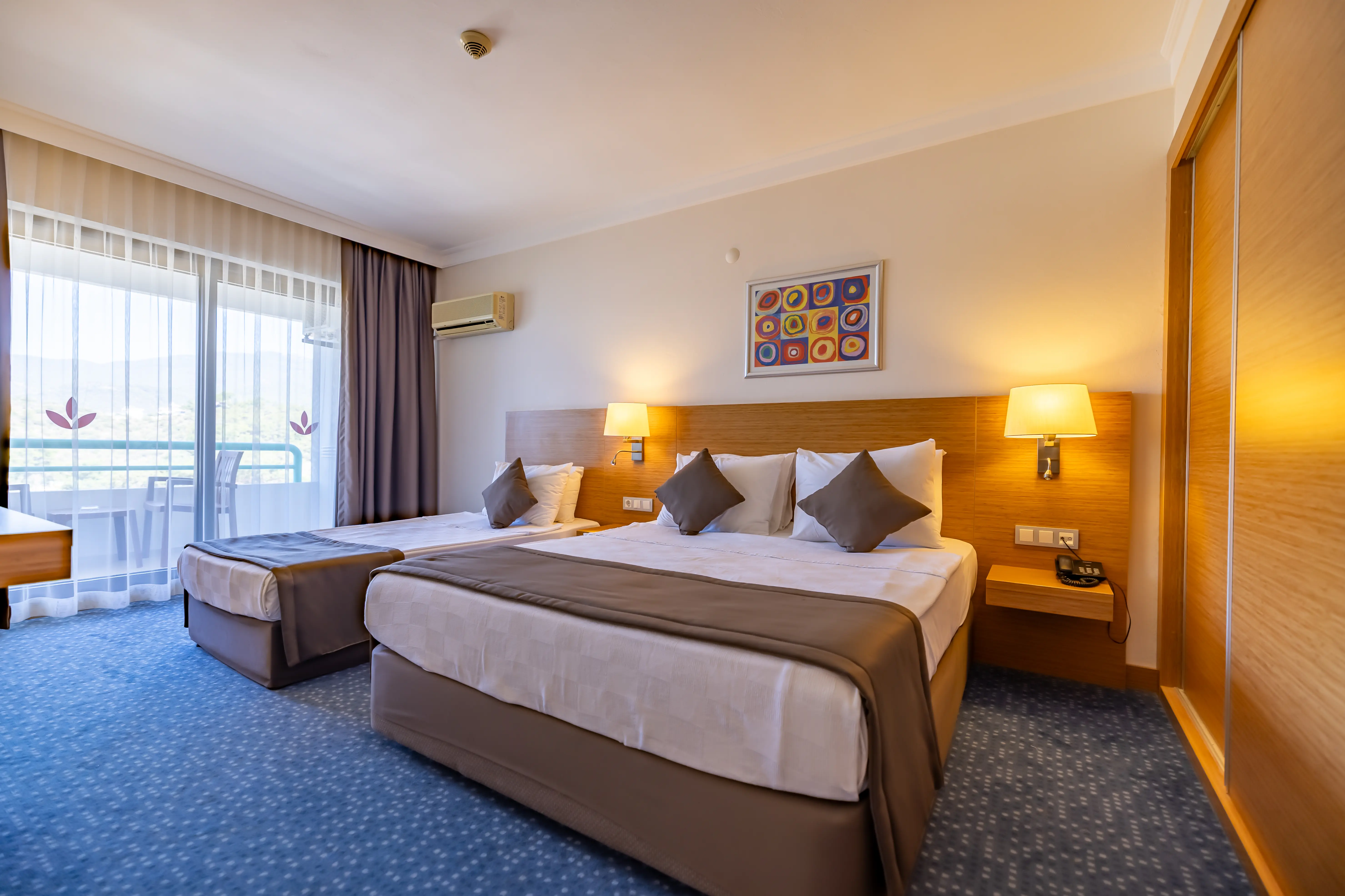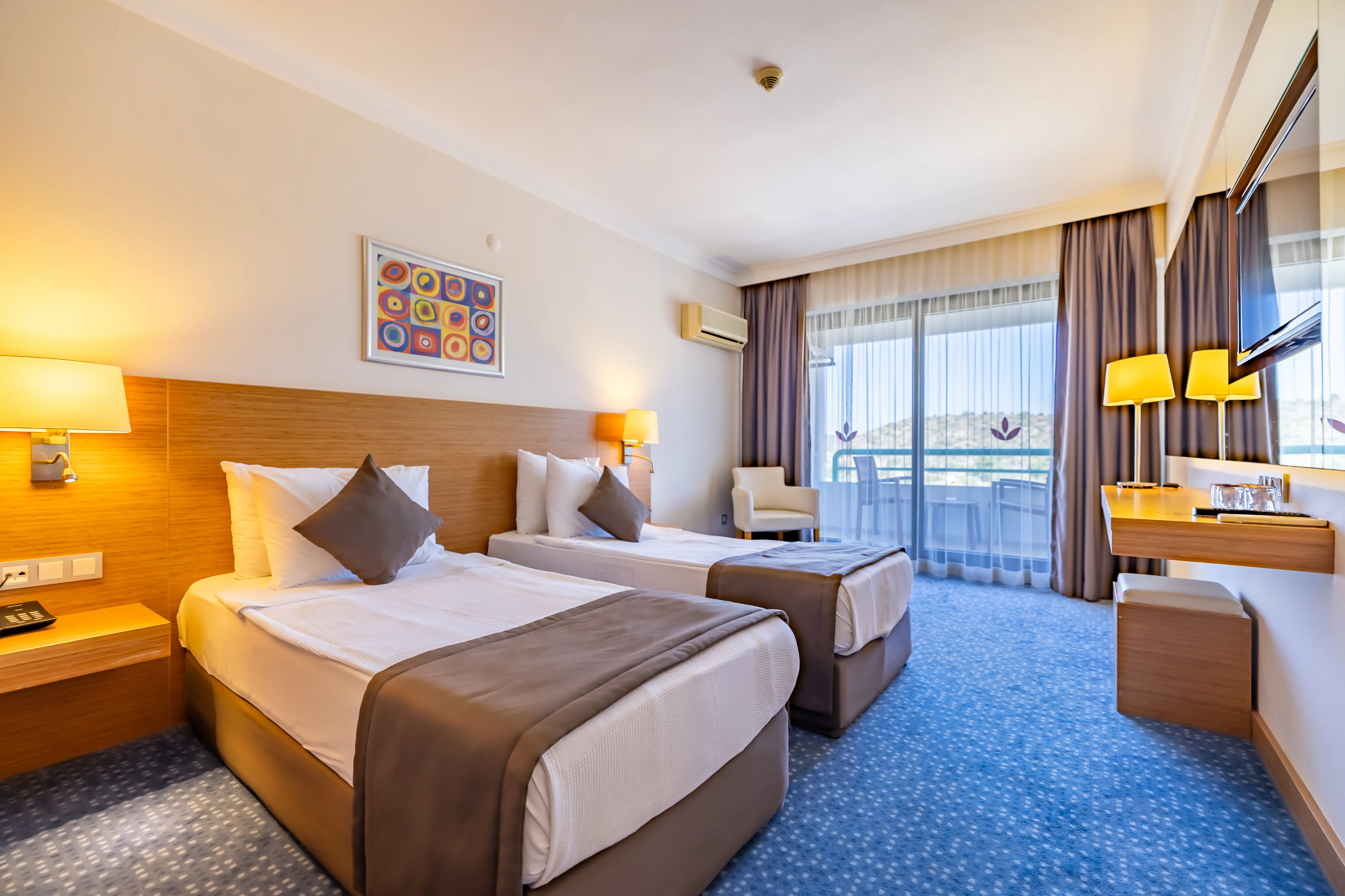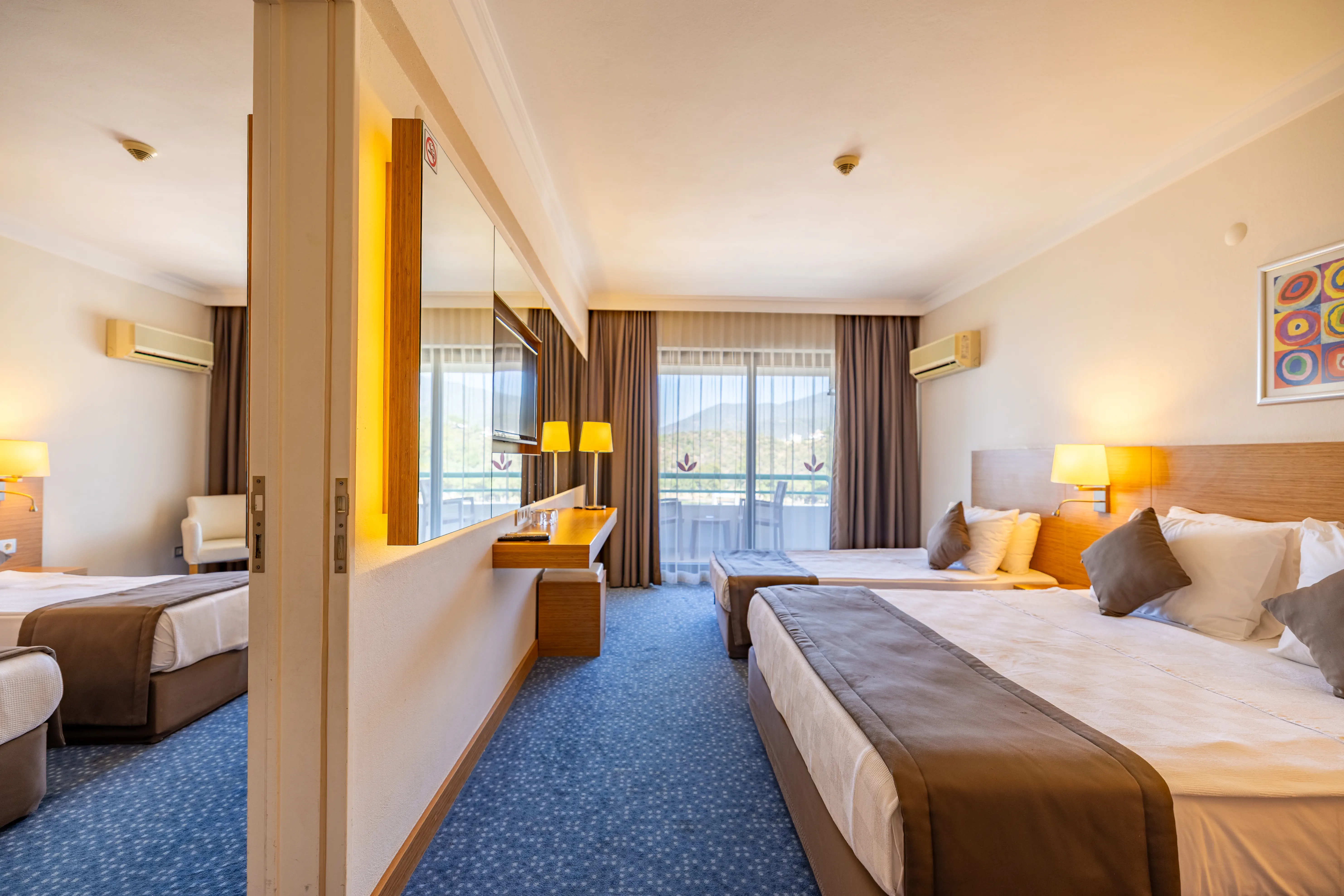 Dla max. 4 osób, Przestrzeń zewnętrzna: Balkon, Kanały telewizji: Angielski, Telefon w pokoju, prysznic, Powierzchnia pokoju: ok. 24 m2, Dostawka: łóżko rozkładane, Rodzaj podłogi: wykładzina, Sprzątanie codziennie, 1 sypialnia, Maksymalna liczba osób dorosłych: 3, Maksymalna liczba dzieci: 2, Widok na ogród i basen,Widok na ogród i morze,Boczny widok na morze,Widok na basen i morze,Od strony morza i basenu,Częściowy widok na morze, Liczba łazienek: 1, Liczba toalet: 1, Klimatyzacja: Klimatyzacja indywidualna
