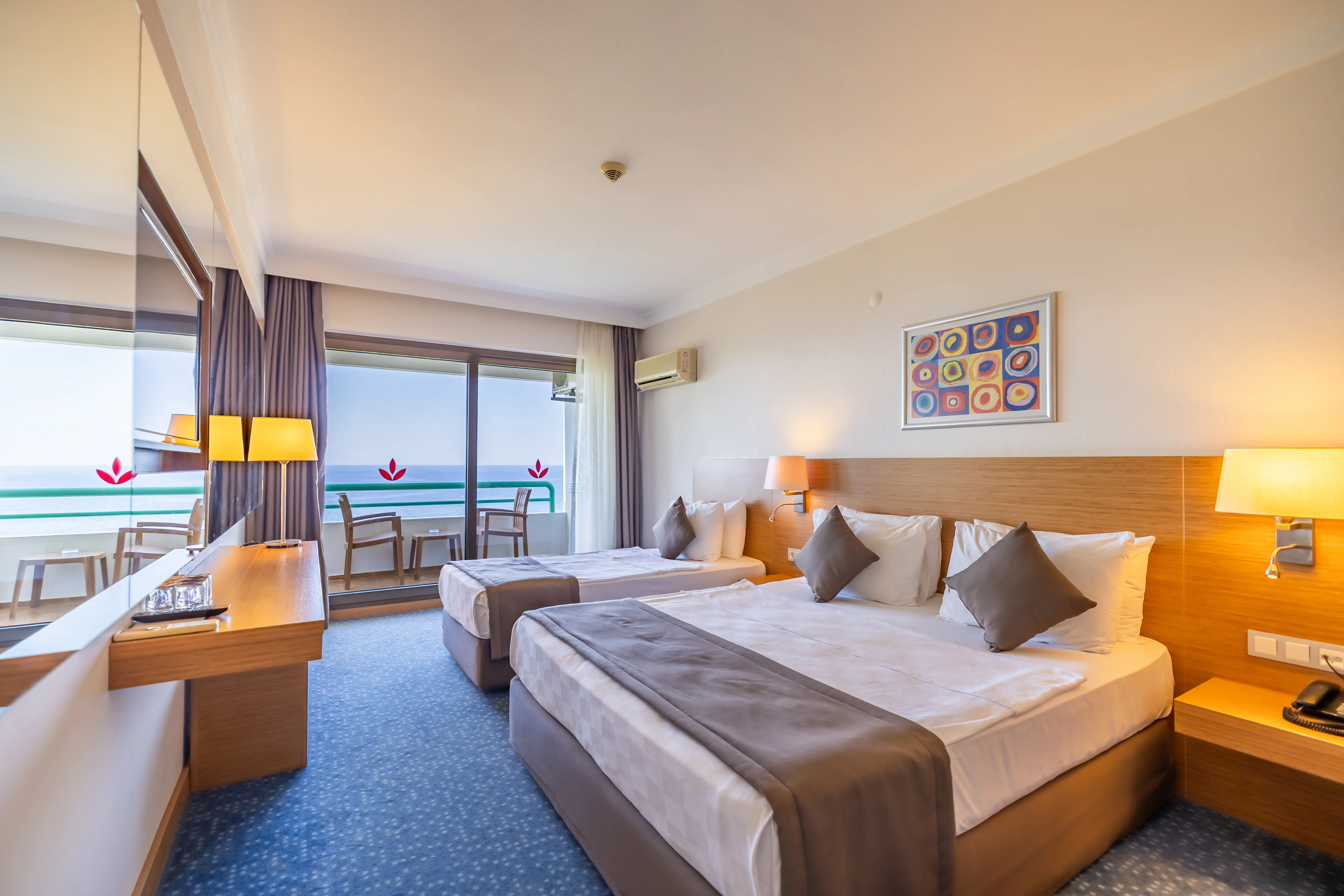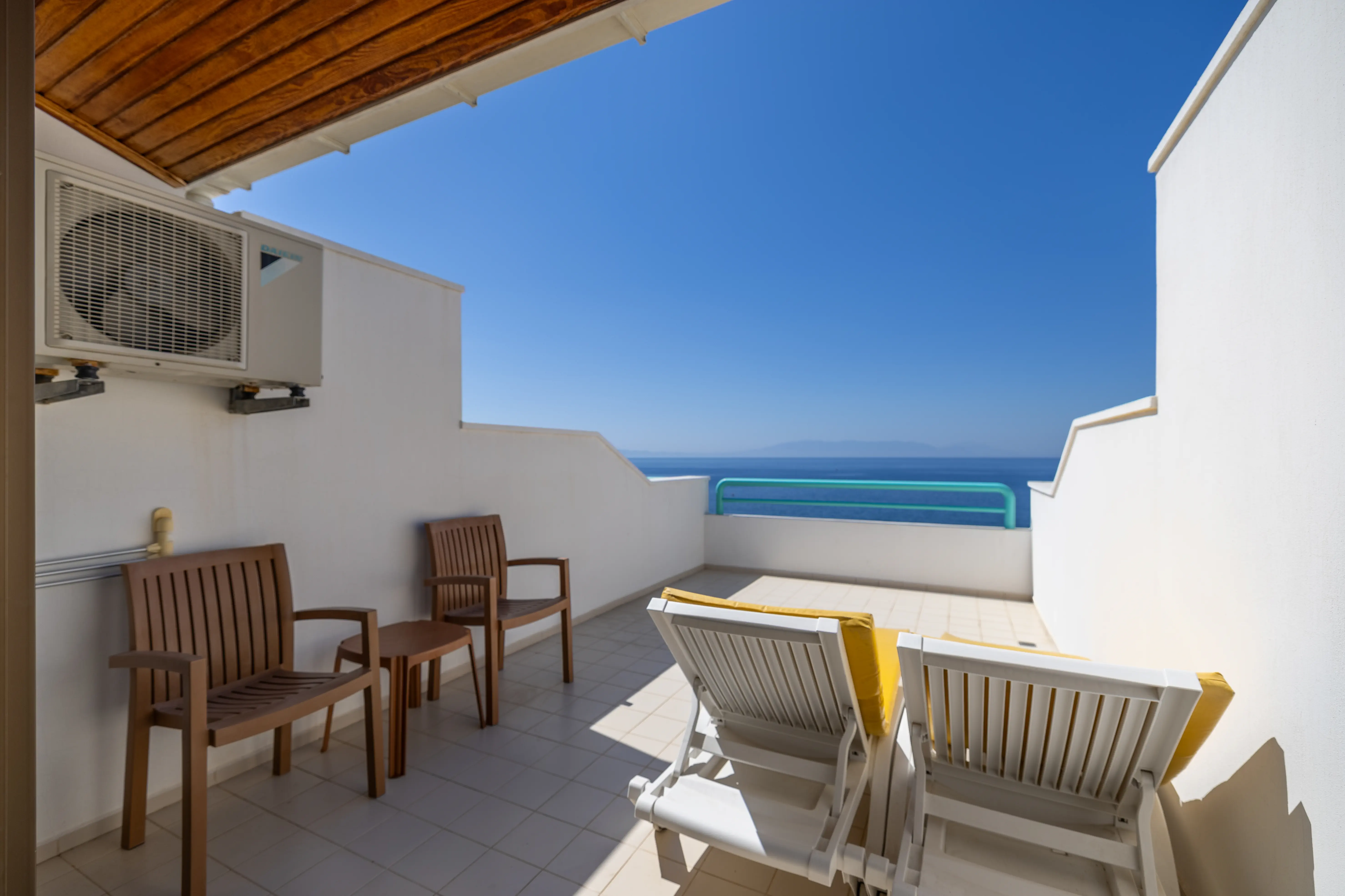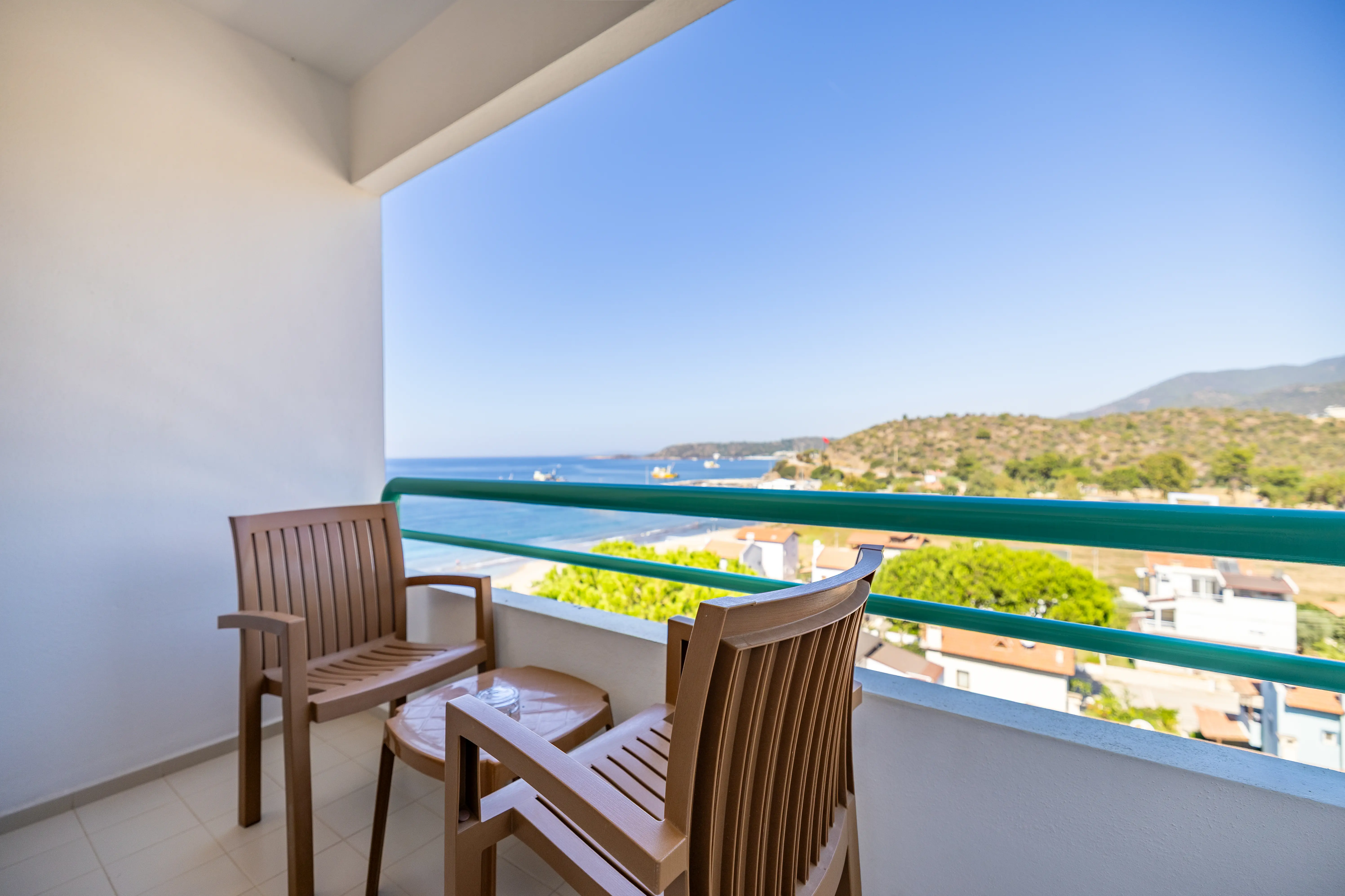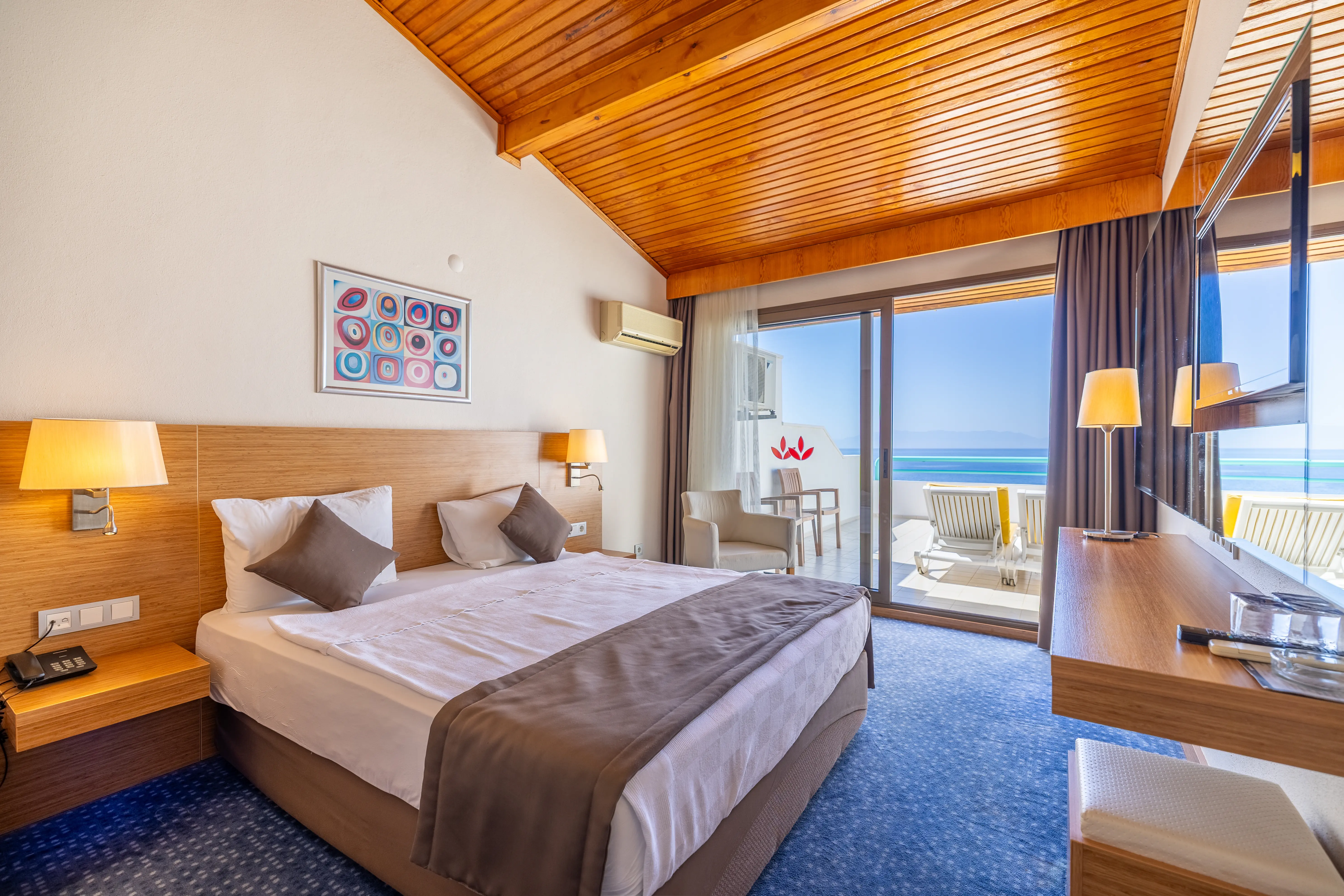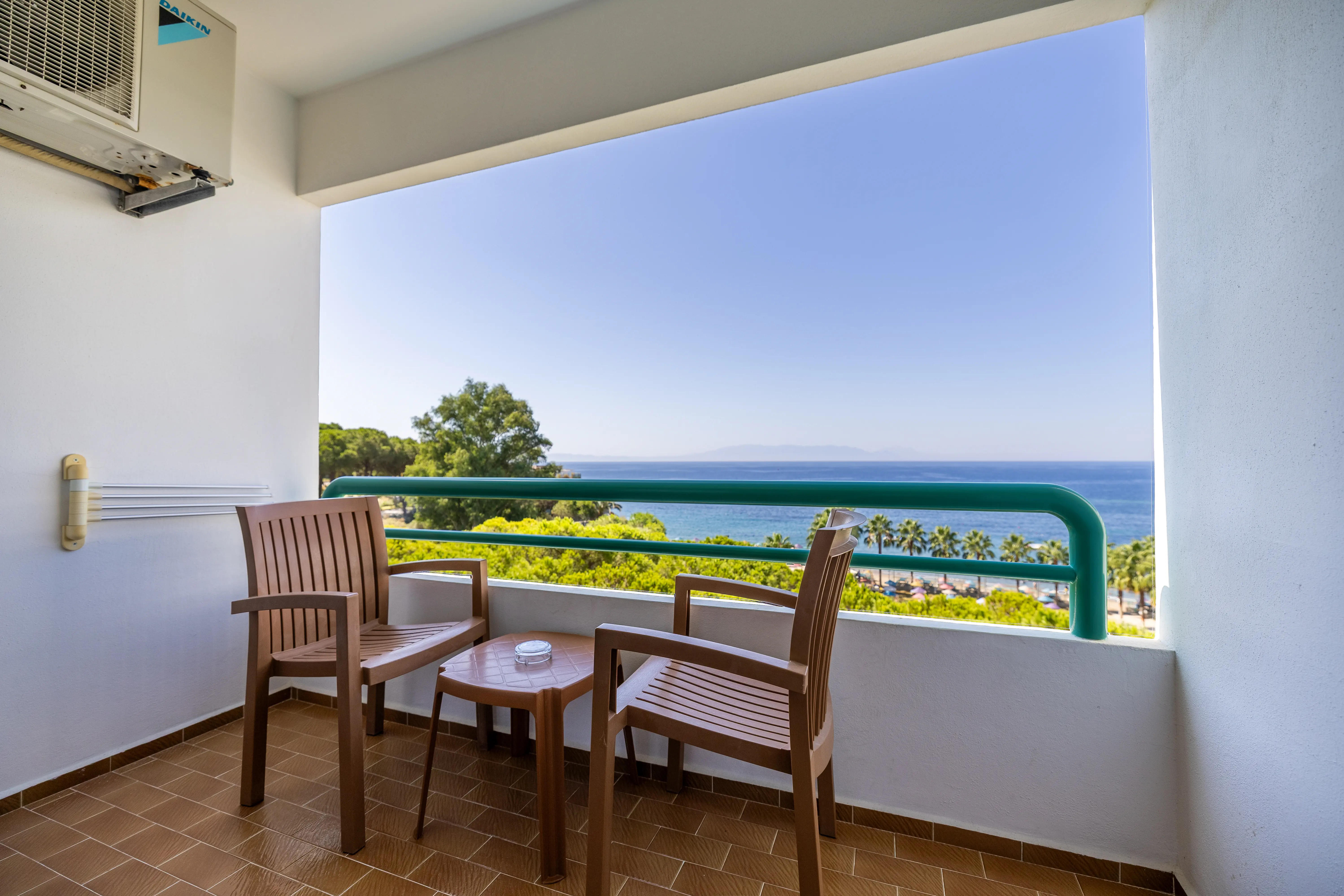 Dla max. 4 osób, Przestrzeń zewnętrzna: Balkon, Kanały telewizji: Angielski, Telefon w pokoju, prysznic, Powierzchnia pokoju: ok. 24 m2, Dostawka: łóżko rozkładane, Rodzaj podłogi: wykładzina, Sprzątanie codziennie, 1 sypialnia, Maksymalna liczba osób dorosłych: 3, Maksymalna liczba dzieci: 2, Widok na basen i morze,Frontalny widok na morze,Widok na morze, Liczba łazienek: 1, Liczba toalet: 1, Klimatyzacja: Klimatyzacja indywidualna