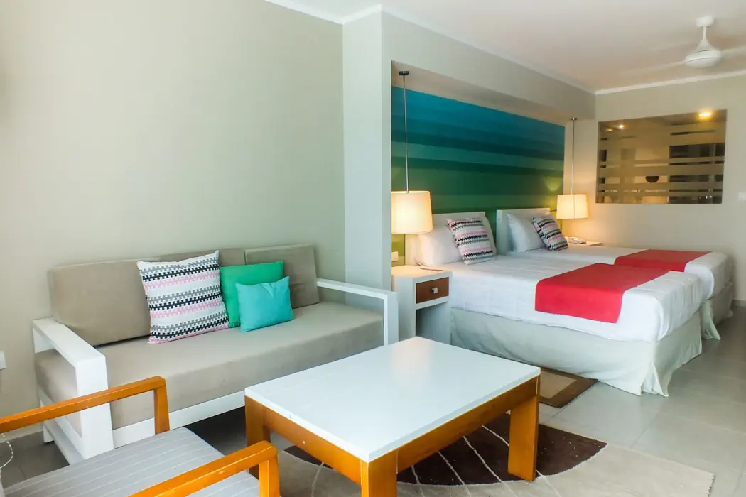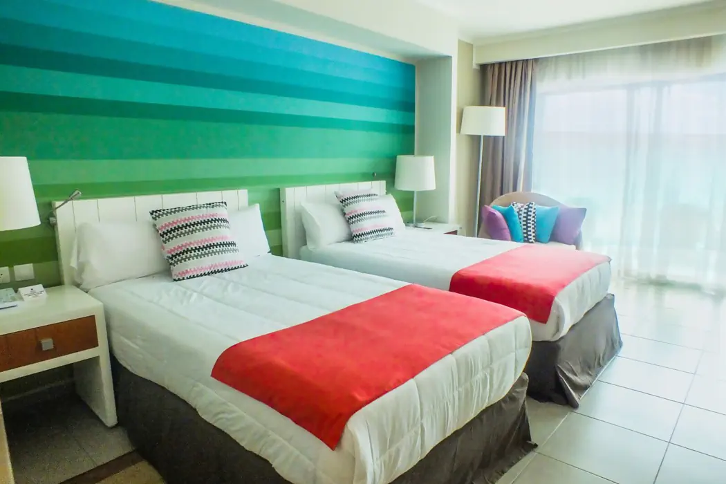 Zlokalizowane są w 4 budynkach (liczba pięter: 3, liczba wind: 0) Typy pokoi: - pokoje standard best promo dla max. 4 os.: 1 sypialnia, klimatyzacja centralna, sejf (bezpłatny), zestaw do parzenia kawy/herbaty (bezpłatny), minibar (bezpłatny, uzupełniany tylko w dniu przyjazdu), TV, telefon, łazienka (wanna lub prysznic, WC), balkon lub taras - pokoje standard dla max. 4 os.: 1 sypialnia, klimatyzacja centralna, sejf (bezpłatny), zestaw do parzenia kawy/herbaty (bezpłatny), minibar (bezpłatny, uzupełniany tylko w dniu przyjazdu), TV, telefon, łazienka (wanna lub prysznic, WC), balkon lub taras - junior suity dla max. 4 os.: 1 sypialnia, klimatyzacja centralna, sejf (bezpłatny), zestaw do parzenia kawy/herbaty (bezpłatny), minibar (bezpłatny, uzupełniany tylko w dniu przyjazdu), TV, telefon, łazienka (wanna lub prysznic, WC), balkon lub taras - suity dla max. 4 os.: 1 sypialnia, klimatyzacja centralna, sejf (bezpłatny), zestaw do parzenia kawy/herbaty (bezpłatny), minibar (bezpłatny, uzupełniany tylko w dniu przyjazdu), TV, telefon, łazienka (wanna lub prysznic, WC), balkon lub taras - pokoje standard sea view dla max. 4 os.: 1 sypialnia, klimatyzacja centralna, sejf (bezpłatny), zestaw do parzenia kawy/herbaty (bezpłatny), minibar (bezpłatny, uzupełniany tylko w dniu przyjazdu), TV, telefon, łazienka (wanna lub prysznic, WC), balkon lub taras - junior suity sea view dla max. 4 os.: 1 sypialnia, klimatyzacja centralna, sejf (bezpłatny), zestaw do parzenia kawy/herbaty (bezpłatny), minibar (bezpłatny, uzupełniany tylko w dniu przyjazdu), TV, telefon, łazienka (wanna lub prysznic, WC), balkon lub taras - suity sea view dla max. 4 os.: 1 sypialnia, klimatyzacja centralna, sejf (bezpłatny), zestaw do parzenia kawy/herbaty (bezpłatny), minibar (bezpłatny, uzupełniany tylko w dniu przyjazdu), TV, telefon, łazienka (wanna lub prysznic, WC), balkon lub taras