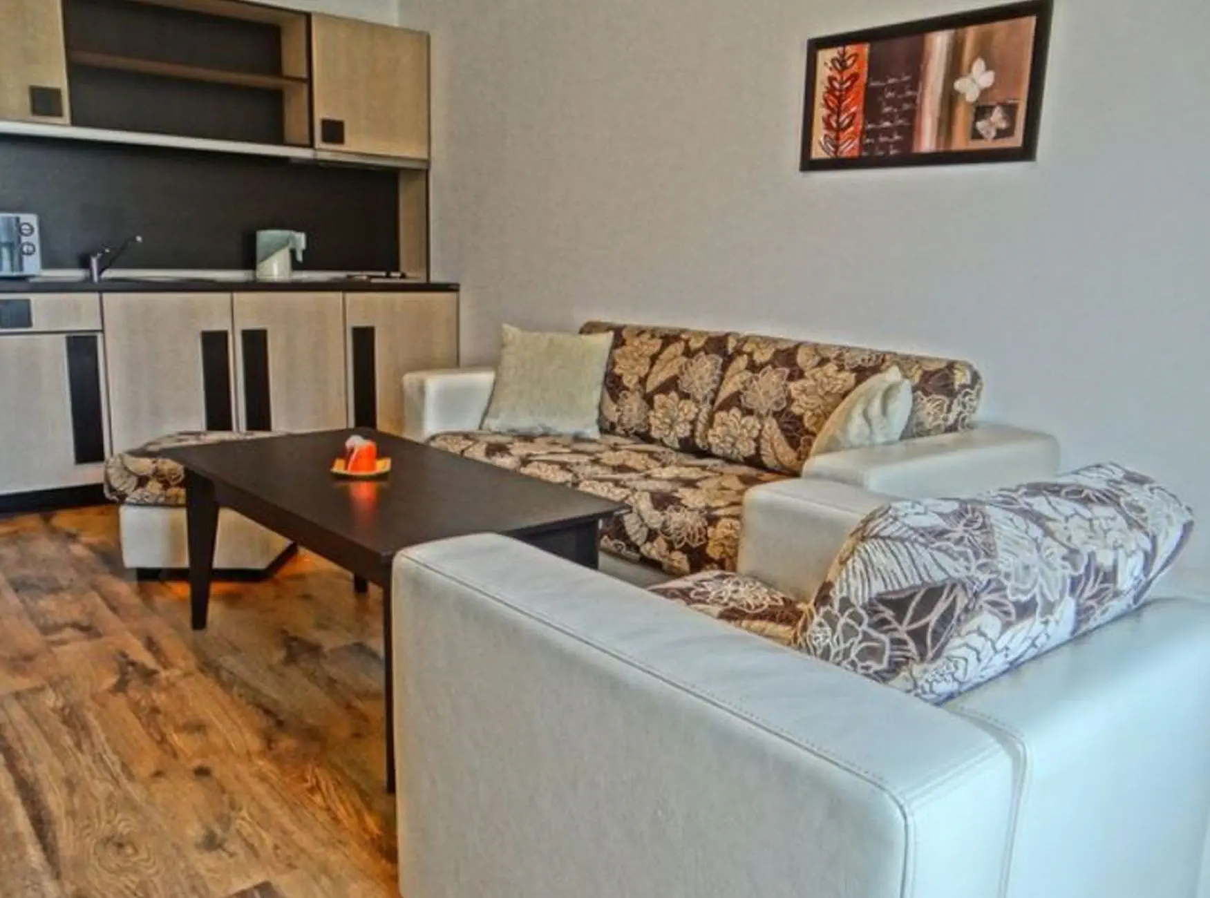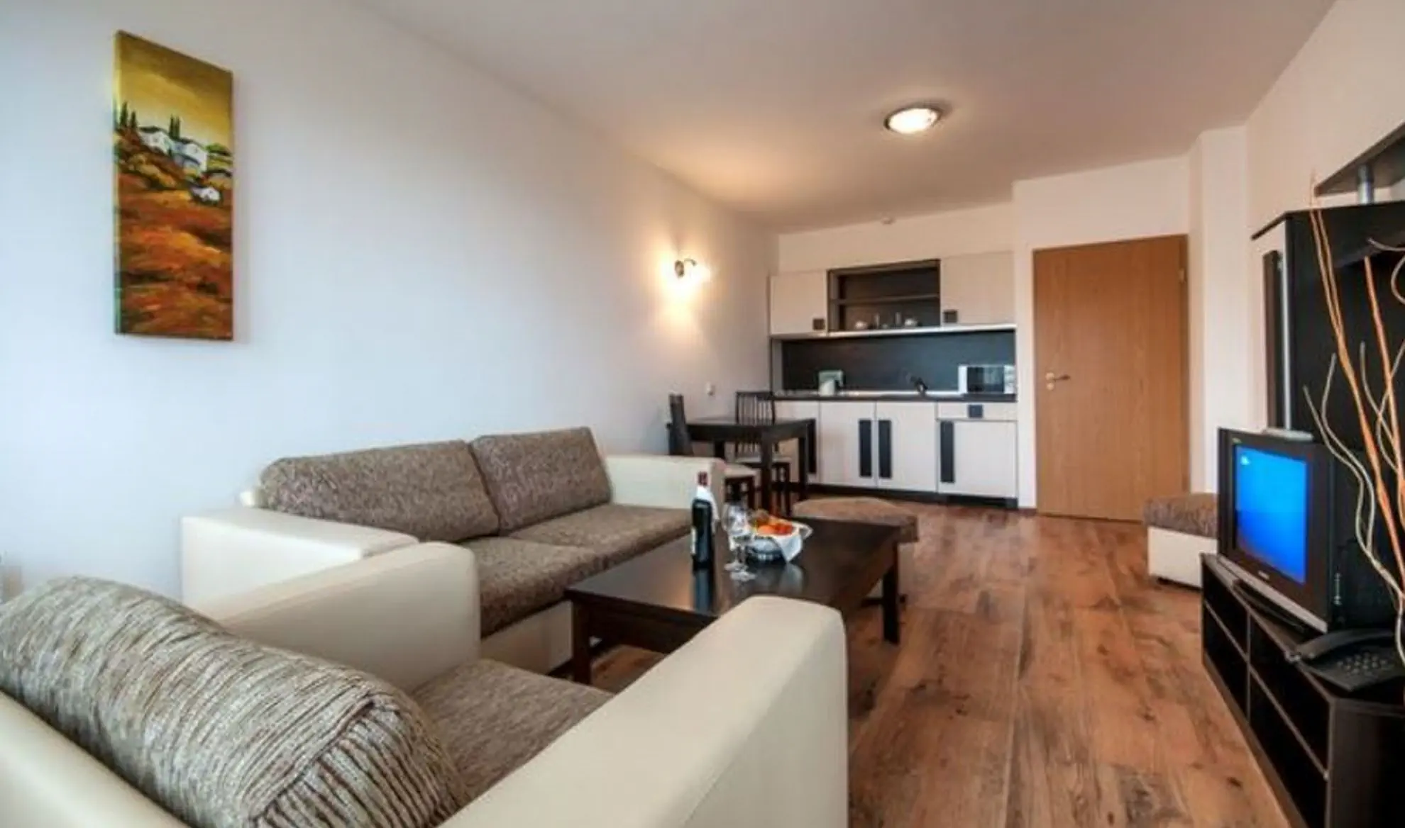 studio (ok. 40 m2): prysznic, WC, suszarka, telefon, TV kablowa, WiFi, ogrzewanie, aneks kuchenny, balkon. Apartamenty (ok. 55 m2): wyposażone jak studio, salon z rozkładaną sofą.