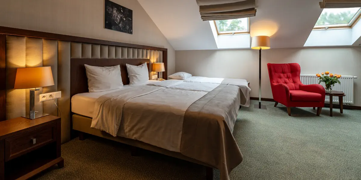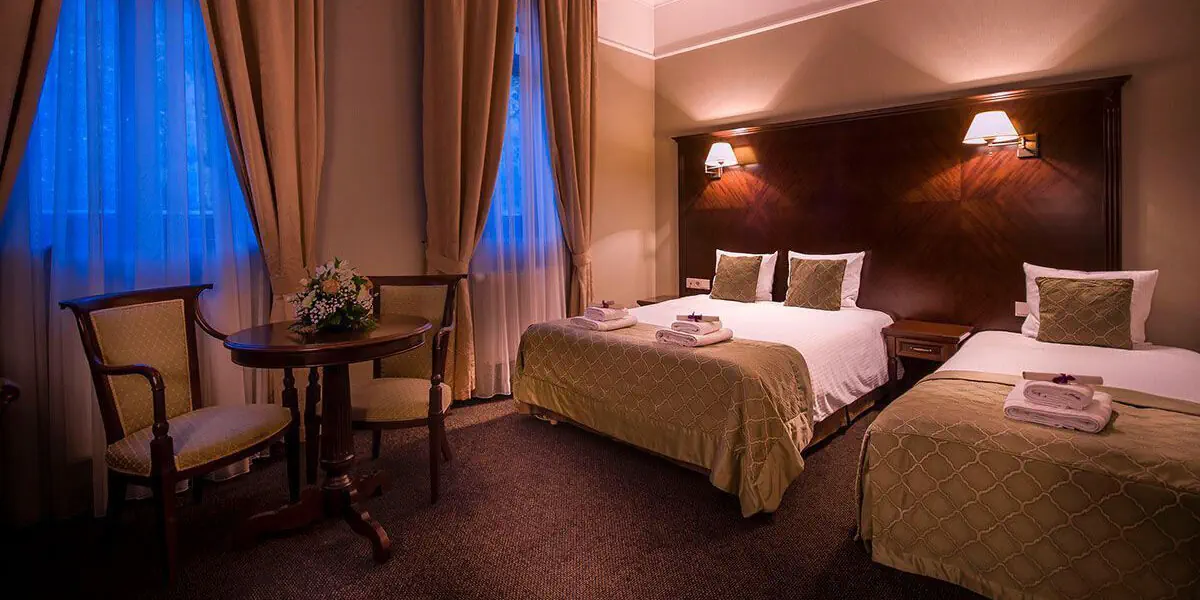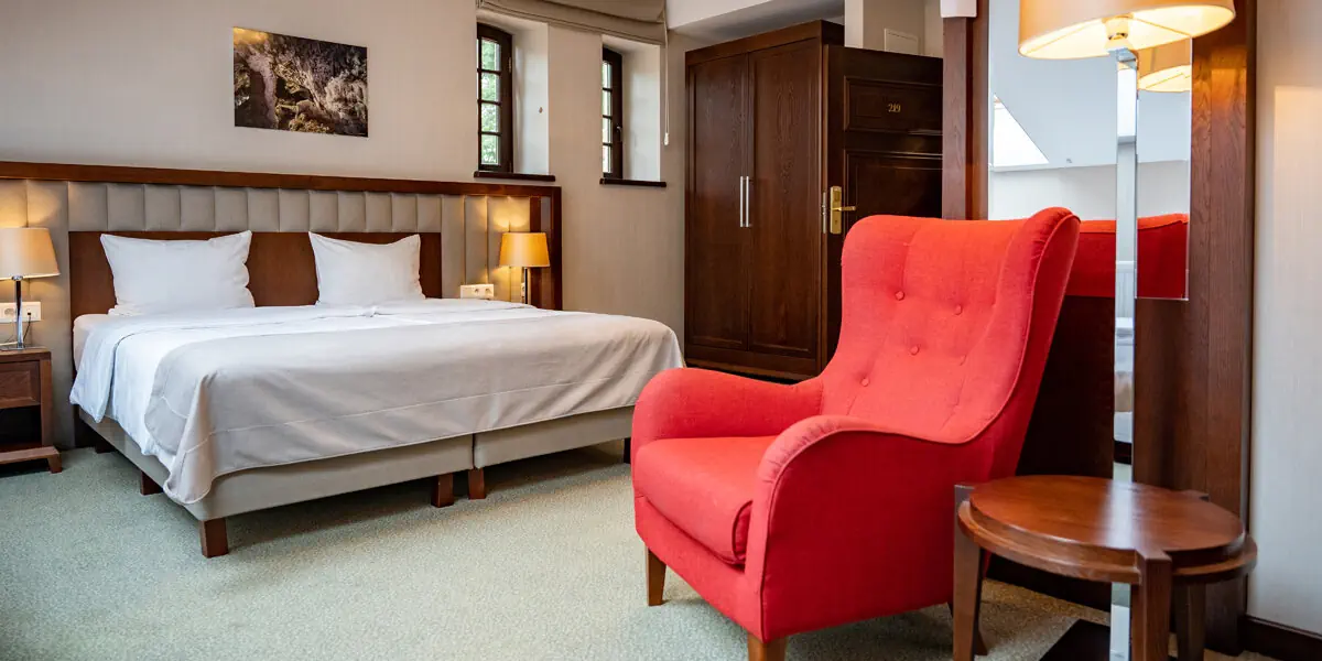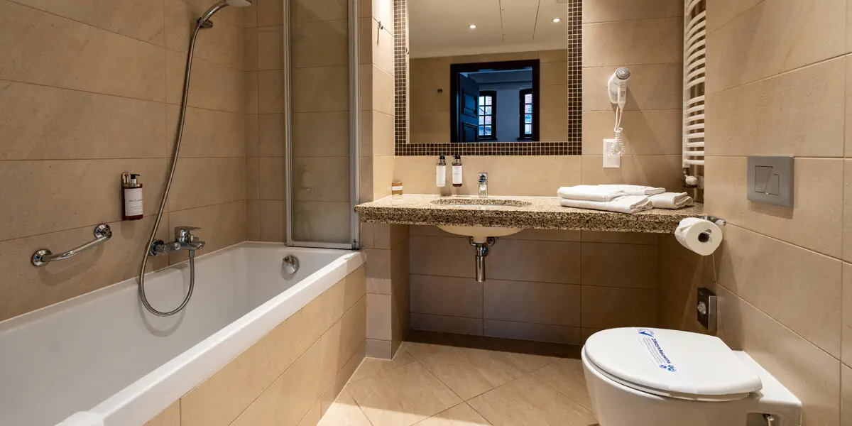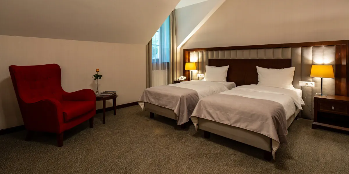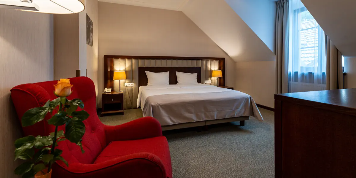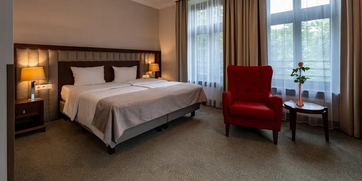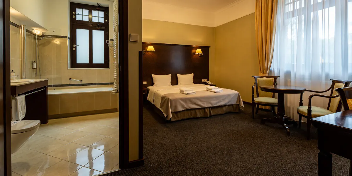 Wygodny klimatyzowany pokój z łazienką, wyposażony w minibar, czajnik, sejf, TV, wifi, szlafroki, suszarkę do włosów. W łazience prysznic lub wanna