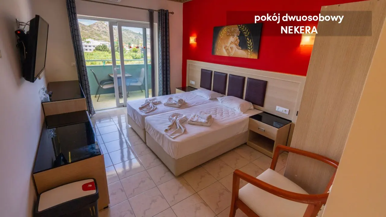 Hotel składający się z 3 budynków, w obiekcie znajduje się 43 pokoi. Recepcja z lobby, restauracja, pool bar, snack bar, sala telewizyjna, sejf przy recepcji (płatny dodatkowo). Pokój dwuosobowy STANDARD DOUBLE ROOM: pokój z 2 łóżkami pojedynczymi lub 1 łóżkiem podwójnym, klimatyzacja (odpłatnie 6 euro/dzień), TV-SAT, telefon, czajnik (2 euro/dzień), sejf (2,5 euro/dzień), łazienka - prysznic, suszarka, balkon lub taras. Pokój trzyosobowy STANDARD TRIPLE ROOM: W pokoju trzyosobowym 3 łóżka pojedyncze lub 1 łóżko podwójne i 2 łóżka pojedyncze. Pokój rodzinny FAMILY ROOM: pokój rodzinny (zakwaterowanie do 5 osób) obejmuje duży oddzielny salon i 2 oddzielne sypialnie z 2 łóżkami pojedynczymi lub 2 łóżkami podwójnymi w każdym pokoju. Jest też 1 rozkładana sofa, na której może spać jeszcze jedna osoba. W wszystkich pokojach jest klimatyzacja (odpłatnie 6 euro/dzień), TV-SAT, telefon, czajnik (2 euro/dzień), sejf (2,5 euro/dzień), łazienka - prysznic, suszarka, balkon lub taras.