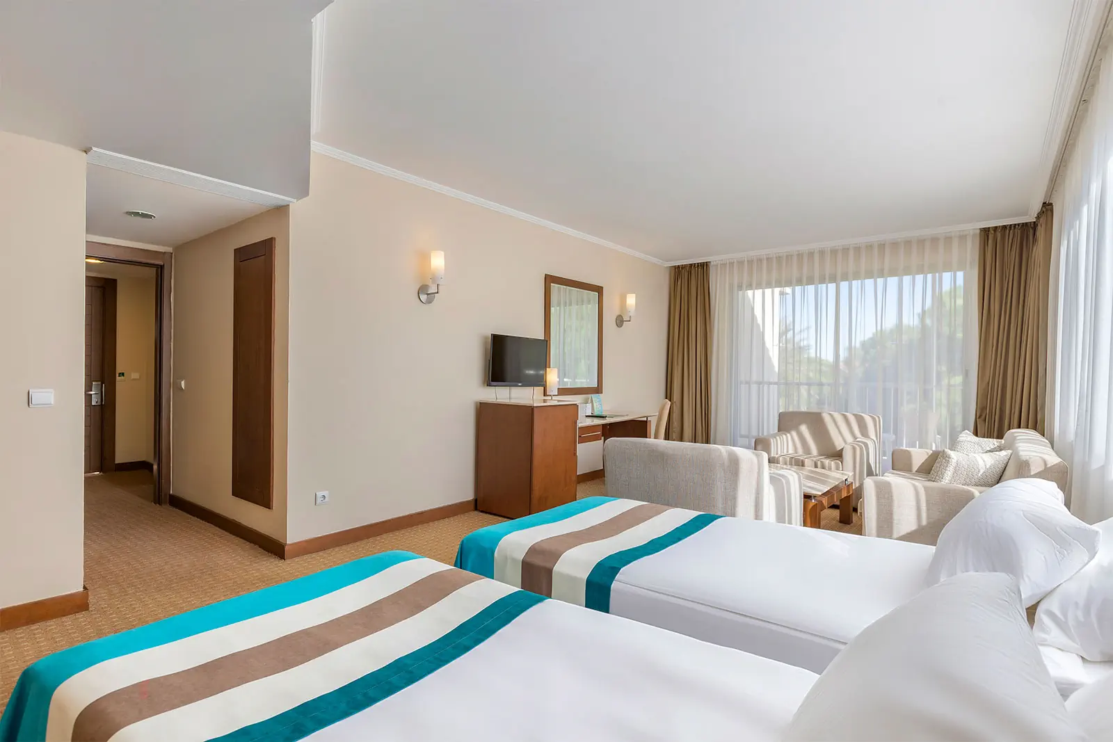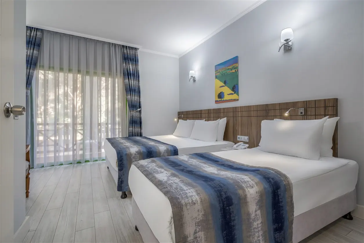 Dla max. 3 osób, Przestrzeń zewnętrzna: Balkon, Kanały telewizji: Angielski, Telefon w pokoju, wanna, Powierzchnia pokoju: ok. 28 m2, Dostawka: łóżko standardowe, Rodzaj podłogi: wykładzina, Sprzątanie codziennie, 1 sypialnia, Maksymalna liczba osób dorosłych: 3, Maksymalna liczba dzieci: 1, Widok na ogród, Liczba łazienek: 1, Liczba toalet: 1, Klimatyzacja: Klimatyzacja centralna