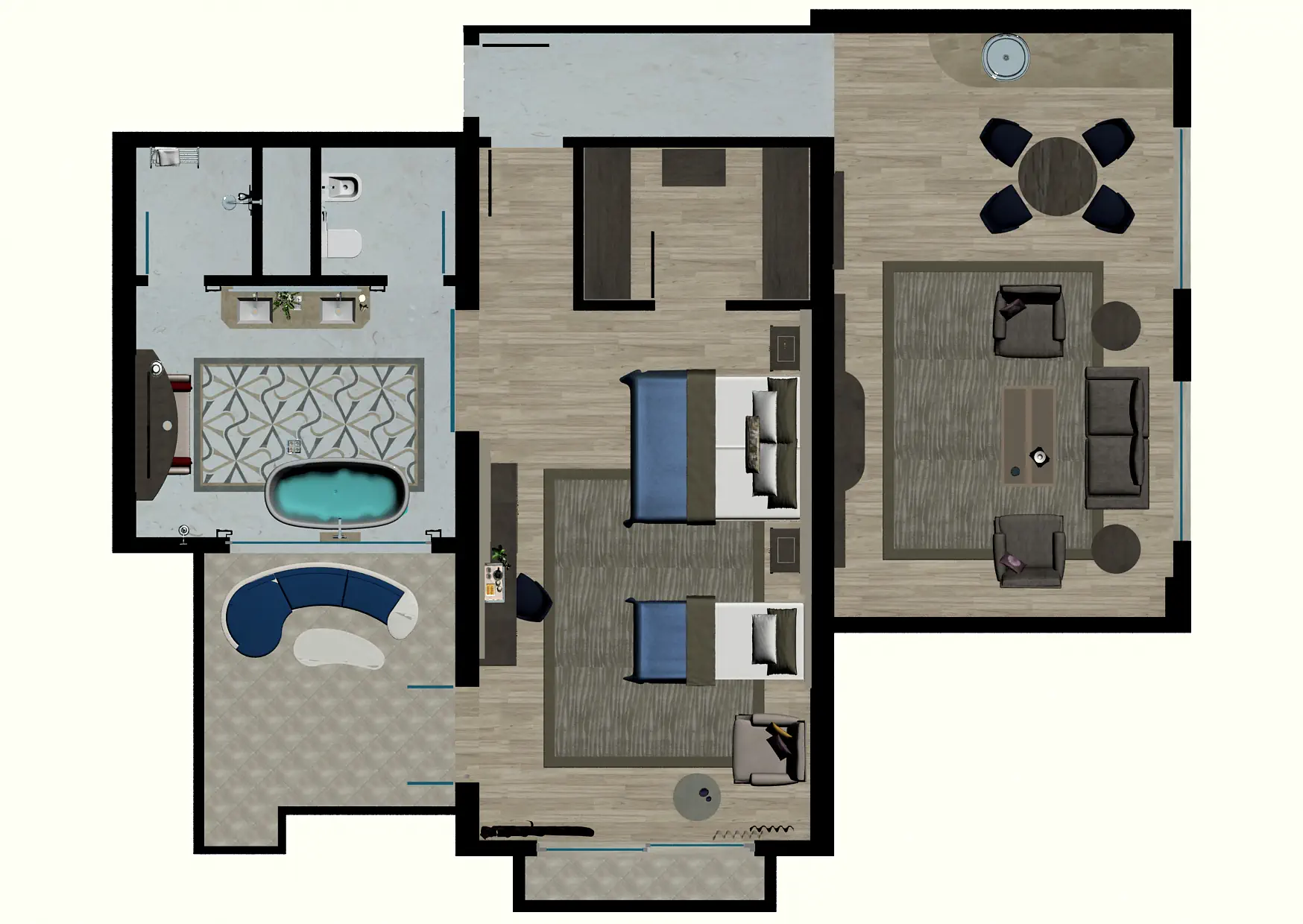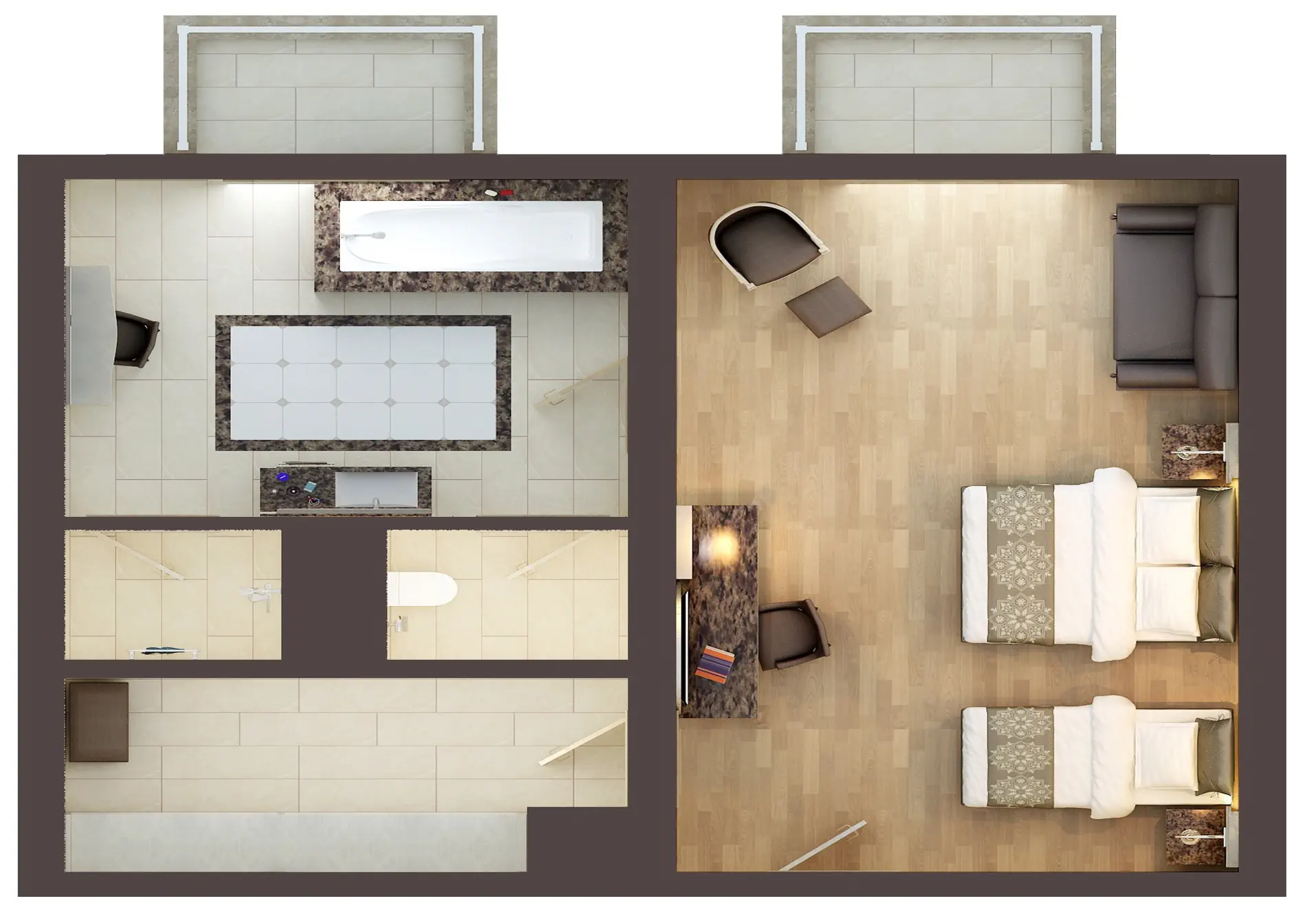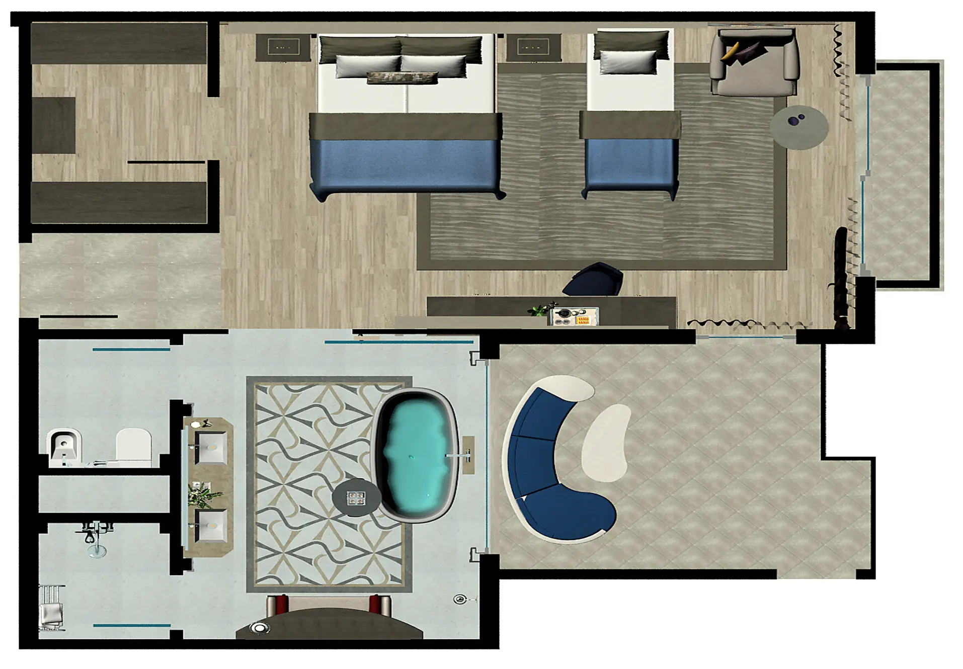 Dla max. 4 osób, Przestrzeń zewnętrzna: Balkon, Kanały telewizji: Angielski, Telefon w pokoju, jacuzzi, Powierzchnia pokoju: ok. 32 - 37 m2, Dostawka: łóżko rozkładane, Rodzaj podłogi: laminat, Sprzątanie codziennie, 1 sypialnia, Maksymalna liczba osób dorosłych: 3, Maksymalna liczba dzieci: 2, Widok na ogród, Liczba łazienek: 1, Liczba toalet: 1, Zestaw do parzenia kawy i herbaty, Klimatyzacja: Klimatyzacja centralna, Działa w godzinach: 23:59-23:58, Maj, Czerwiec, Lipiec, Sierpień, Wrzesień