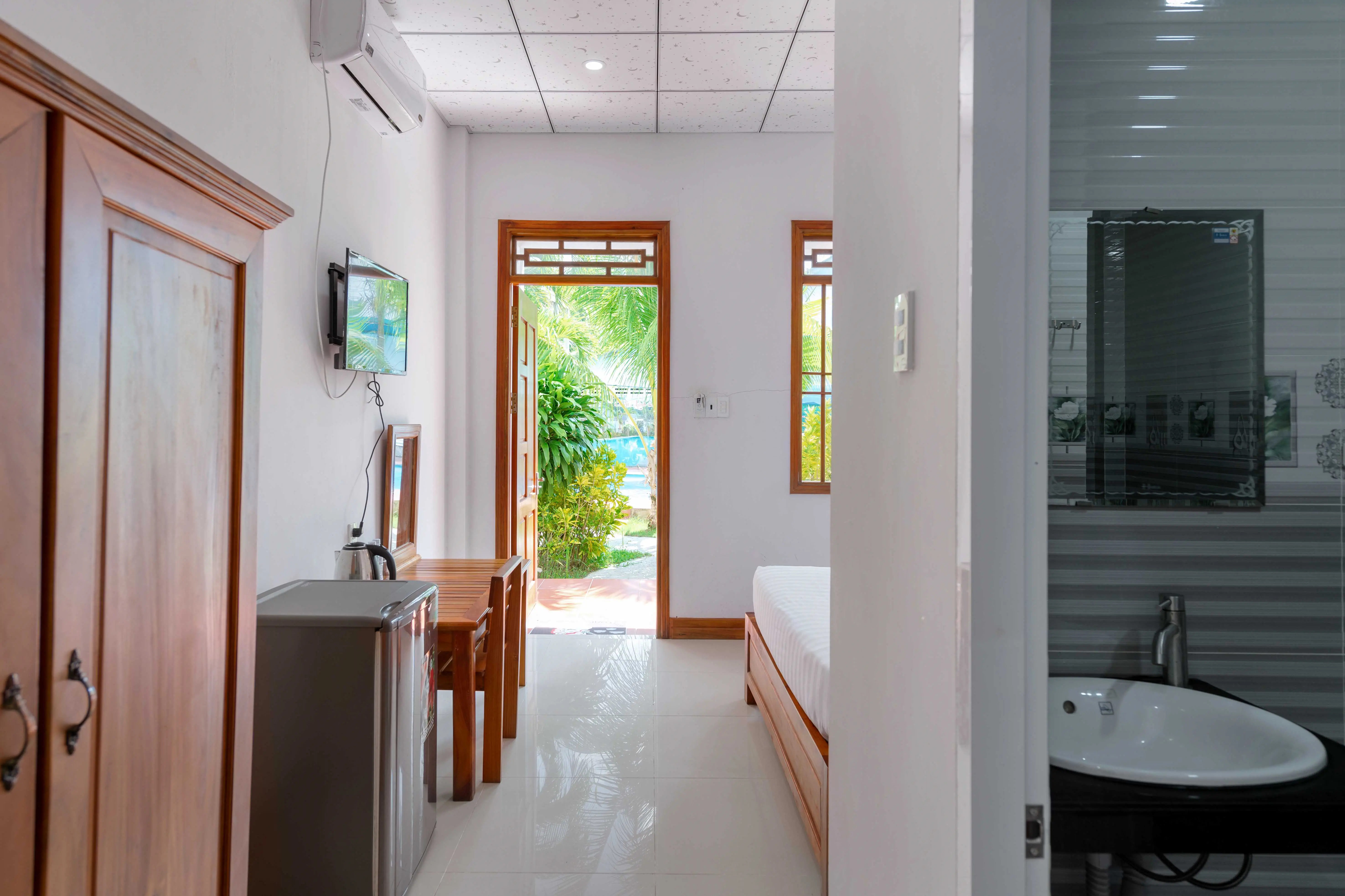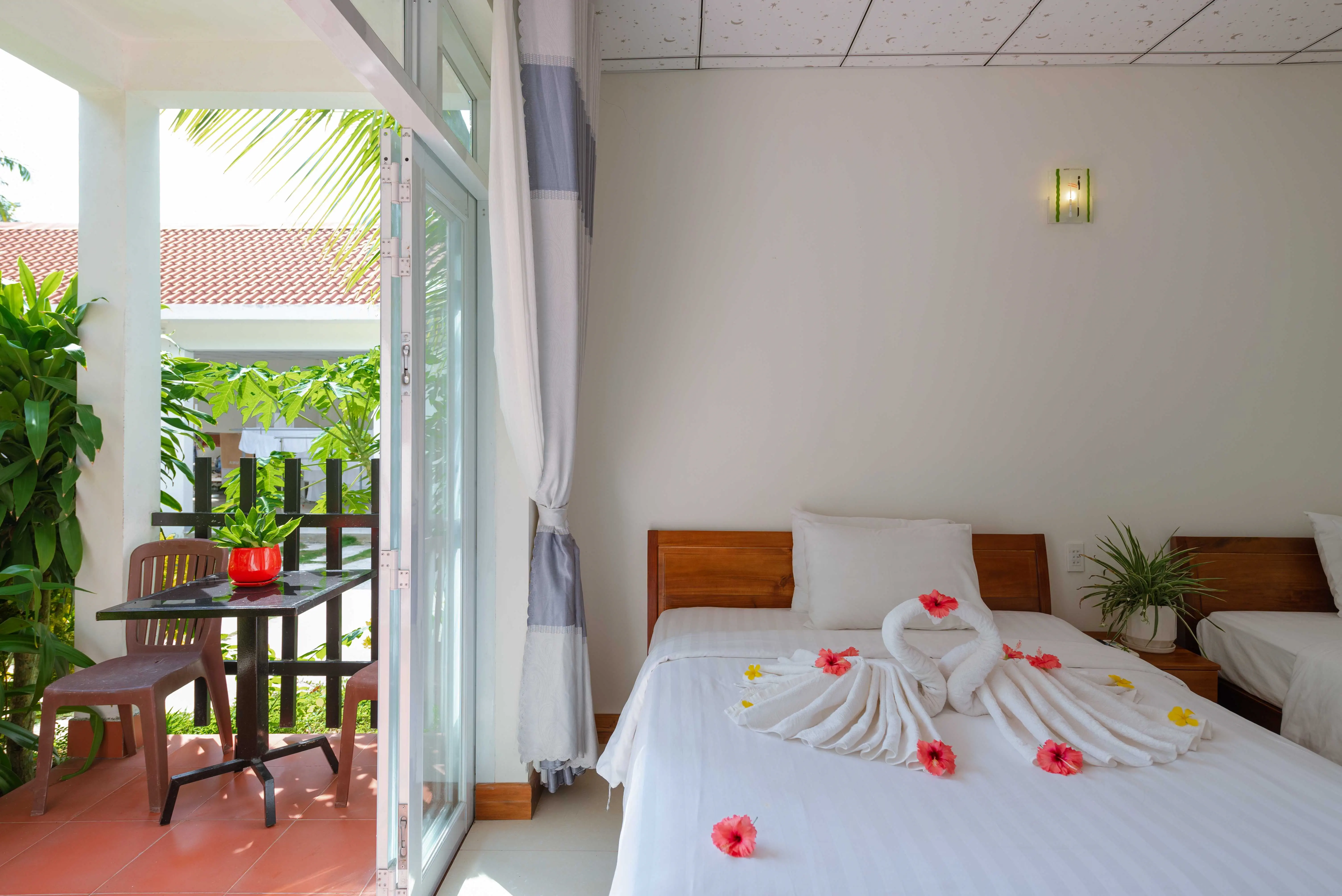 Dla max. 3 osób, Przestrzeń zewnętrzna: Taras, Kanały telewizji: Angielski, prysznic, Powierzchnia pokoju: ok. 35 m2, Rodzaj podłogi: płytki, Sprzątanie codziennie, 1 sypialnia, Maksymalna liczba osób dorosłych: 2, Maksymalna liczba dzieci: 2, Widok na ogród i basen,Widok na ogród,Widok na basen, Liczba łazienek: 1, Liczba toalet: 1, Zestaw do parzenia kawy i herbaty, Klimatyzacja: Klimatyzacja indywidualna