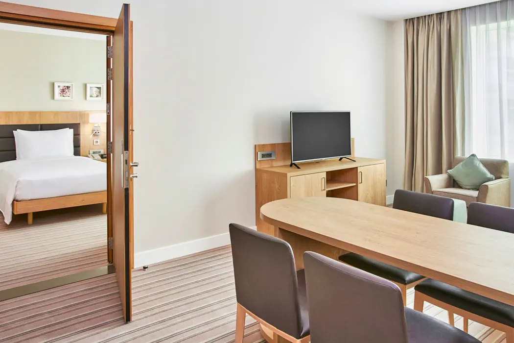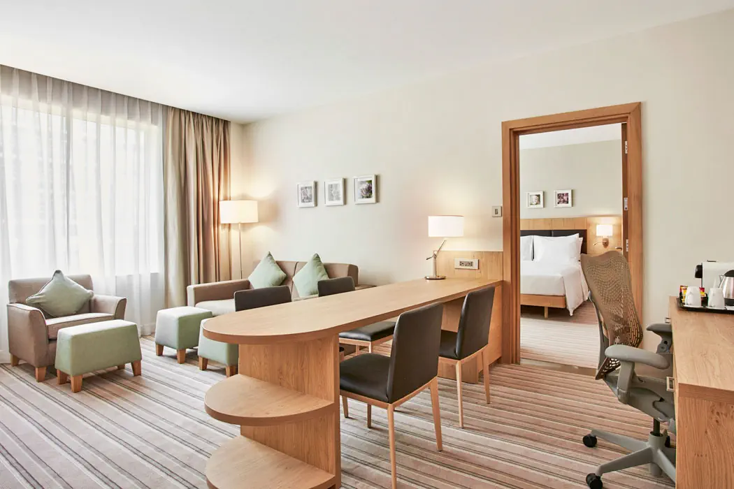 Zlokalizowane są w budynku głównym (liczba pięter: 6, liczba wind: 4) Typy pokoi: - pokoje guest dla max. 4 os.: 1 sypialnia, klimatyzacja indywidualna, sejf (bezpłatny), zestaw do parzenia kawy/herbaty (bezpłatny), minibar (płatny, uzupełniany codziennie), TV, telefon, łazienka (wanna, WC) - pokoje przystosowane dla osób niepełnosprawnych dla max. 2 os.: 1 sypialnia, drzwi łączące między pokojami, klimatyzacja centralna, sejf (bezpłatny), zestaw do parzenia kawy/herbaty (bezpłatny), minibar (płatny, uzupełniany codziennie), TV, telefon, łazienka (prysznic, WC) - suity dla max. 4 os.: salon, 1 sypialnia, drzwi łączące między pokojami, klimatyzacja centralna, sejf (bezpłatny), zestaw do parzenia kawy/herbaty (płatne), minibar (płatny, uzupełniany codziennie), TV, telefon, łazienka (wanna, WC) - suity dla max. 6 os.: jadalnia, 2 sypialnie, drzwi łączące między pokojami, dostęp do współdzielonego basenu, klimatyzacja indywidualna, sejf (bezpłatny), zestaw do parzenia kawy/herbaty (bezpłatny), minibar (płatny, uzupełniany codziennie), TV, telefon, bezpłatna pralnia, łazienka (wanna lub prysznic, WC)
