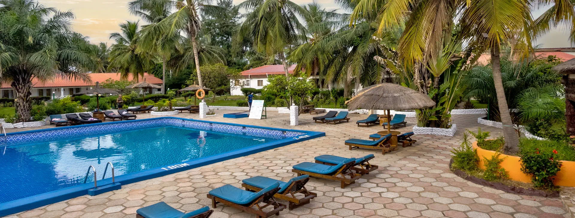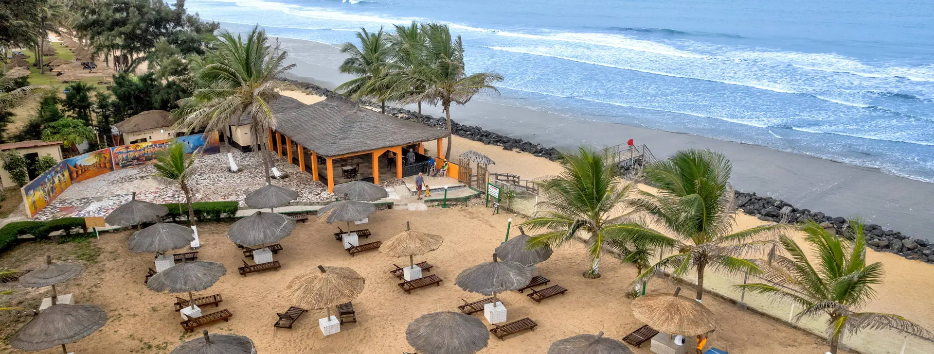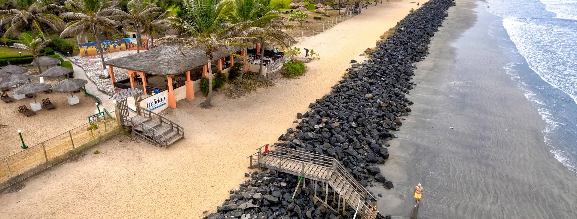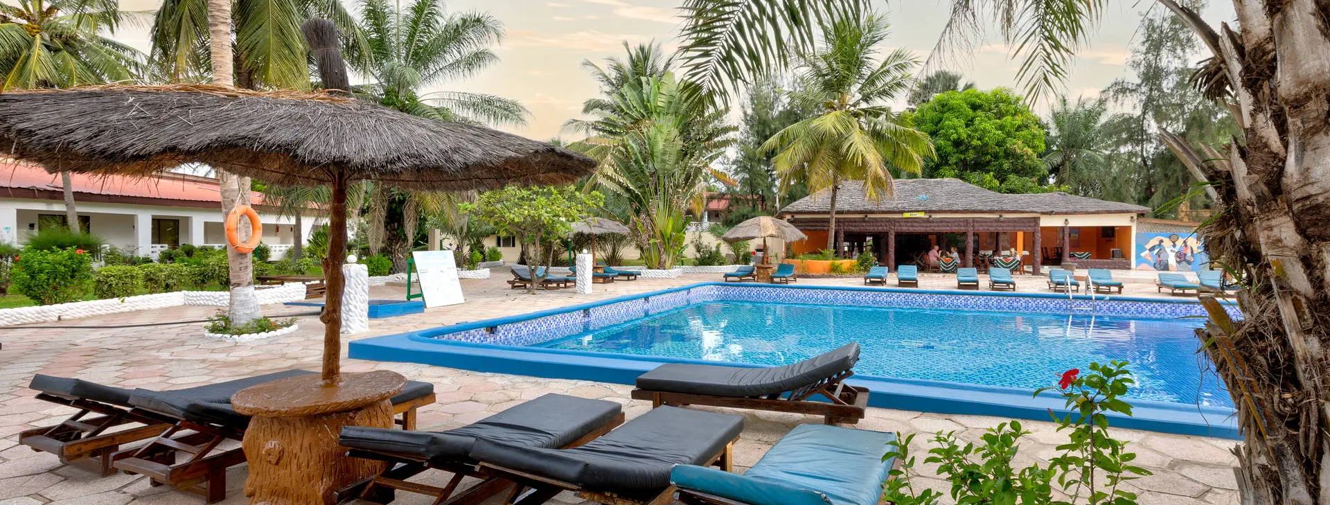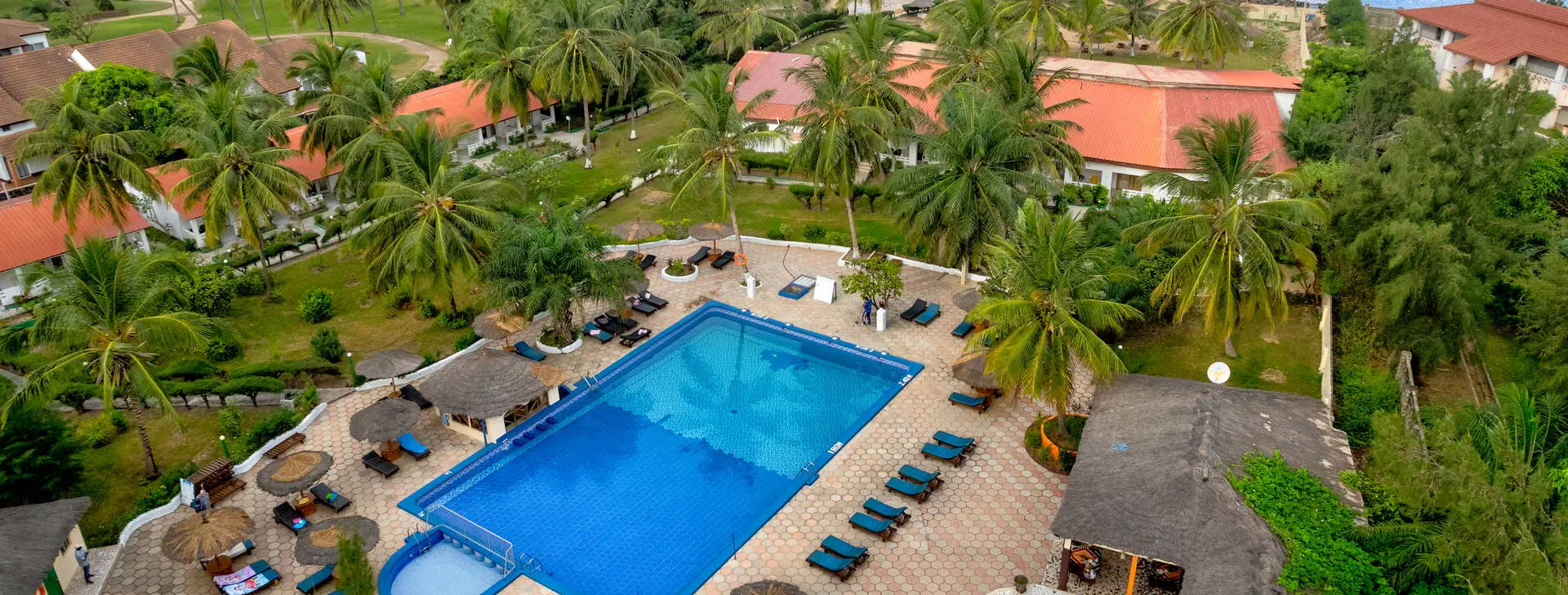 Położenie: Doskonale położony, w samym centrum najbardziej rozwiniętego kurortu jakim jest Kololi. Hotel otoczony jest zadbanym ogrodem, który sprzyja relaksowi, a jednocześnie mamy dosłownie kilka kroków do centrum Kololi, gdzie znajdziemy liczne sklepiki, bazar z pamiątkami, bary, kluby, czy dyskoteki. W okolicy znajdują się najlepsze w okolicy kluby z muzyką na żywo, gdzie codziennie odbywają się koncerty zespołów z Gambii, Senegalu, czy Ghany. W pobliżu znajduje się Park Narodowy Bijilo, w którym można oglądać małpy i ciekawe ptaki. Polecamy wizytę w pobliskim hotelu Senegambia, gdzie codziennieo 11:30 odbywa się karmienie sępów. Odległość od lotniska ok. 20 km, transfer trwa ok. 30 min. Plaża: Hotel usytuowany jest bezpośrednio przy piaszczystej plaży. Serwis plażowy - bezpłatny. Do dyspozycji gości: Hotel składa się z kilku parterowych budynków oraz z dwóch piętrowych budynków, otoczonych zadbanym, tropikalnym ogrodem. Recepcja czynna 24 - godz., restauracja, bar przy basenie, bar z przekąskami na plaży, sejf w recepcji (płatny 11 euro /tydzień), ogród, taras słoneczny, bezpłatne leżaki i parasole przy basenie. Pokoje: Hotel oferuje łącznie około 80 pokoi. Funkcjonalne pokoje 2-osobowe typu standard (możliwość 1 dostawki dla osoby dorosłej lub dla dziecka), z łazienką (prysznic, WC). Wyposażone w lodówkę (za opłatą - ok. 25 euro/tydzień), balkon lub taras. Pokoje są wyposażone w klimatyzację za dopłatą (ok. 15 euro/dzień/pokój) Wyżywienie: Śniadania kontynentalne w formie bufetu. Za dopłatą obiadokolacje - serwowane, składające się z przystawki, dania głównego i deseru (najczęściej owoce). Napoje do obiadokolacji dodatkowo płatne. Program sportowy i animacyjny: Na terenie hotelu basen zewnętrzny z wydzieloną częścią dla dzieci, tenis stołowy, siatkówka. Odpłatnie: masaż, sporty wodne na plaży. Internet: Z Internetu można korzystać jedynie przy recepcji – odpłatnie, ok.3 euro/dzień. Kategoria lokalna: ** Strona www: www.holidaybeachclubgambia.com Naszym zdaniem: Najlepsze położenie hotelu, przy plaży i w samym centrum kurortu jest zachętą do korzystania z miejscowych atrakcji. Dodatkową gwiazdkę przyznajemy właśnie za lokalizację.