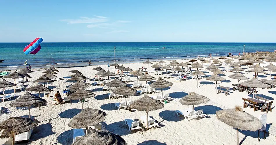 Piaszczysta, w odległości ok. 100 m od hotelu Stopniowe wejście do morza Dojście do plaży lokalną ścieżką przez teren hotelu Leżaki i parasole - bezpłatne Ręczniki plażowe dostępne po wpłaceniu depozytu w wysokości ok. 20 TND Bar na plaży - bezpłatny (czynny w wysokim sezonie od 10:00 do 18:00 w zależności od warunków pogodowych, tylko napoje bezalkoholowe) Wi-Fi na plaży - bezpłatne Bar Sunset - płatny