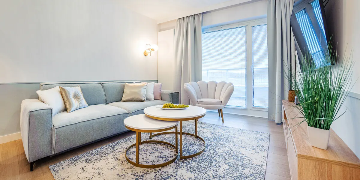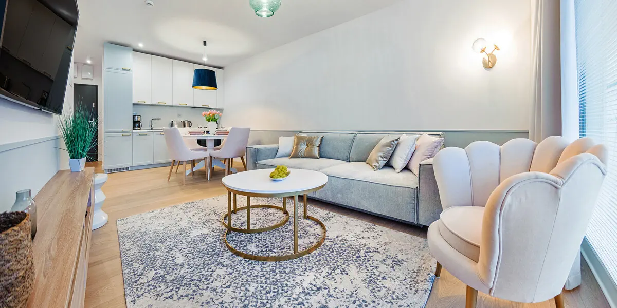 Nowoczesny apartament z oddzielną sypialnią, pokojem dziennym z aneksem kuchennym, kącikiem jadalnianym, TV i rozkładaną sofą, balkonem i łazienką. W wyposażeniu wifi, smart TV, część wypoczynkowa, zmywarka do naczyń, ekspres do kawy, czajnik, płyta indukcyjna, lodówka, prysznic, ręczniki, szlafroki, suszarka do włosów, zestaw kosmetyków i pralka.