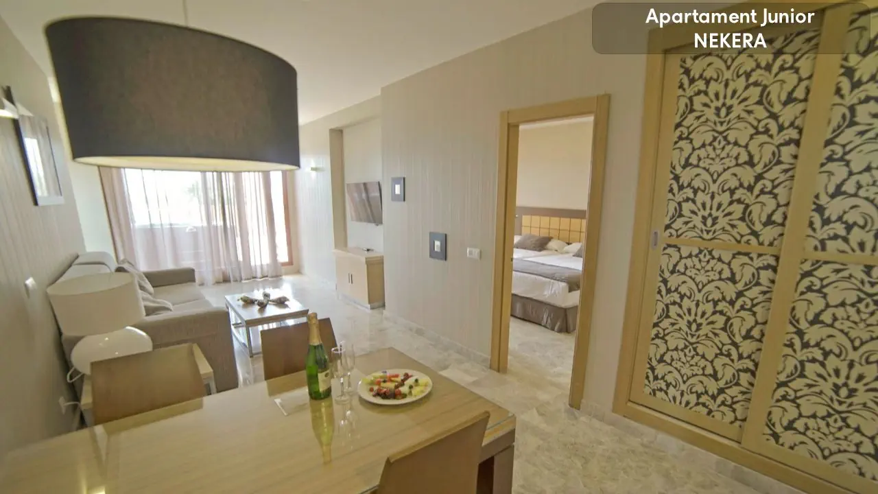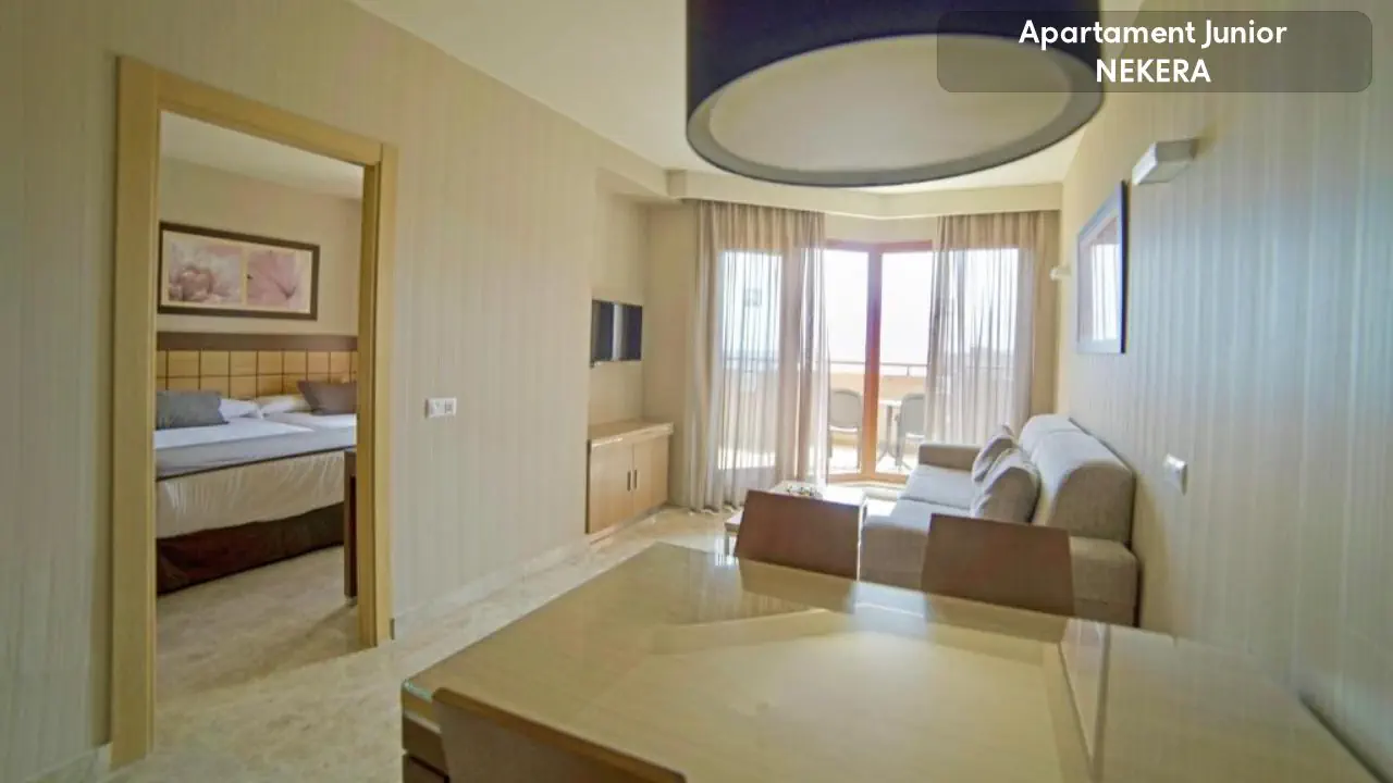 Apartament Junior z widokiem na morze - maksymalnie dla 4 osób - sypialnia z dwoma łóżkami pojedynczymi - osobny salon z rozkładaną sofą - łazienka z prysznicem i wanną - taras z widokiem na morze - WiFi - klimatyzacja - aneks kuchenny - lodówka - kuchenka mikrofalowa - biurko - sejf za dodatkową opłatą - telewizor - rozkładana sofa - suszarka do włosów - widok na morze Apartament Junior z bocznym widokiem na morze - dla maksymalnie 4 osób - powierzchnia ok. 60m2 - salon z rozkładaną sofą - sypialnia z dwoma łóżkami pojedynczymi - prywatna łazienka z prysznicem i wanną - taras z bocznym widokiem na morze - poza tym wyposażony tak jak apartament Junior z widokiem frontalnym Apartament Junior - dla maksymalnie 4 osób - powierzchnia ok. 60m2 - salon z rozkładaną sofą - sypialnia z dwoma łóżkami pojedynczymi - taras - brak widoku - poza tym wypsoażony tak jak pozostałe