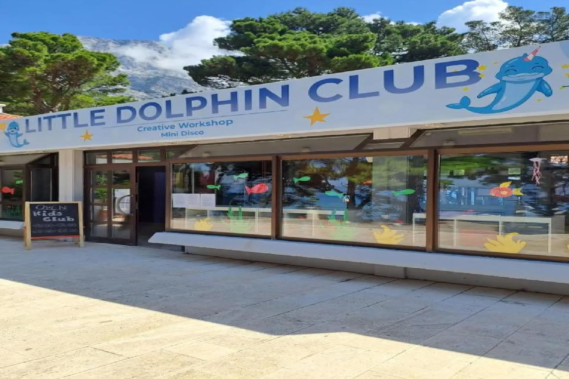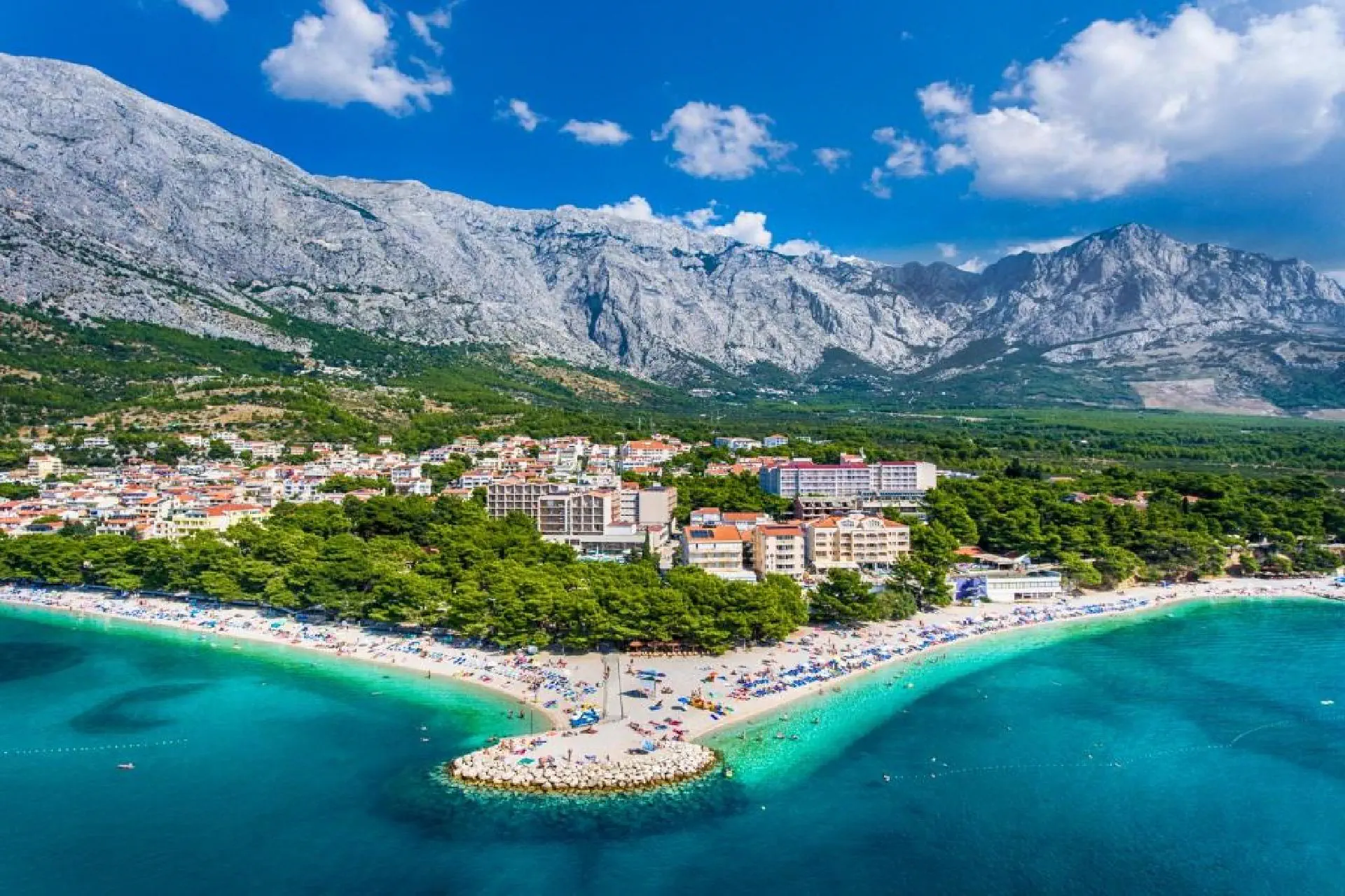 ok. 200 m od centrum miejscowości Baska Voda, na Riwierze Makarskiej, w otoczeniu lasu sosnowego, wzdłuż promenady.