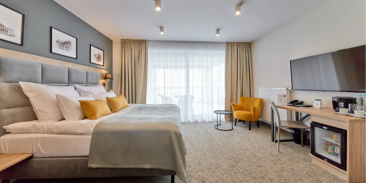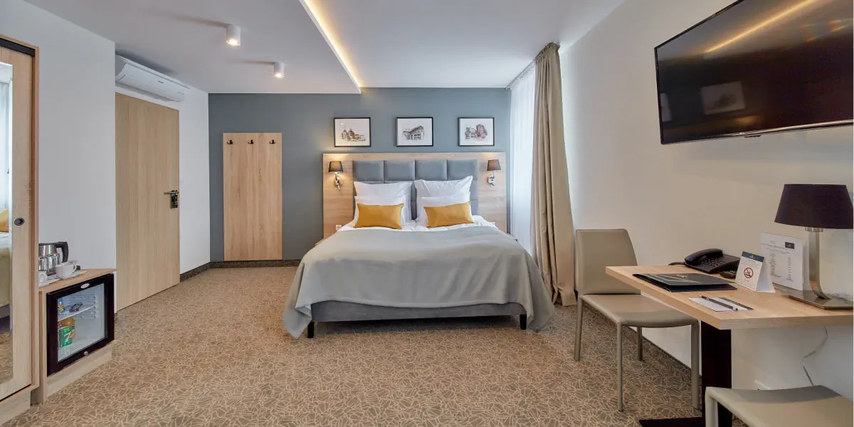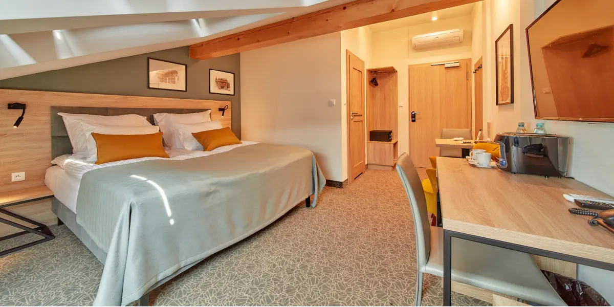 Komfortowo wyposażony, klimatyzowany pokój z większym łóżkiem, ekspresem do kawy, minibarem, klimatyzacją, telewizorem plazmowym, sejfem