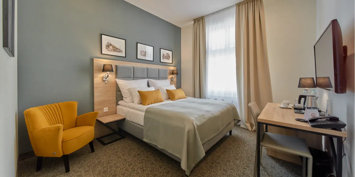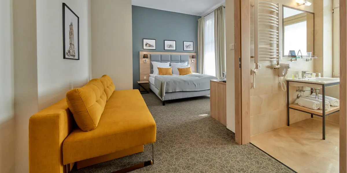 Komfortowo wyposażony, klimatyzowany pokój z ekspresem do kawy, minibarem, klimatyzacją, telewizorem plazmowym, sejfem