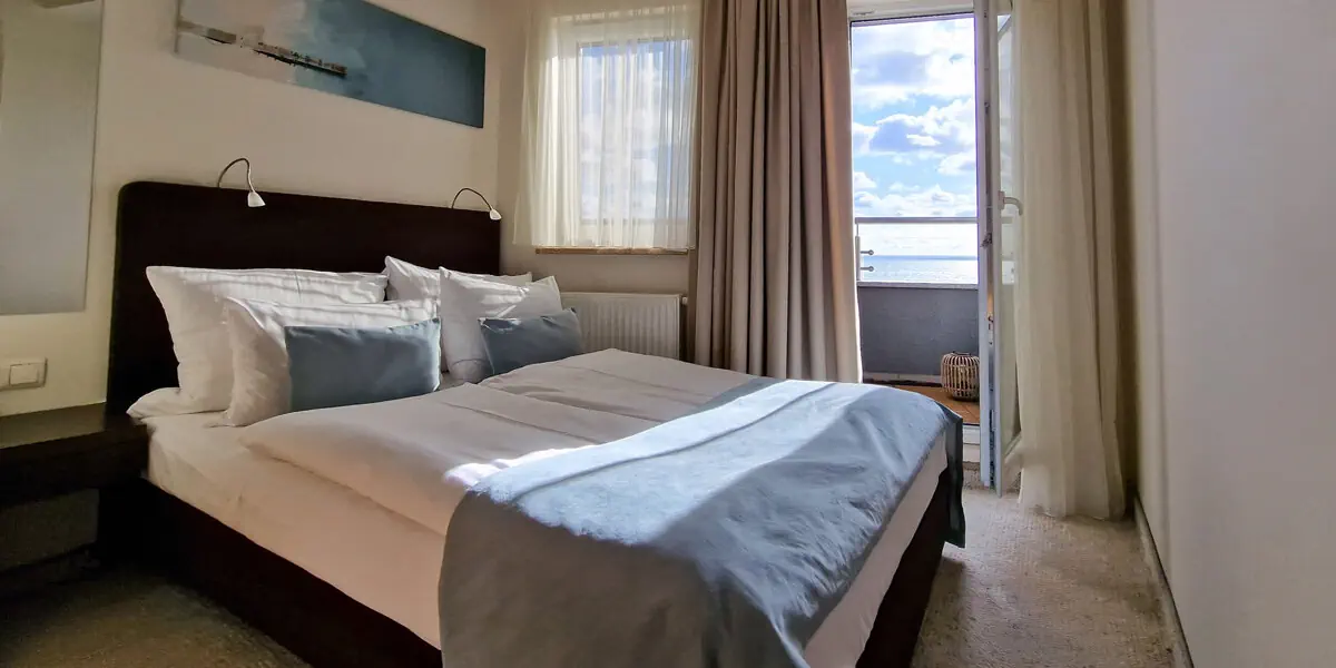 Komfortowy i przestronny pokój z balkonem z widokiem na Zatokę Pucką i łazienką oraz możliwością dostawki