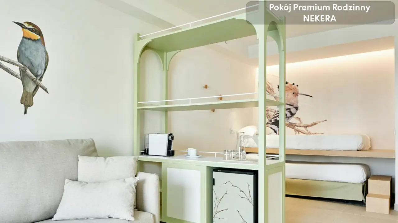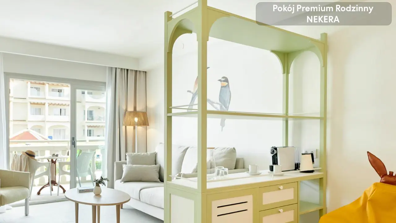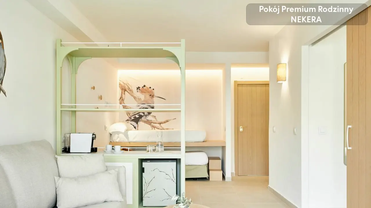 Pokój rodzinny premium - ok. 46 m² - Łóżka typu twin - Wysuwane łóżko Pokój rodzinny premium z widokiem na ogród - ok. 46 m² - Widok na ogród - Łóżka typu twin - Wysuwane łóżko - Łóżeczko dziecięce Pokój rodzinny z widokiem na basen - ok. 46 m² - Widok na basen - Łóżka typu twin - Wysuwane łóżko Pokój rodzinny z bocznym widokiem na morze - ok. 46 m² - Boczny widok na morze - Łóżka typu twin - Wysuwane łóżko Apartament - ok. 42 m² - Łóżko typu king size - Salon z sofą - TV - Łóżeczko na życzenie Apartament z widokiem na morze - ok. 42 m² - Widok na morze, położenie na wyższych piętrach - Łóżko typu king size - Sofa - Łóżeczko na życzenie Wyposażenie wspólne dla wszystkich pokoi balkon lub taras, część dzienna, bezpłatne WiFi, klimatyzacja, TV, łazienka z prysznicem, suszarka, minibar dodatkowo płatny, sejf.