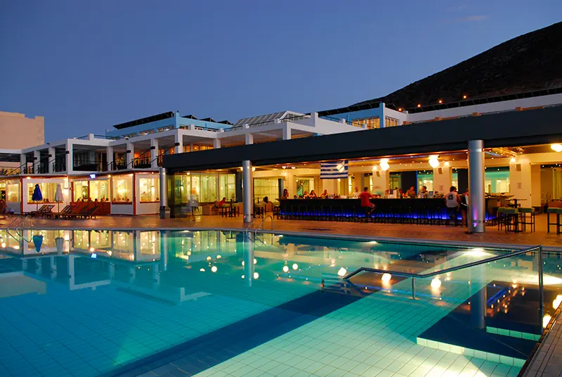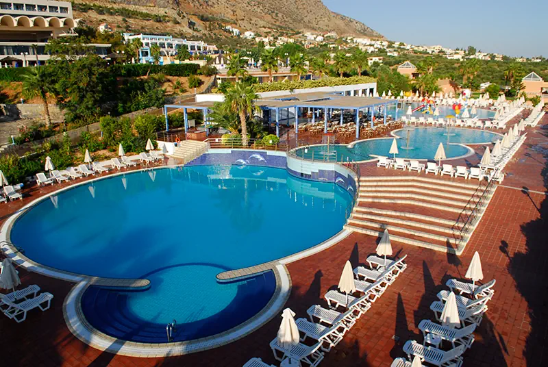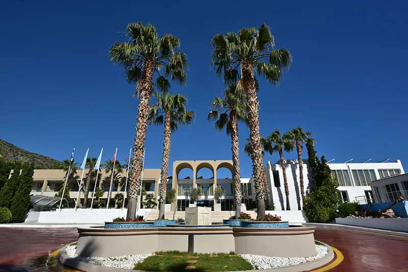 343 pokoje w budynku głównym i bocznym, lobby z recepcją, windy, restauracja główna, restauracje a'la carte, bar z przekąskami. W ogrodzie dwa baseny z wodą morską.