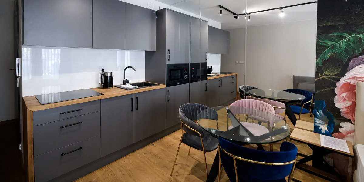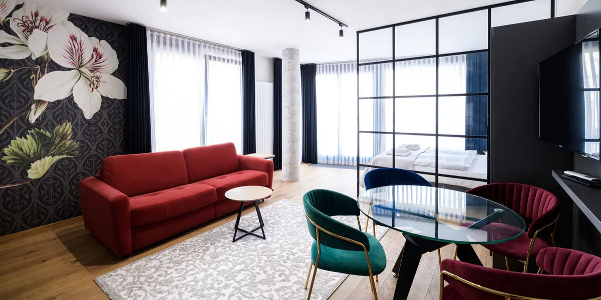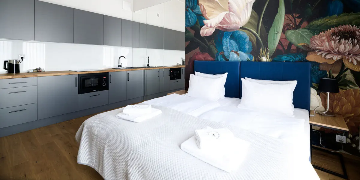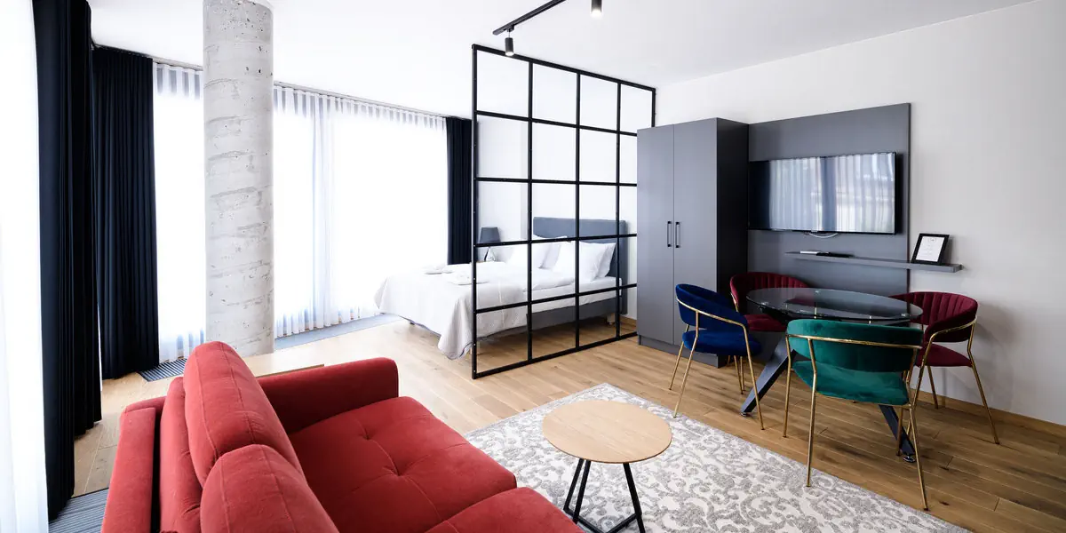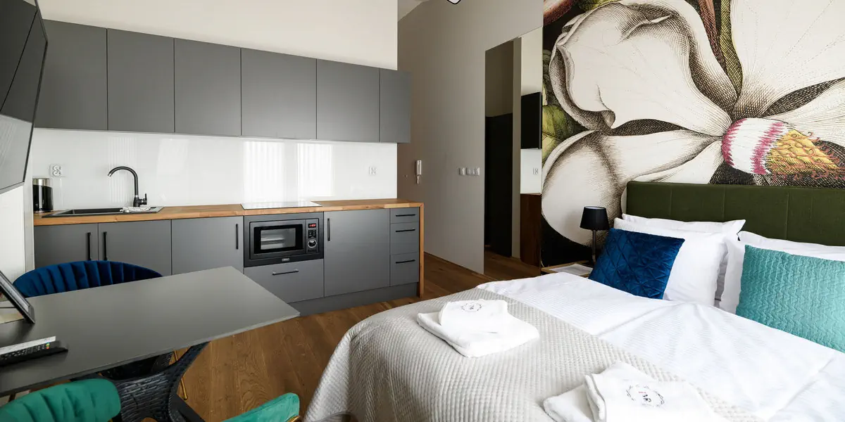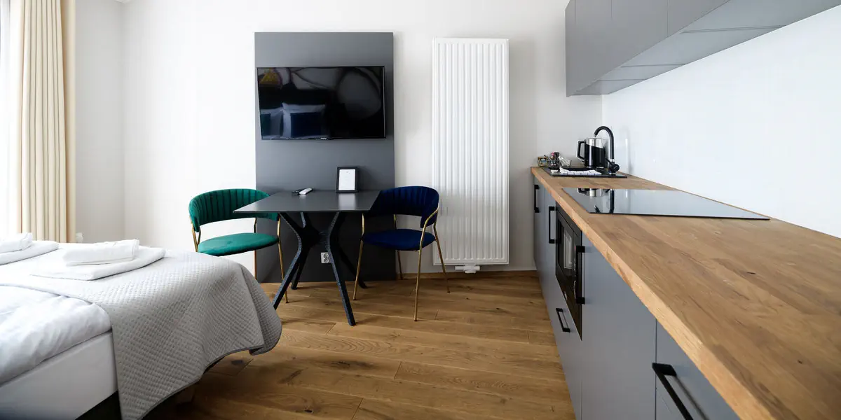 Klimatyzowany apartament z tarasem, oddzielną sypialnią i salonem z aneksem kuchennym