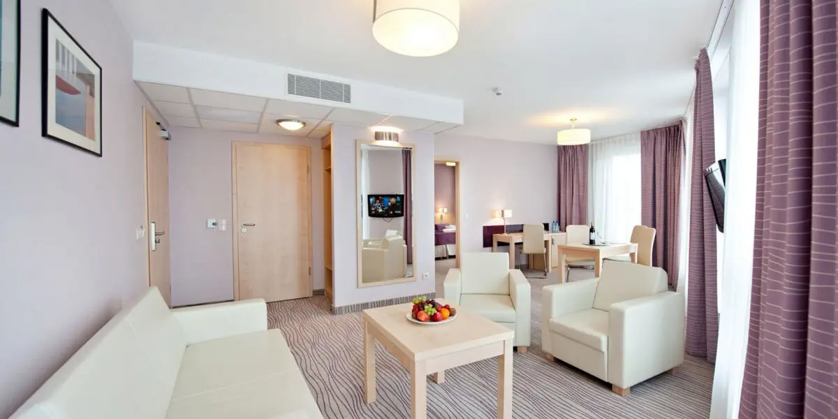 Apartament wyposażony w miękkie fotele oraz – na życzenie - dodatkową wygodną sofę. Klimatyzowany, z dostępem do internetu, a także z telefonem, TV oraz radiem. Łazienka z nowoczesną armaturą oraz suszarką.