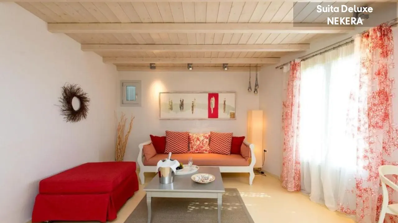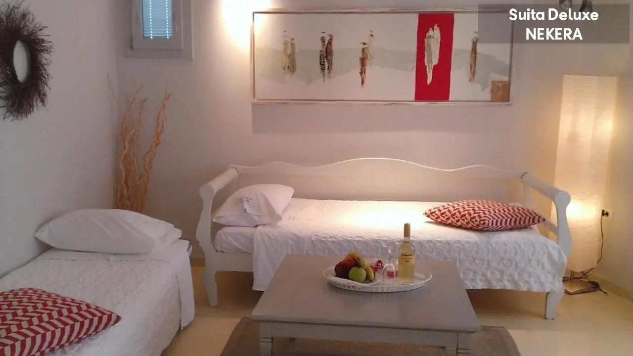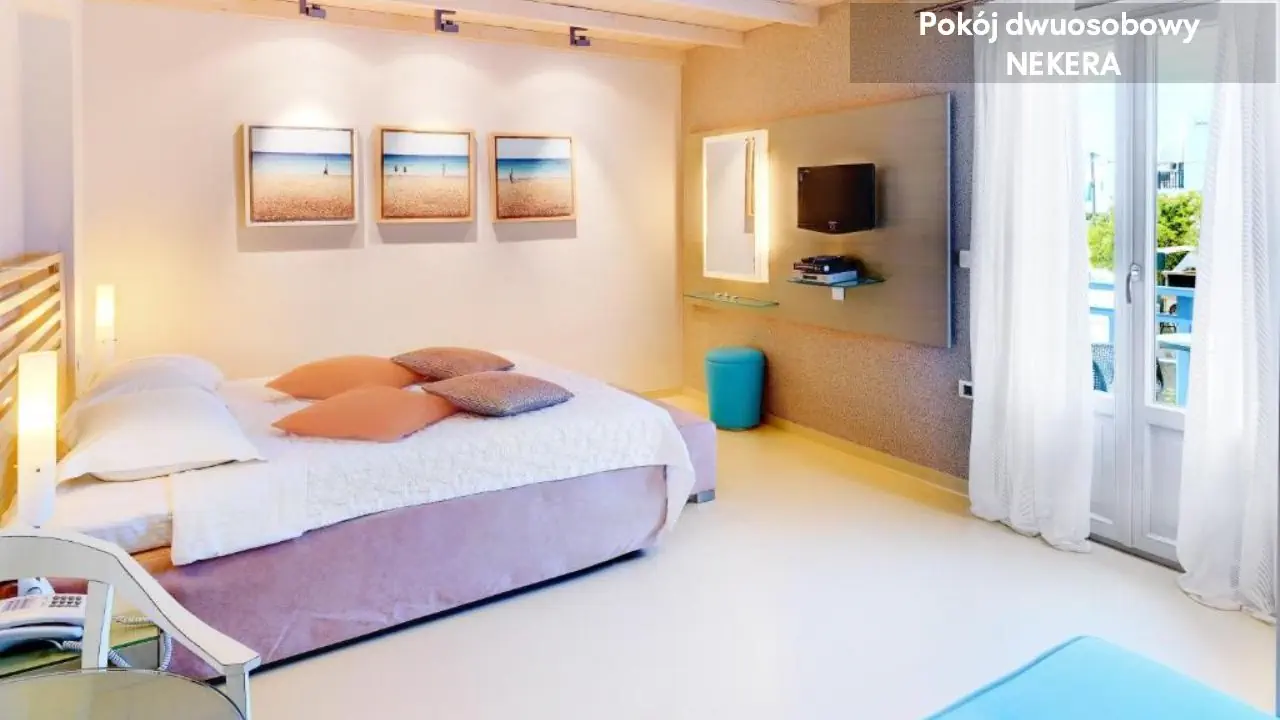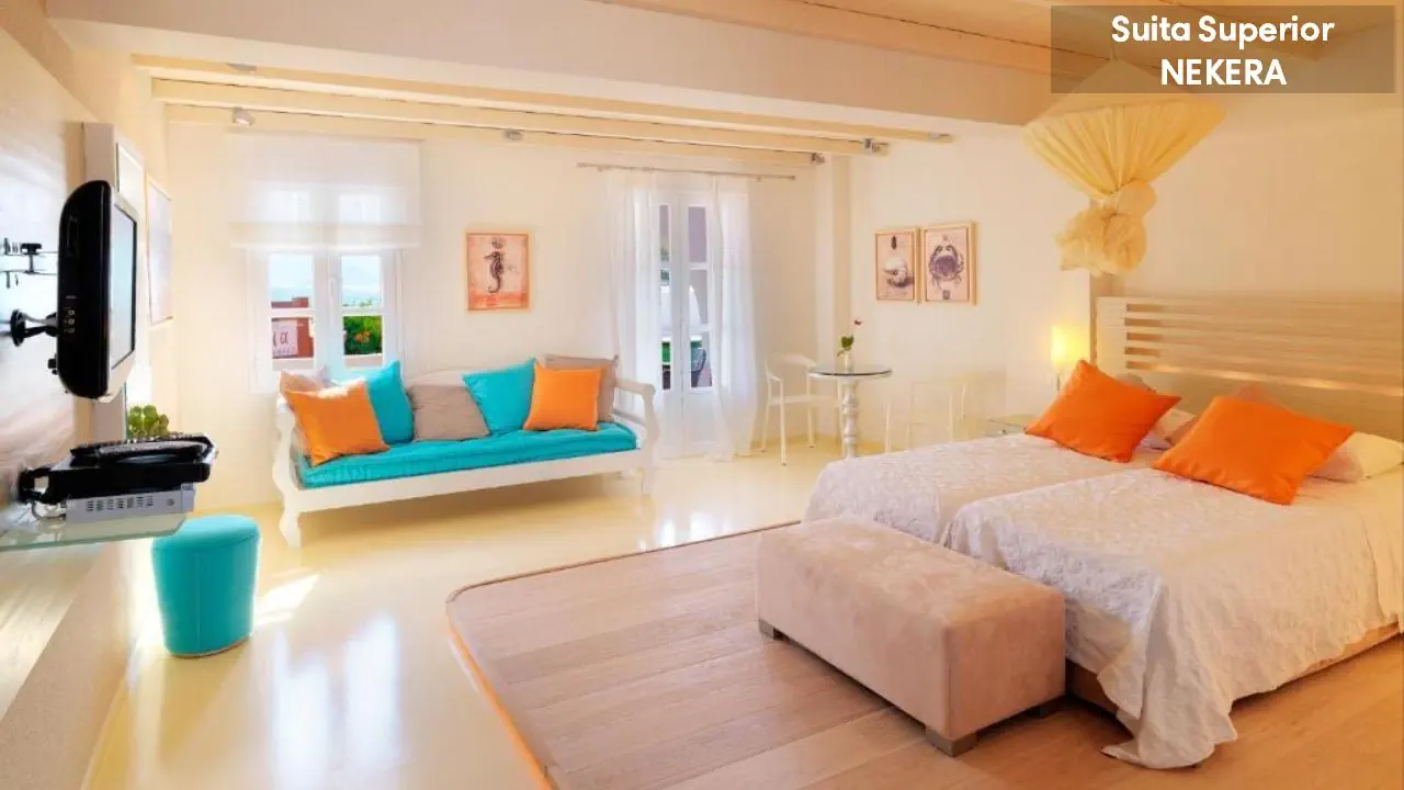 Pokój dwuosobowy STANDARD DOUBLE: mogący zakwaterować 2 osoby; jedno łóżko podwójne lub dwa łóżka pojedyńcze; łóżeczko dziecięce: po wcześniejszym uzgodnieniu; klimatyzacja; prywatna łazienka (prysznic, suszarka do włosów, toaleta, umywalka, lustro, zestaw minikosmetyków, ręczniki); zestaw do parzenia kawy i herbaty; TV; Wi-Fi; telefon; minilodówka; sejf (depozyt); balkon z widokiem na góry, ogród lub częściowym widokiem na morze; większość zlokalizowana na parterze/w przyziemiu. Pokój dwuosobowy większy z widokiem na morze DOUBLE SUBLIME: mogący zakwaterować 2 osoby; urocza weranda lub balkon/patio z widokiem na Morze Egejskie, w większości zlokalizowane na 2 piętrze, dojście tylko schodami; wyposażone tak, jak: Pokój dwuosobowy STANDARD DOUBLE. Suita Superior: mogący zakwaterować 2-4 osoby; pomieszczenie na otwartym planie z wydzieloną częścią sypialną (dwa łóżka pojedyncze lub jedno łóżko podwójne) i wypoczynkowo-sypialną z sofą; w większości zlokalizowane na 1 piętrze, dojście tylko schodamii; wyposażone tak, jak: Pokój dwuosobowy większy z częściowym widokiem na morze DOUBLE SUBLIME. Suita Deluxe: mogący zakwaterować 2-4 osoby; pomieszczenie z wydzieloną częścią sypialną z jednym łóżkiem podwójnym lub dwoma łóżkami pojedynczymi i wypoczynkowo-sypialną z sofą i/lub fotelem oraz dodatkową sypialnią z dwoma łóżkami pojedynczymi; kapcie; szlafrok; prysznic; przestronna umeblowana weranda z widokiem na Morze Egejskie i niewielki port Agia Anna; wyposażone tak, jak: Pokój dwuosobowy większy z widokiem na morze DOUBLE SUBLIME. Sutia Honeymoon: ok. 30 m²; mogąca zakwaterować 2 osoby; pomieszczenie na otwartym planie z wydzieloną częścią sypialną (dwa łóżka pojedyncze lub jedno łóżko podwójne) i wypoczynkowo-sypialną; prysznic lub/i wanna; przestronna umeblowana weranda z widokiem na Morze Egejskie i niewielki port Agia Anna; wyposażone tak, jak: Pokój dwuosobowy większy z widokiem na morze DOUBLE SUBLIME.