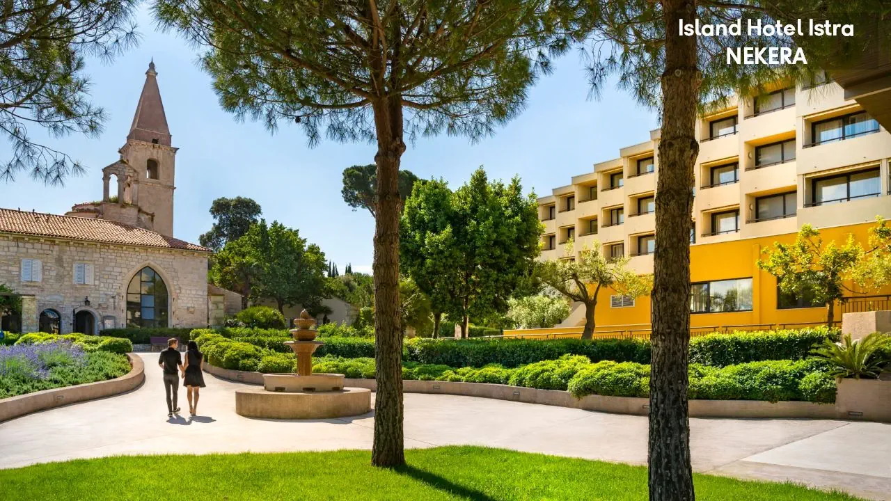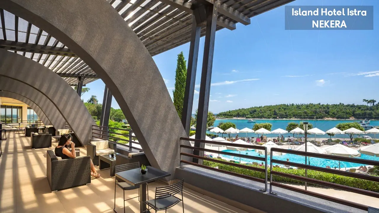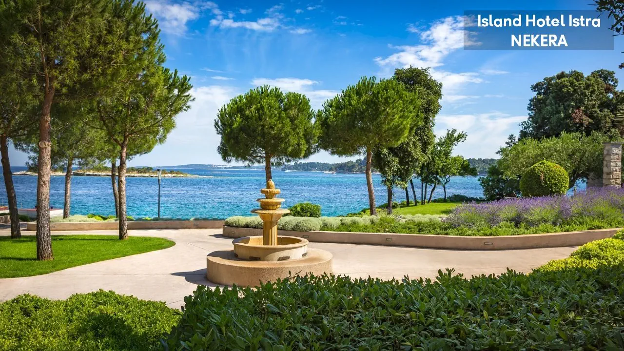 ok. 1,5 km od centrum Rovinj (łódką), ok. 50 m od żwirowo - kamienistej plaży z betonowymi platformami, parasole i leżaki za opłatą.