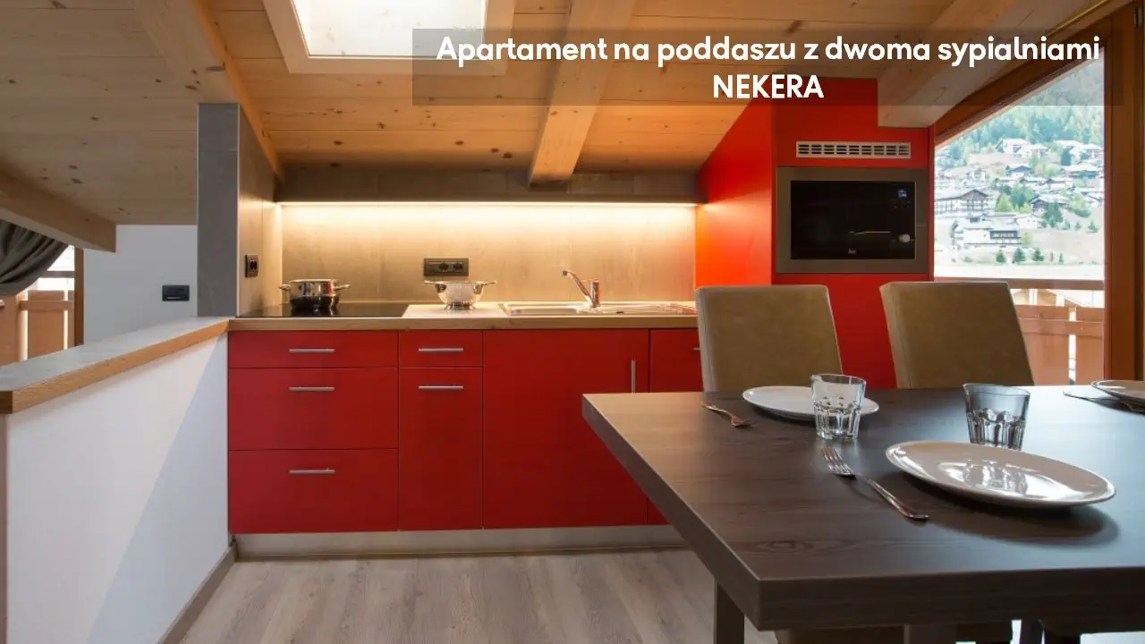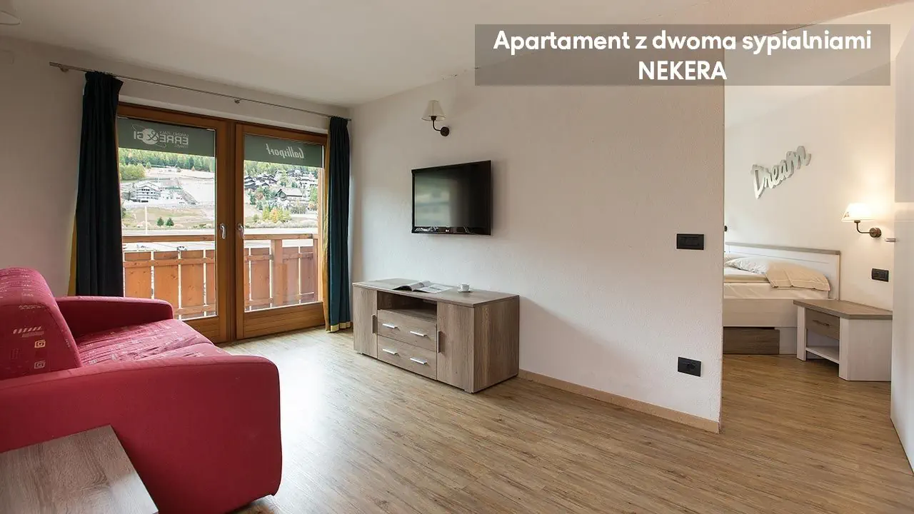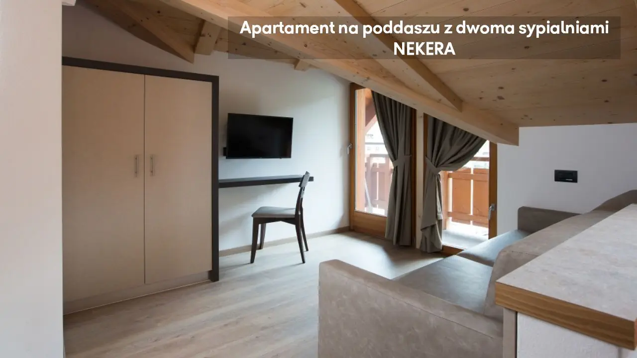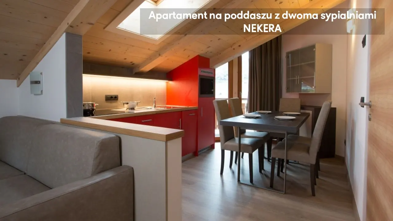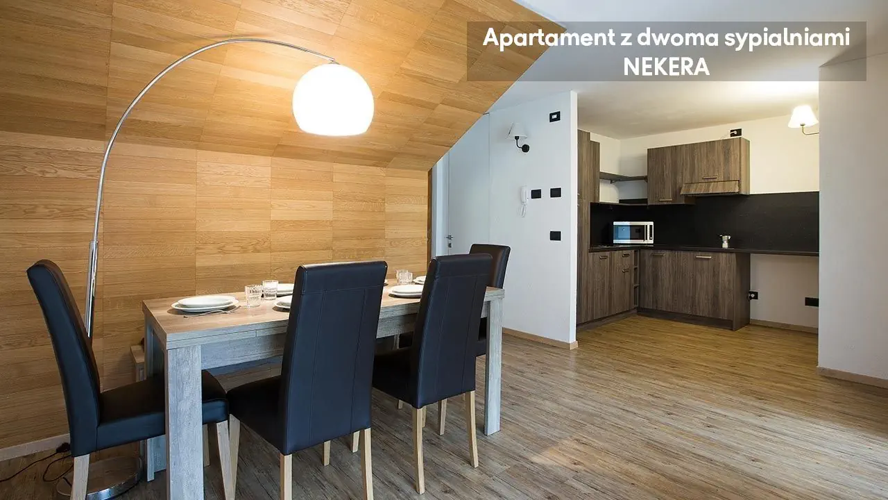 Apartament z dwoma sypialniami: ok. 66 m2, położony na parterze, mogący zakwaterować do sześciu osób, dwie sypialnie z łóżkami podwójnymi i pokój dzienny z sofą i aneksem kuchennym (kuchenka, mikrofala, zmywarka, czajnik), TV, prywatna łazienka (prysznic, toaleta, umywalka, suszarka do włosów), taras ze stolikiem i krzesełkami. Apartament na poddaszu z dwoma sypialniami: ok. 58 m2, mogący zakwaterować do pięciu osób, położony na drugim piętrze, na poddaszu, dwie sypialnie z łóżkami podwójnymi lub pojedynczymi i pokój dzienny z sofą jednoosobową, balkon; poza tym wyposażony jak apartament z dwoma sypialniami.