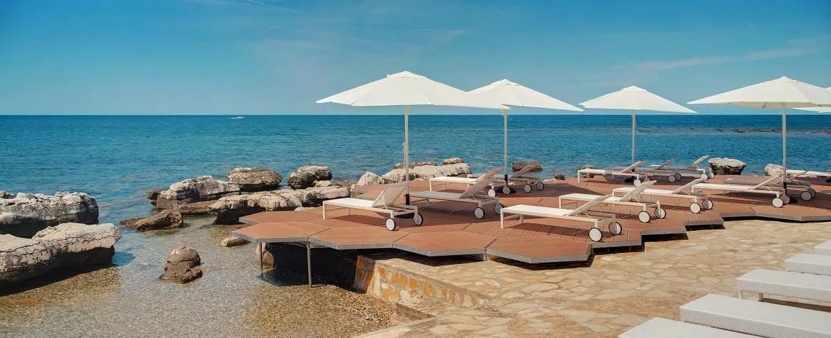 plaże o zróżnocowanym podłożu (kamienista, naturalna, żwirowa, platformy kąpielowe) w odległości 50-500 m. od ośrodka. Piaszczysta plaża "Pinia" na terenie Stella Maris oddalona o ok. 500 m. Leżaki, parasole słoneczne za opłatą.