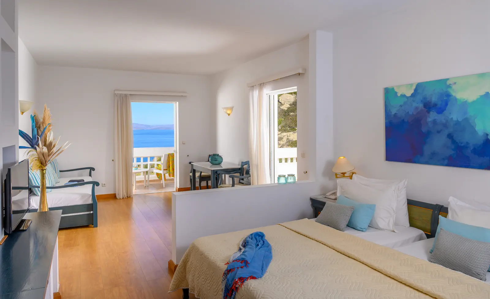 Dla max. 4 osób, Przestrzeń zewnętrzna: Balkon lub taras, Kanały telewizji: Angielski, Telefon w pokoju, wanna, Powierzchnia pokoju: ok. 32 m2, Dostawka: sofa, Rodzaj podłogi: laminat, Sprzątanie codziennie, 1 sypialnia, Maksymalna liczba osób dorosłych: 3, Maksymalna liczba dzieci: 2, Widok na morze, Liczba łazienek: 1, Liczba toalet: 0, Klimatyzacja: Klimatyzacja indywidualna