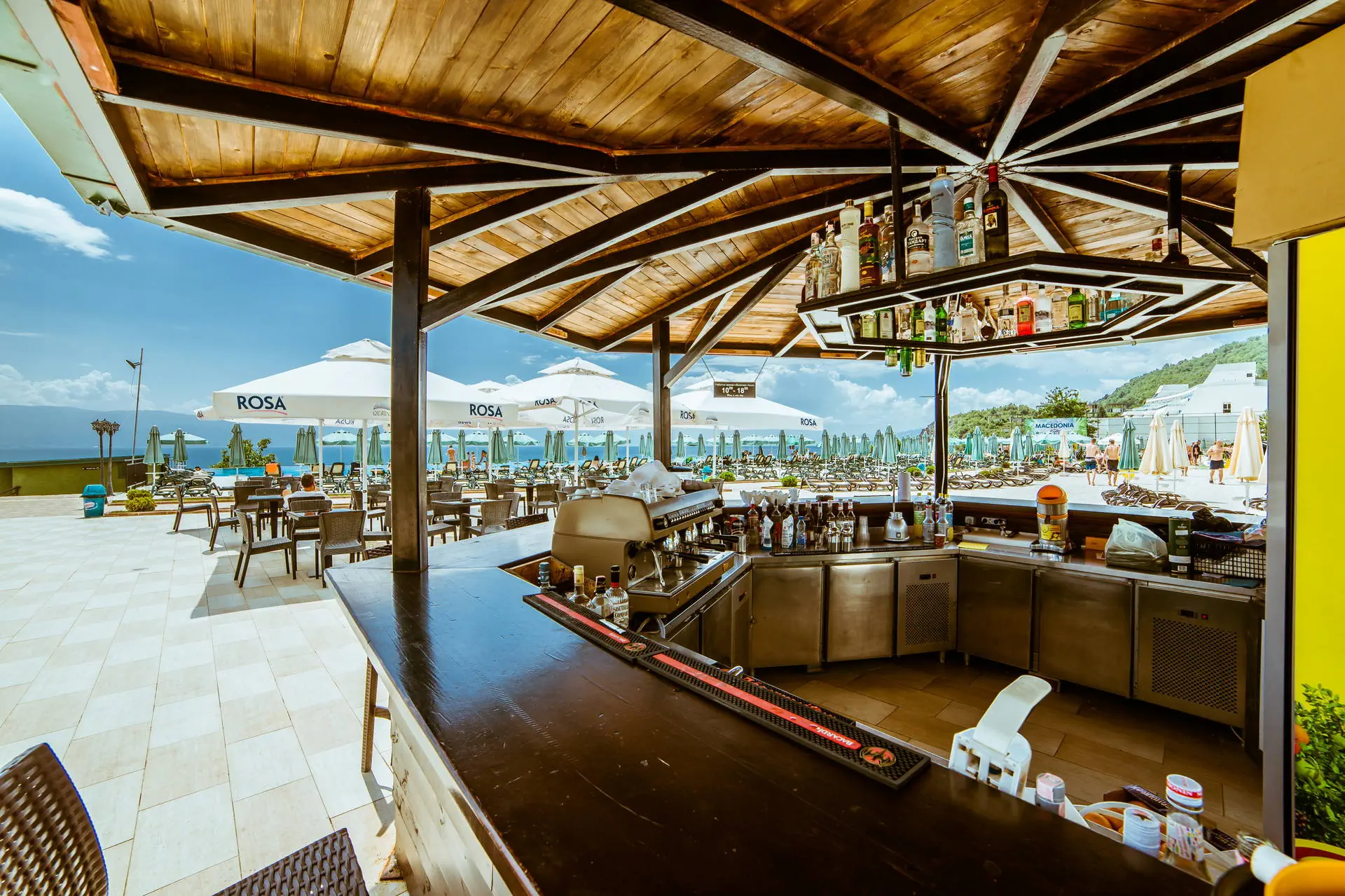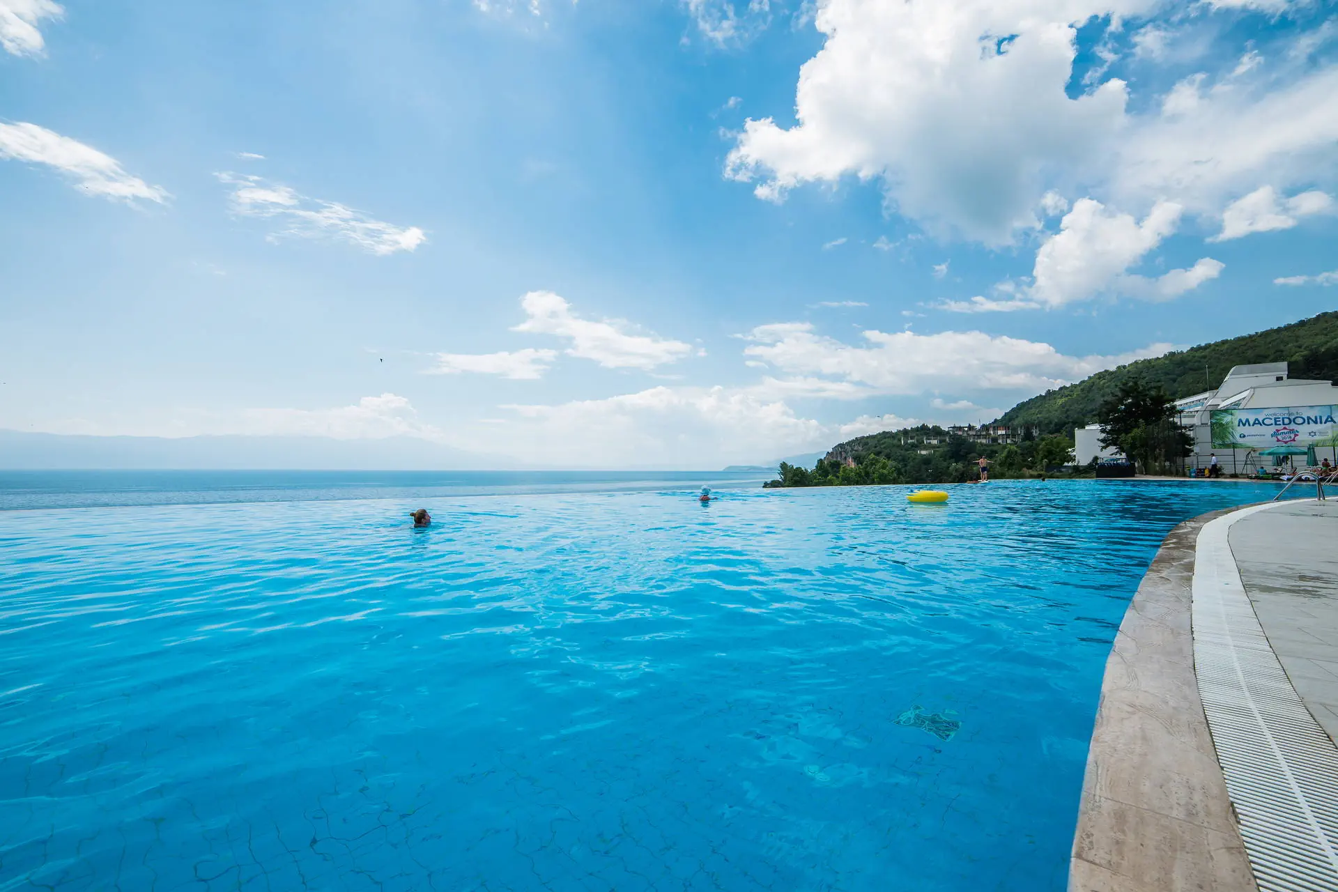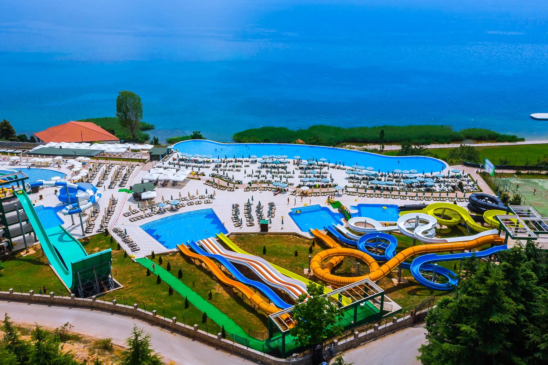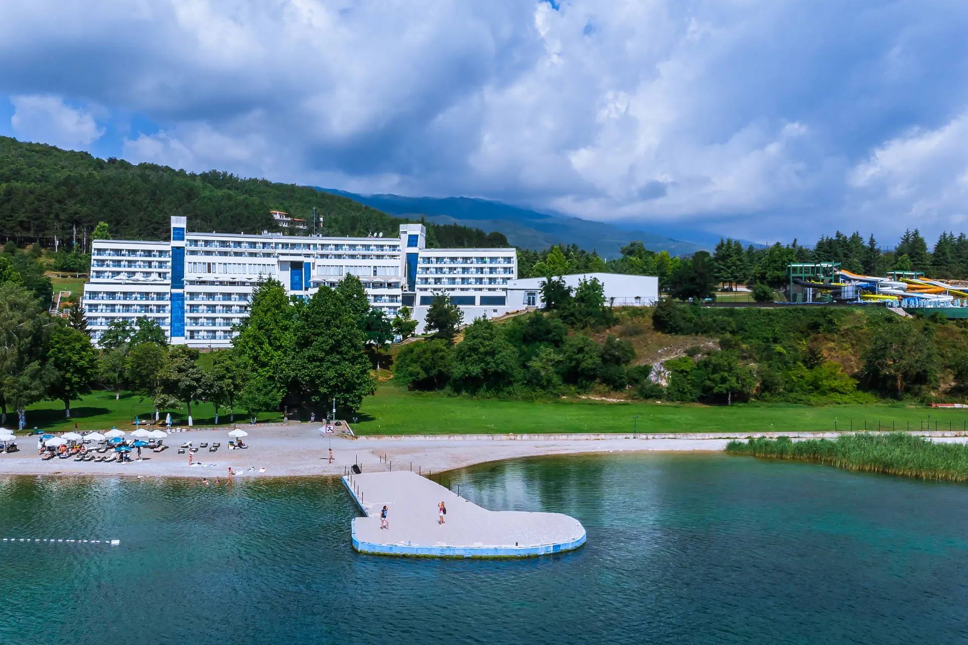 Położenie Ekskluzywny hotel składający się z ośmiopiętrowego, piramidalnie zaprojektowanego budynku głównego, położony na rozległym terenie bezpośrednio nad Jeziorem Ochrydzkim w pobliżu miejscowości Struga. Hotel posiada jeden z największych (17 000 m2) Aquaparków w regionie. Urządzony jest w eleganckim a zarazem nowoczesnym stylu. Otoczony bujną zielenią kompleks, pozwala na błogi relaks w upalne bałkańskie dni. Do centrum Strugi ok. 7 km (przystanek autobusowy przy hotelu - ok. 1 EUR/os, taxi ok. 2 EUR/os), do historycznej Ochrydy ok. 20 km, a do ochrydzkiego lotniska ok. 15km. Plaża Szeroka, piaszczysto – żwirkowa plaża z łagodnym zejściem do jeziora, bezpośrednio sąsiadująca z hotelem (ok. 200m). Na plaży i przy basenie bezpłatne leżaki i parasole. W sezonie bar na palży (płatny, czynny w godzinach (08:00-20:00)) Do dyspozycji gości Recepcja 24h, 4 windy, aquapark ze zjeżdżalniami (ok.10 o różnej wielkości dla dorosłych i dzieci; czynny sezonowo w zależności od pogody), duży lagunowy basen odkryty typu infinity ze słodką wodą oraz brodzik dla dzieci a także basen wewnętrzny, bezpłatne leżaki i parasole przy basenach i na plaży, boisko wielofunkcyjne (siatkówka, koszykówka), boisko do siatkówki plażowej, kort tenisowy, punkt wymiany walut, wypożyczalnia rowerów (dodatkowo płatna), sklep, bankomat. Restauracja główna z tarasem zewnętrznym i widokiem na jezioro, restauracja a la carte (płatna), beach bar (płatny), lobby bar oraz aquapark bar (płatny). Pokoje W hotelu znajduje się ok. 200 przestronnych i komfortowo wyposażonych pokoi 2 os. (z możliwością zakwaterowania 2 dzieci - drugie dziecko śpi z rodzicami; pokoje rodzinne na potwierdzenie) z łazienkami, które są wyposażone w WC, wannę lub prysznic, suszarkę do włosów, kosmetyki toaletowe, szlafroki, kapcie, zestaw do parzenia kawy i herbaty. Wszystkie pokoje posiadają balkon lub taras (stolik + krzesła), klimatyzację, TV SAT, telefon, sejf (bezpłatny), mini bar (za opłatą), bezpłatny dostęp do Wi-Fi. Pokoje z widokiem na las/góry lub na jezioro (za dodatkową opłatą). Wyżywienie Śniadania w formie bufetu (07:00-10:00), możliwa dopłata do obiadokolacji (19:00 - 21:30; napoje do obiadokolacji dodatkowo płatne, posiłki w formie bufetu). W hotelu dostępna jest również restauracja a'la carte (płatna; posiłki serwowane) czynna w porze lunchu (13:00-14:00) i kolacji (19:00 - 21:30). Program sportowy i animacyjny Goście hotelu mają bezpłatny, nielimitowany wstęp do aquaparku. W strefie welness (09:00-21:00): bezpłatnie basen wewnętrzny, sala fitness, łaźnia turecka oraz sauna; jacuzzi, masaże i solarium (dodatkowo płatne). Ponadto bezpłatnie: boiska do gry w siatkówkę, koszykówkę, tenisa oraz tenis stołowy, mini golf. Dla najmłodszych: atrakcje i zjeżdżalnie w aquaparku, brodzik, mini klub . Internet Wi-Fi dostępne bezpłatnie w całym obiekcie, również w pokojach. Kategoria lokalna ***** Naszym zdaniem Luksusowy hotel z bogatym zapleczem rekreacyjno-sportowym, ulokowany bezpośrednio przy jeziorze, zaspokoi oczekiwania wymagających klientów. Odpowiedni na komfortowe wakacje oraz rodzinny relaks i wypoczynek. Strona www