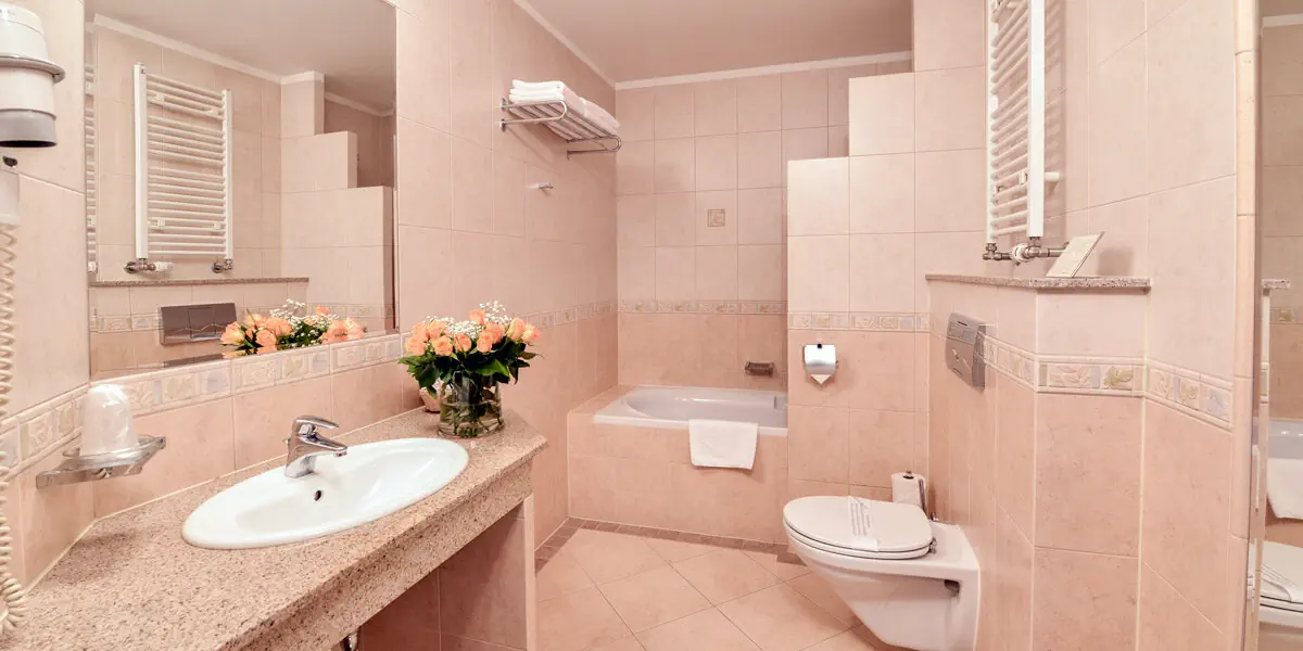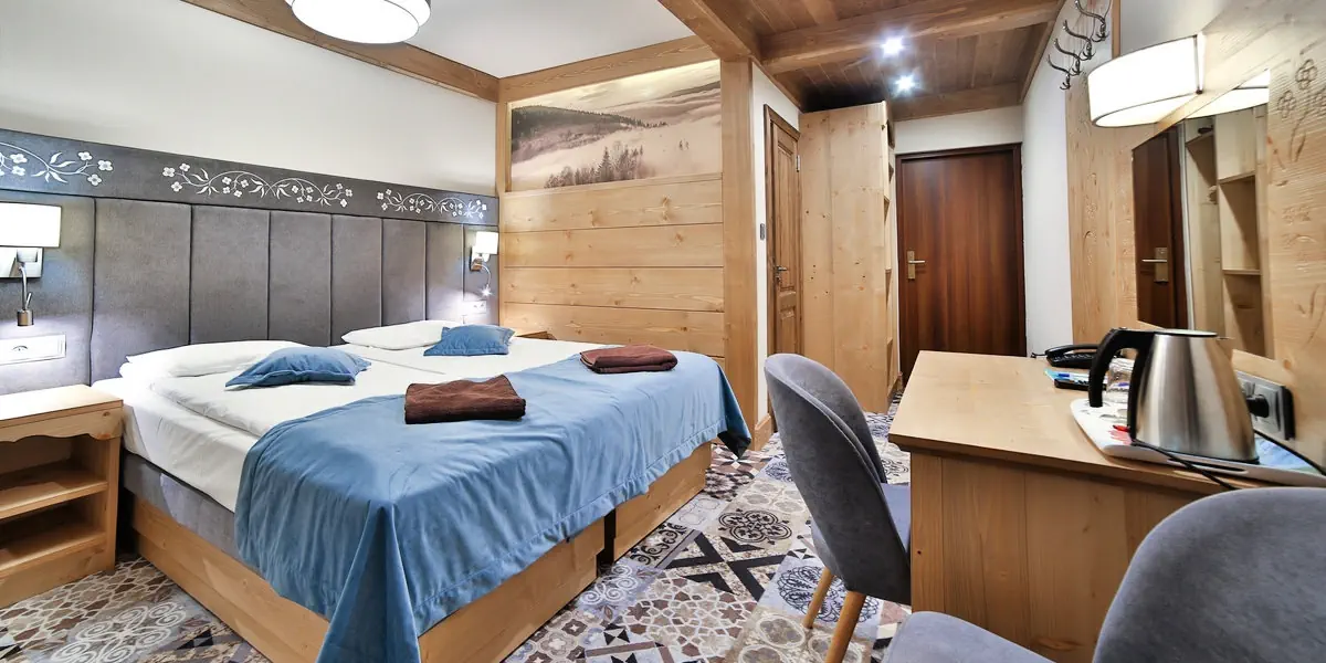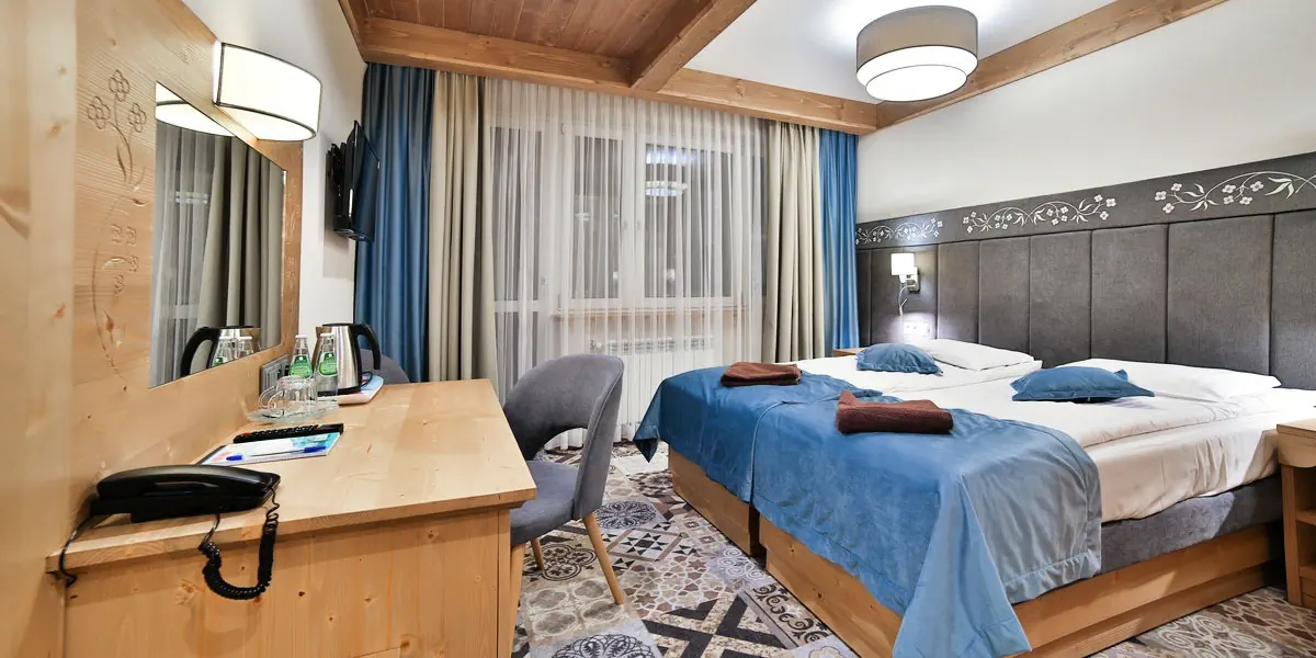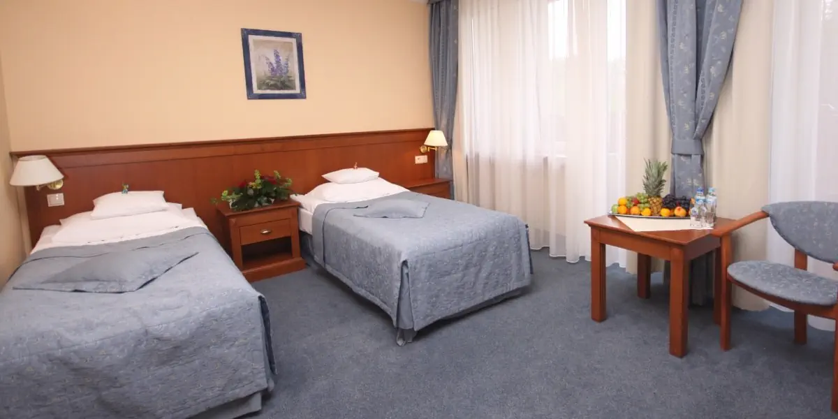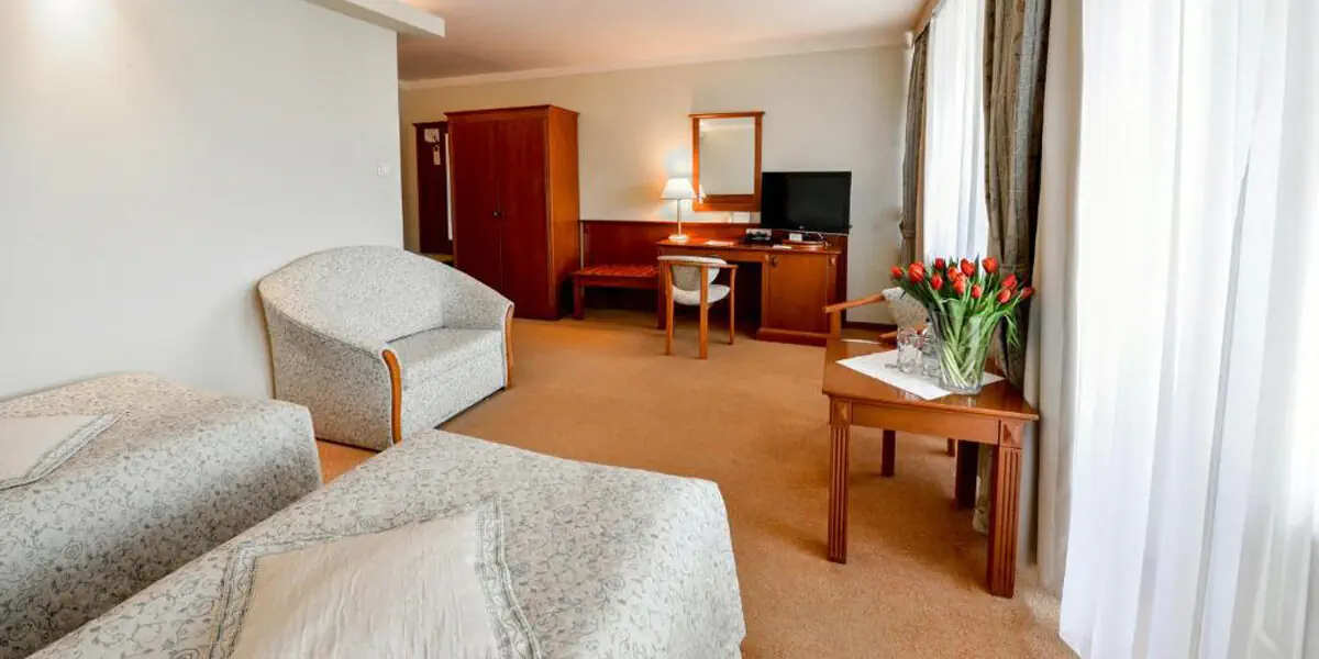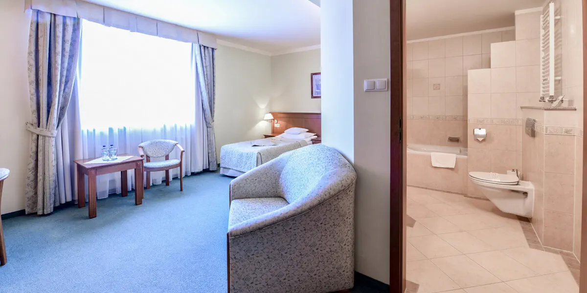 Pokój Standard komfortowo wyposażony wraz z przestronną łazienką, minibar, sejf, TV, Wi-Fi oraz telefon.
