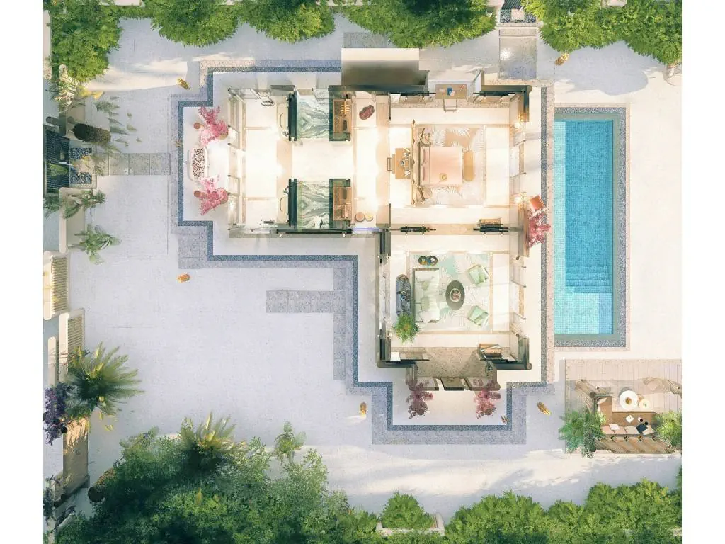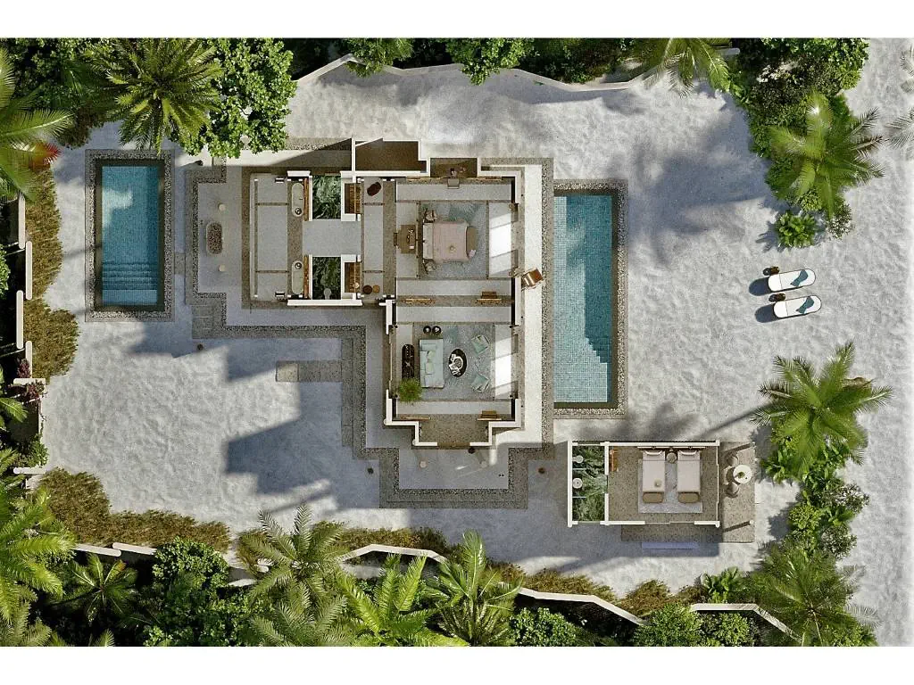 Dla max. 6 osób, Przestrzeń zewnętrzna: Taras, Kanały telewizji: Angielski, Telefon w pokoju, wanna i prysznic , Powierzchnia pokoju: ok. 157 - 865 m2, Dostawka: łóżko standardowe, Rodzaj podłogi: płytki, Sprzątanie codziennie, Salon, miejsce do pracy, 2 sypialnie, Drzwi przesuwne, Maksymalna liczba osób dorosłych: 4, Maksymalna liczba dzieci: 2, Concierge (bezpłatnie), Kwiaty i owoce, Prysznic na świeżym powietrzu, Frontalny widok na plażę, Bezpośredni dostęp do plaży, Prywatny basen, Liczba łazienek: 2, Liczba toalet: 2, Zestaw do parzenia kawy i herbaty, Klimatyzacja: Klimatyzacja indywidualna