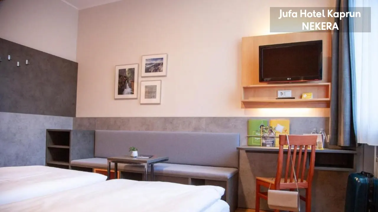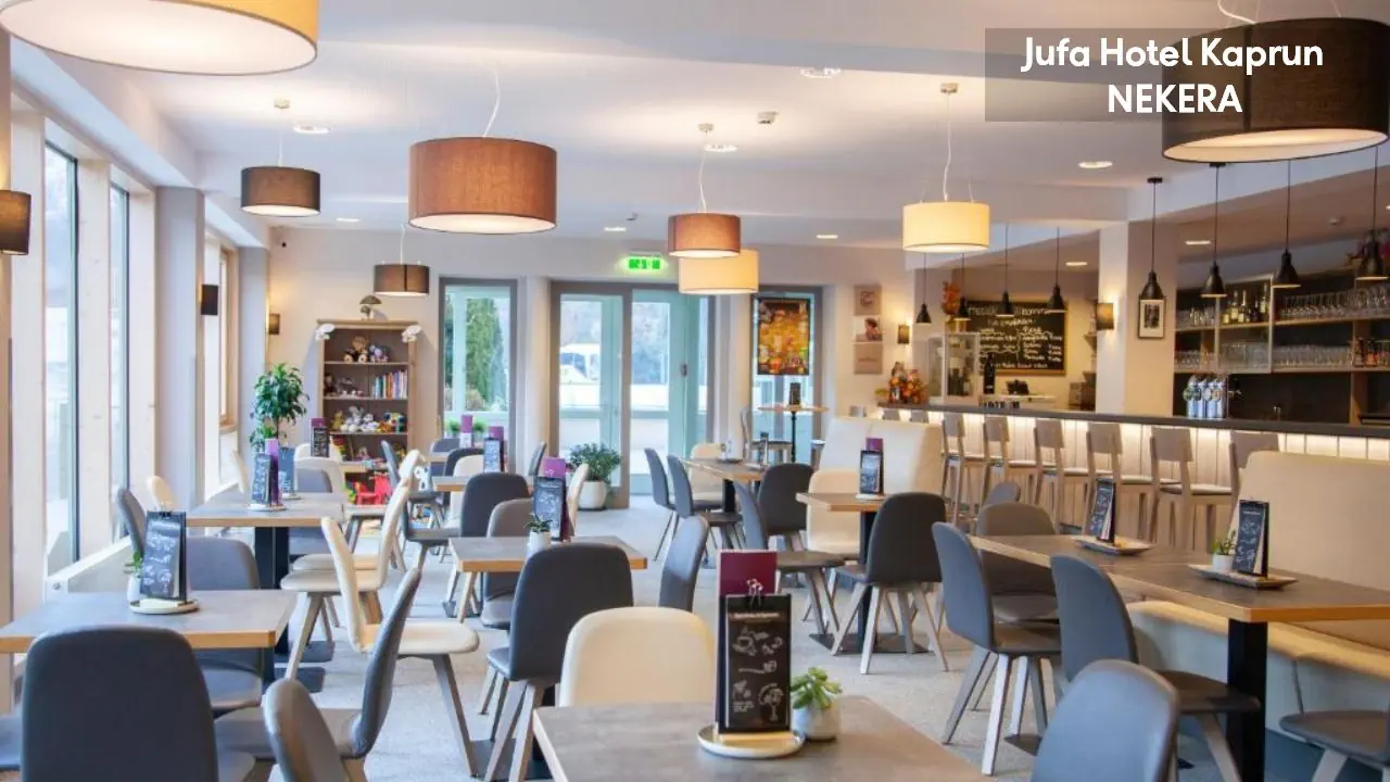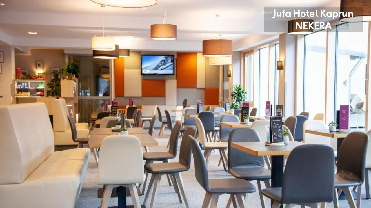 budżetowy hotel Jufa Kaprun składa sie z 66 pokoi, recepcja, lobby, sala konferencyjna, narciarnia, restauracja, bar, taras.