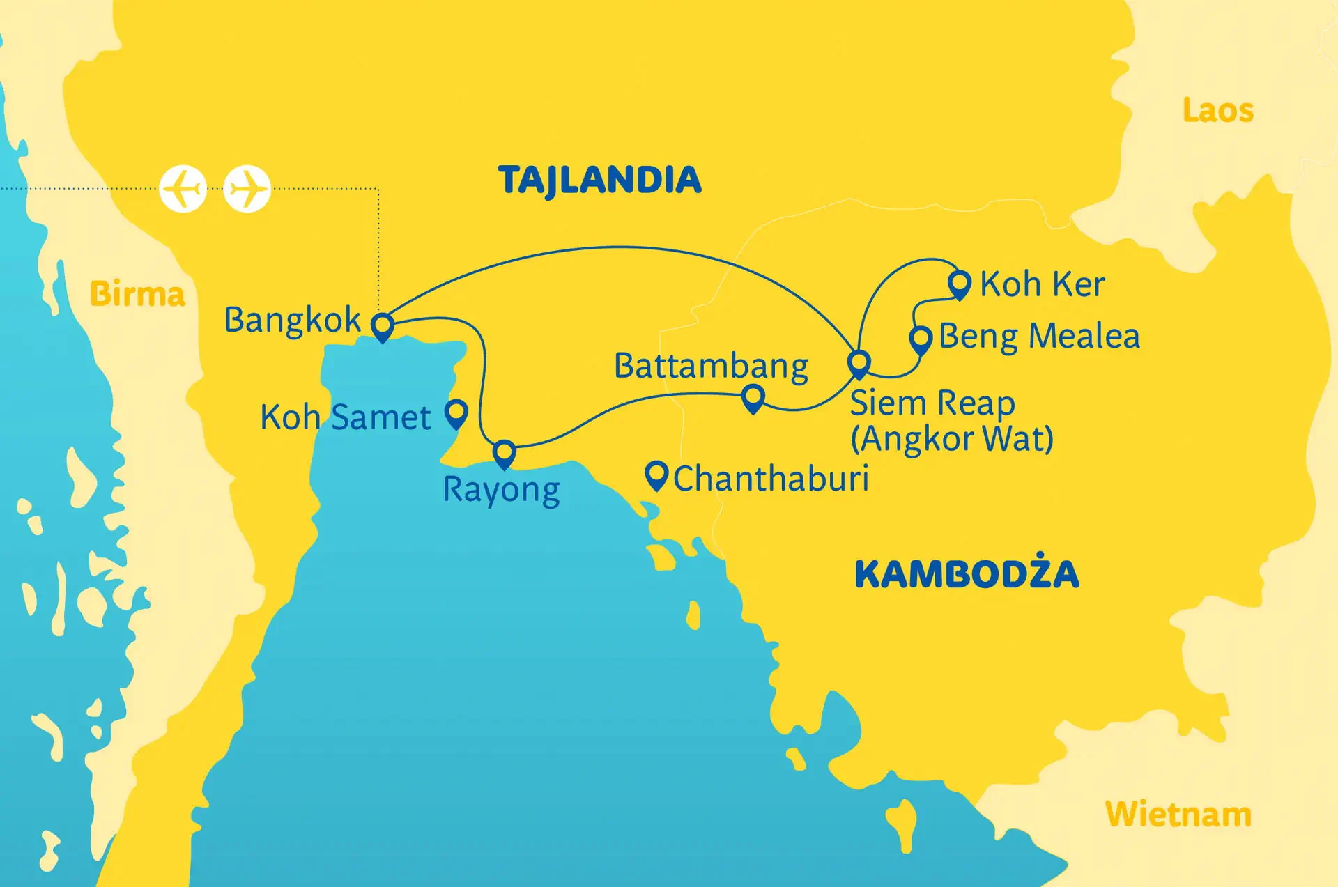 Do dyspozycji gości w hotelach restauracja, bar i w większości hoteli basen Zakwaterowanie Część objazdowa Hotele ***/**** dobrej klasy. Pokoje: we wszystkich hotelach są wyposażone w TV, klimatyzację, łazienki z WC i często mini bar (dodatkowo płatny). Część pobytowa Hotele - opisy poszczególnych hoteli w części dotyczących wczasów w Tajlandii (Jomtien/ Pattaya/Rayong lub Koh Samet).