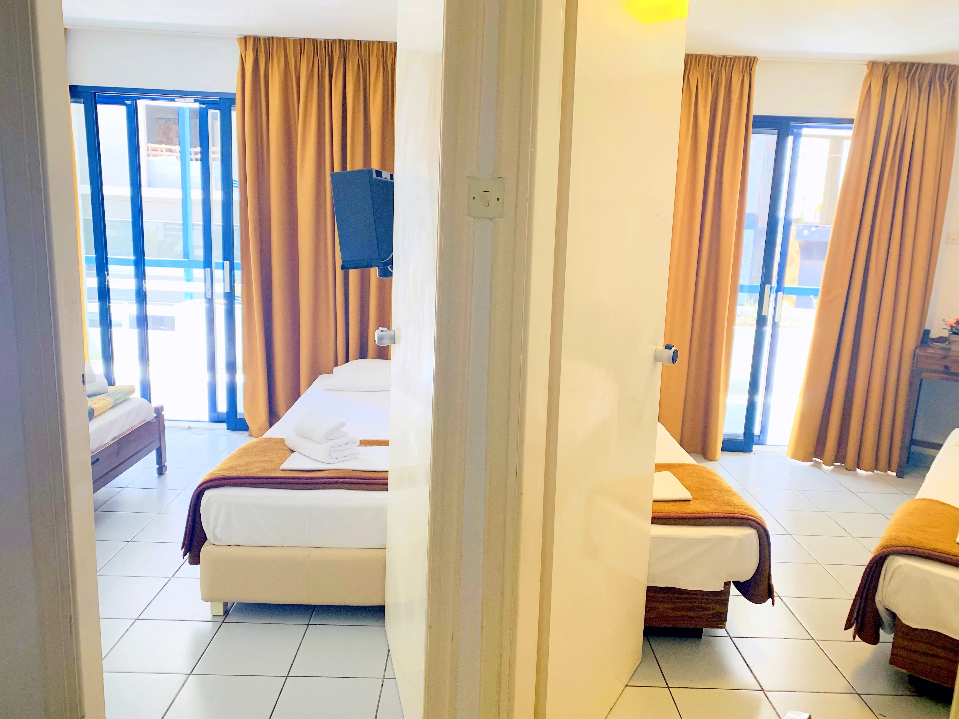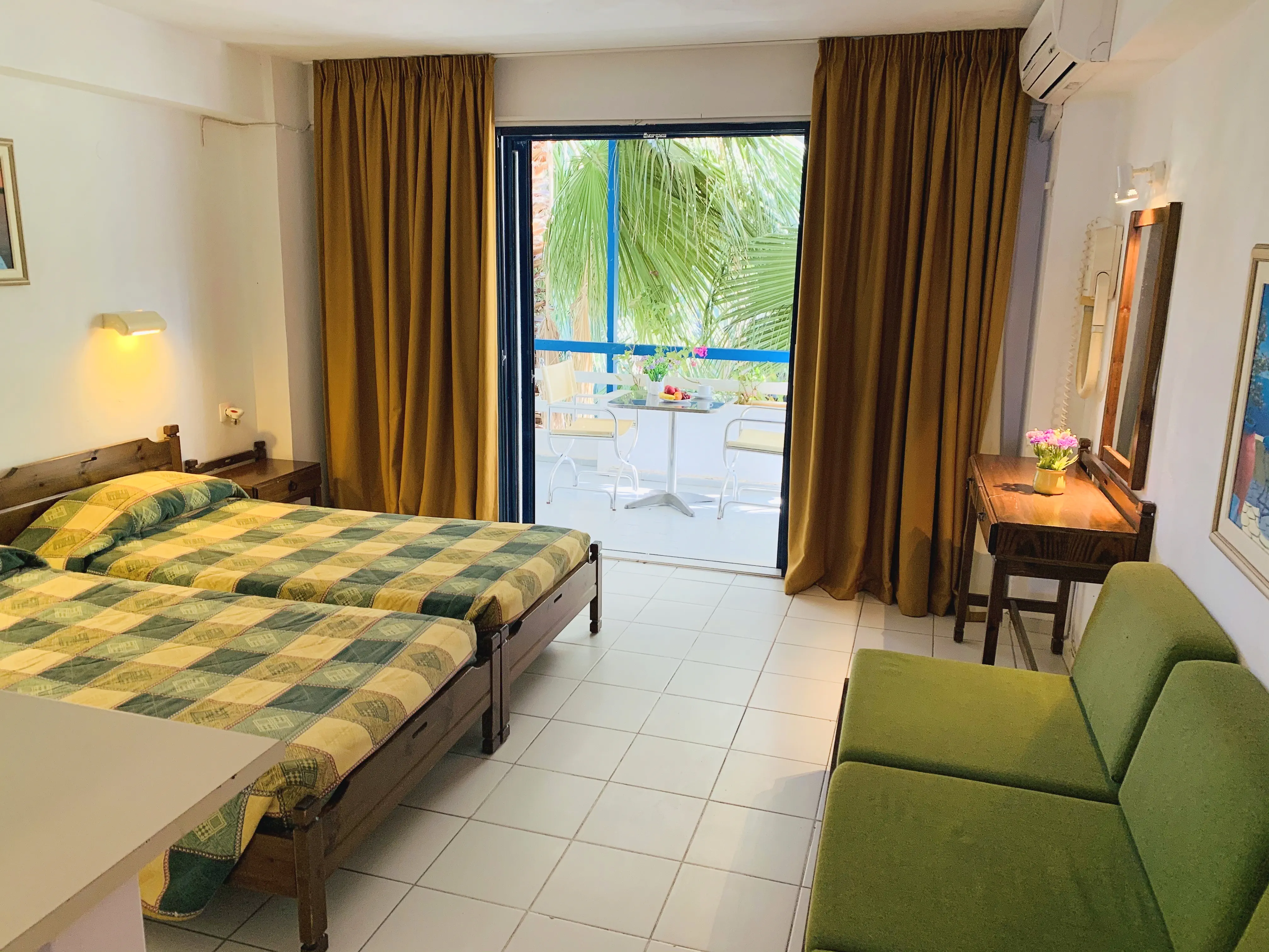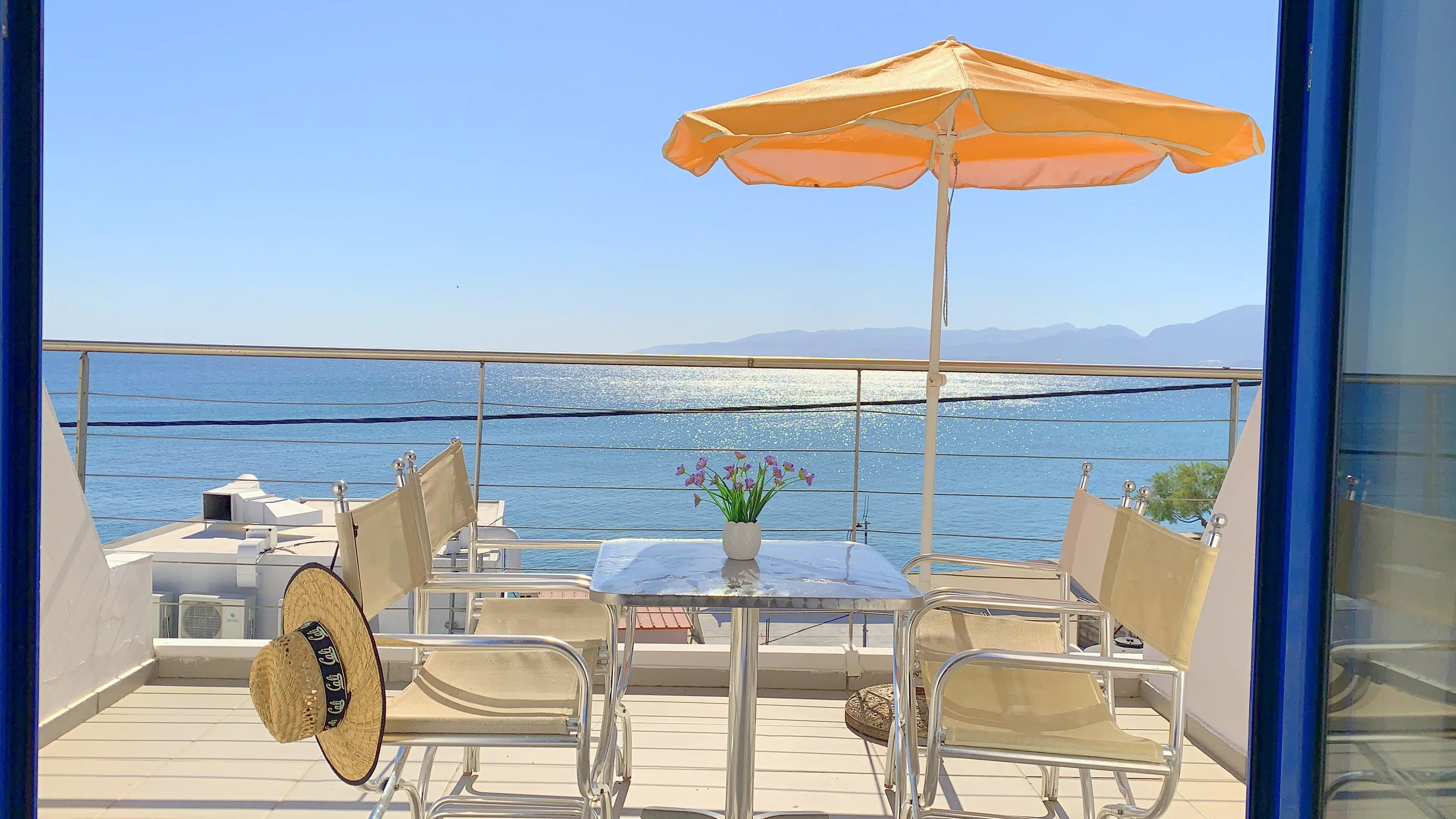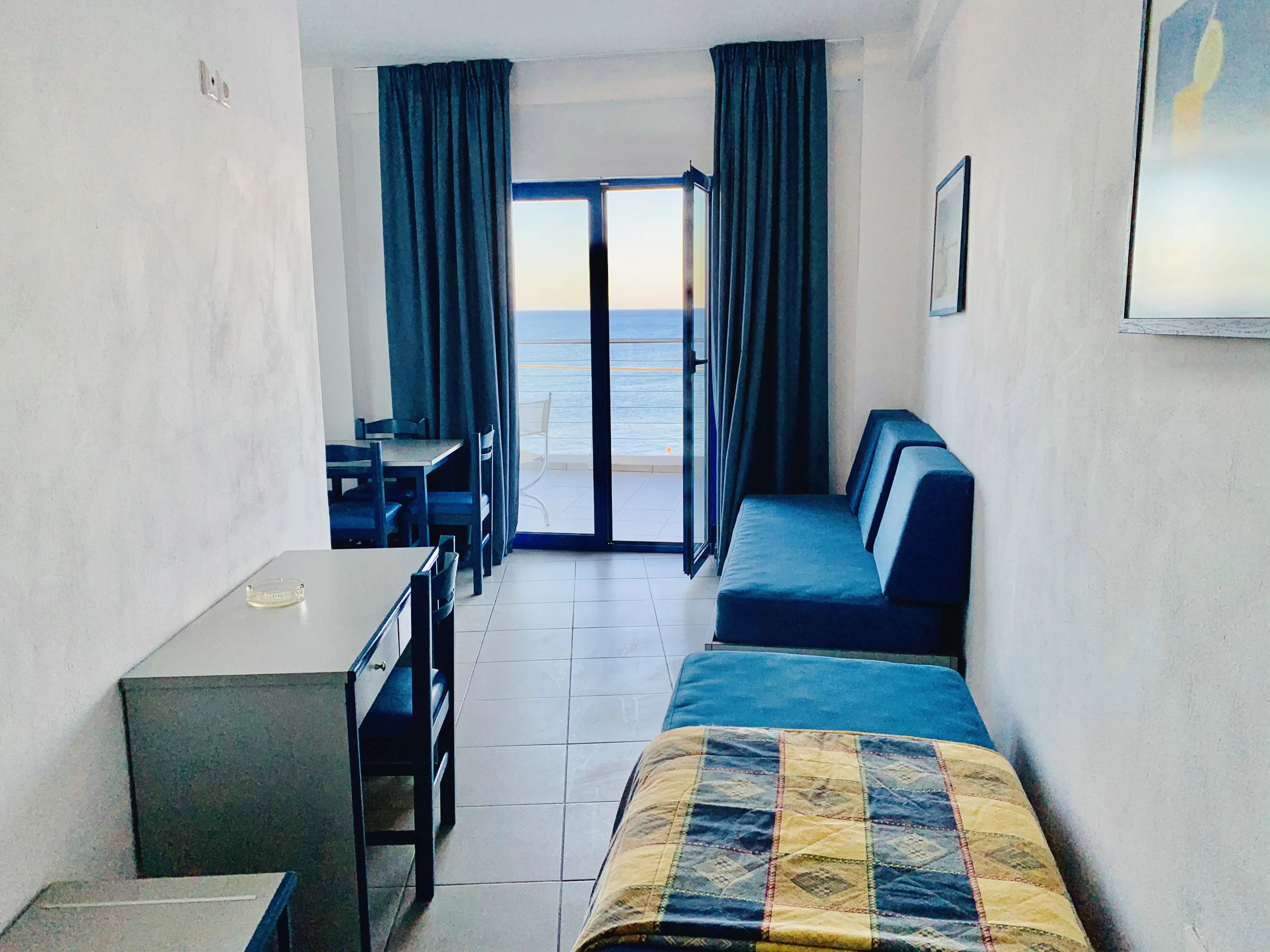 Dla max. 4 osób, Przestrzeń zewnętrzna: Balkon lub taras, Kanały telewizji: Angielski, Aneks kuchenny, prysznic, Powierzchnia pokoju: ok. 33 - 40 m2, Dostawka: sofa, Rodzaj podłogi: płytki, Sprzątanie codziennie, Salon, część jadalniana, 1 sypialnia, Drzwi łączące między pokojami, Maksymalna liczba osób dorosłych: 2, Maksymalna liczba dzieci: 2, Boczny widok na morze,Widok na morze, Liczba łazienek: 1, Liczba toalet: 1, Kuchenka mikrofalowa, Klimatyzacja: Klimatyzacja indywidualna