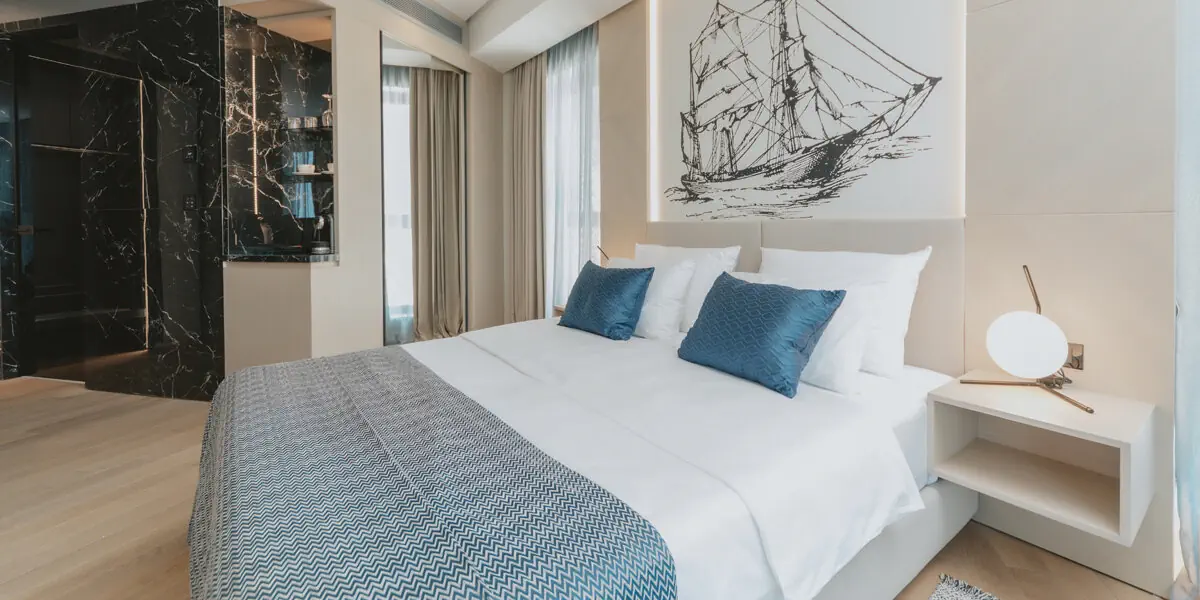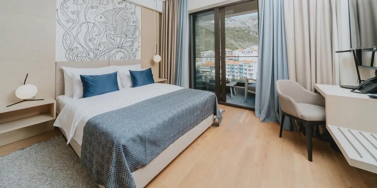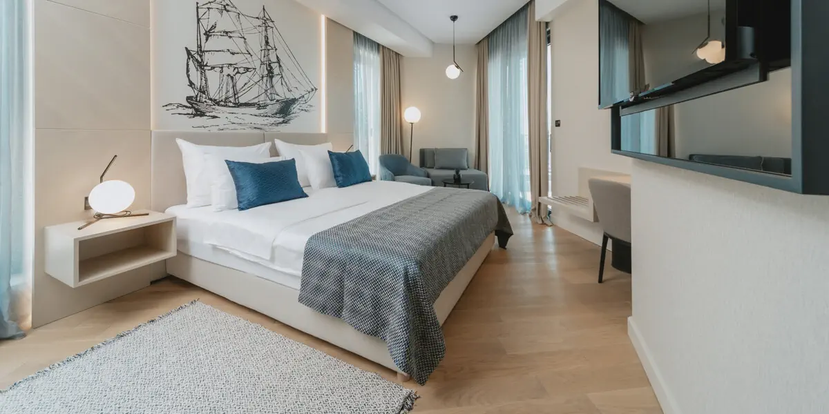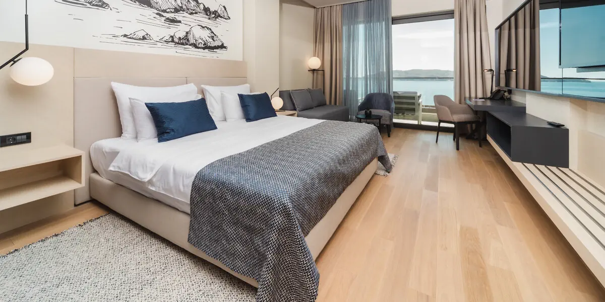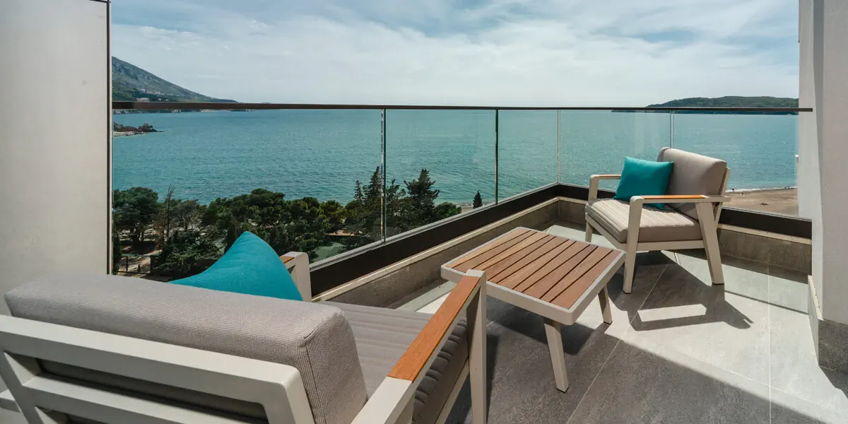 Komfortowy pokój z klimatyzacją, wygodami, łazienką i balkonem z widokiem na morze